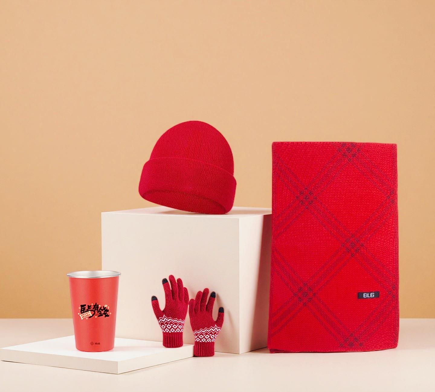 产品材质: 围巾:晴纶+聚酯纤维 帽子手套:聚酯纤维 杯子:304不锈钢 产品规格: 围巾:180*30cm 帽子手套:均码 杯子:350ml