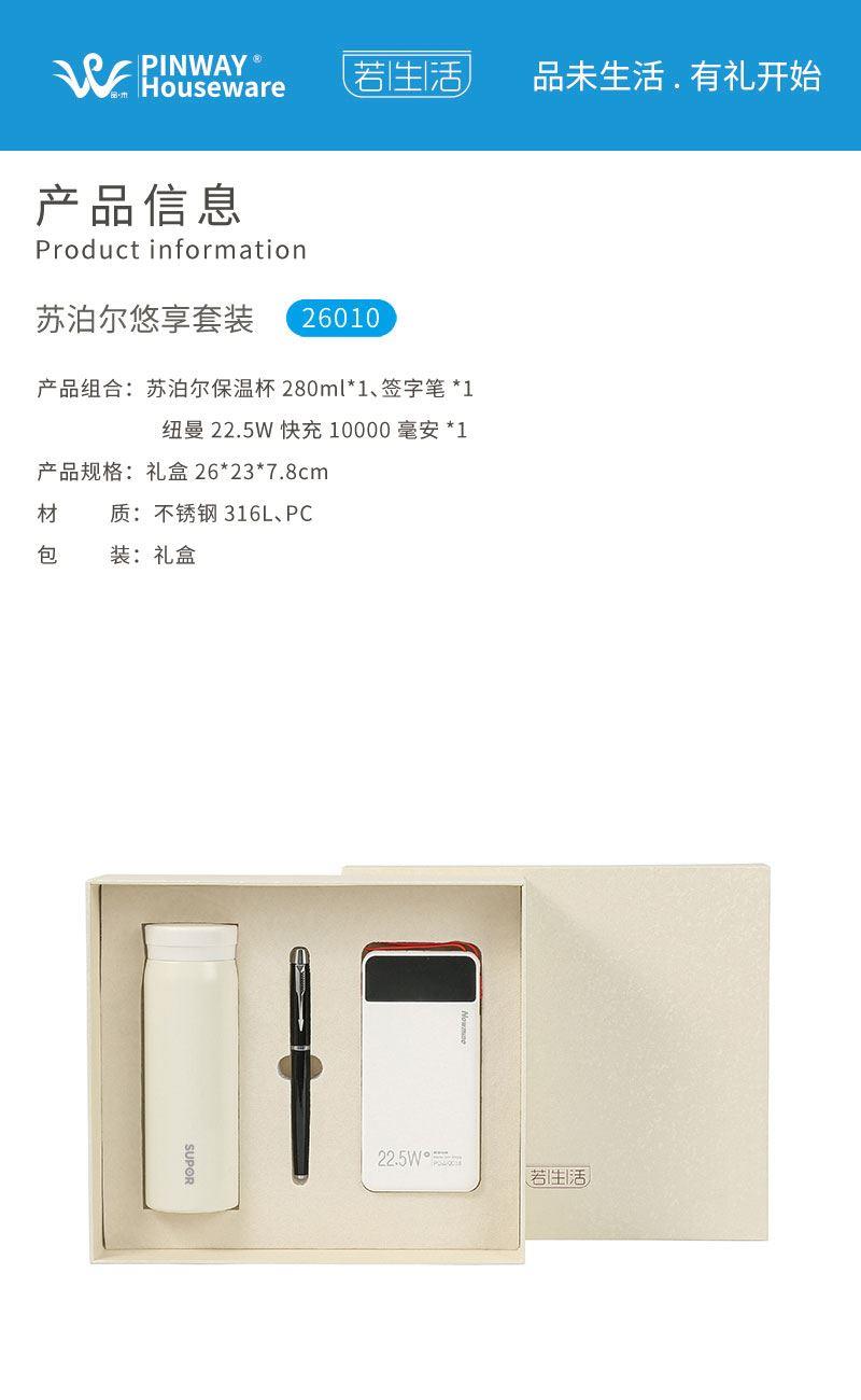 产品组合:苏泊尔保温杯280ml + 签字笔+ 纽曼22.5W快充 10000毫安 产品规格:礼盒26*23*7.8cm 材质:不锈钢316L、PC 包装:精装礼盒