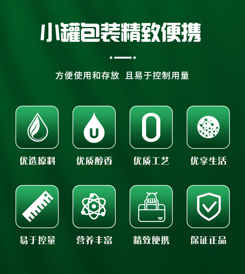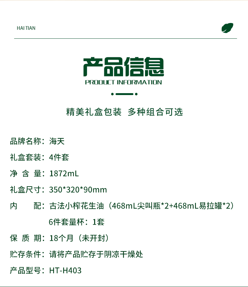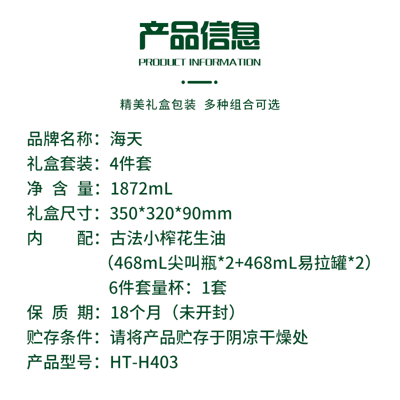净含量:1872mL 内配:古法小榨花生油(468mL尖叫瓶*2+468mL易拉罐*2)6件套量杯*1套 礼盒尺寸:350*320*90mm 推荐理由:员工福利、积分兑换、项目招标 优质花生 颗粒饱满 粒粒精选 原香味浓 物理压榨工艺靠物理压力将油脂直接从原料中分离出来 只榨取第 一道花生原汁 避免化学残留 保鲜技术 恒温保存