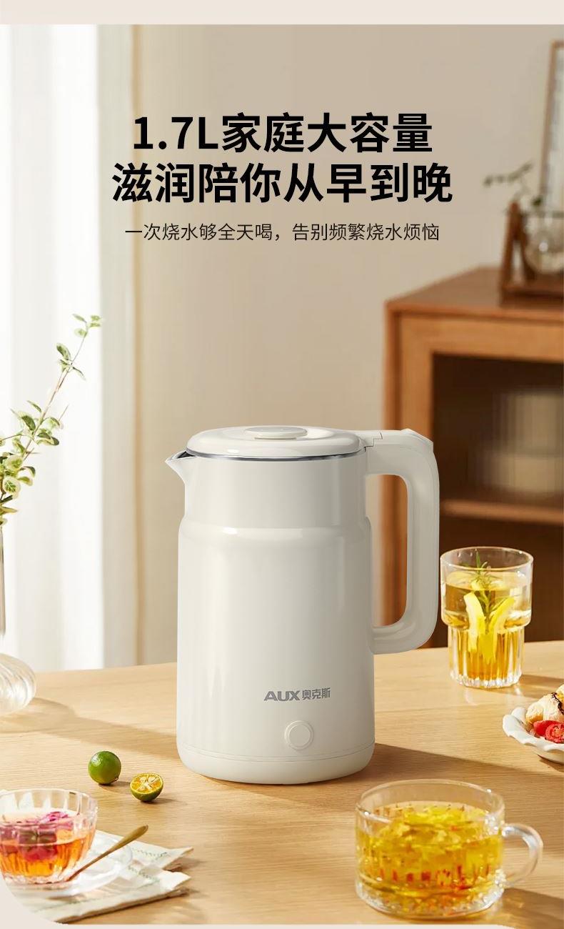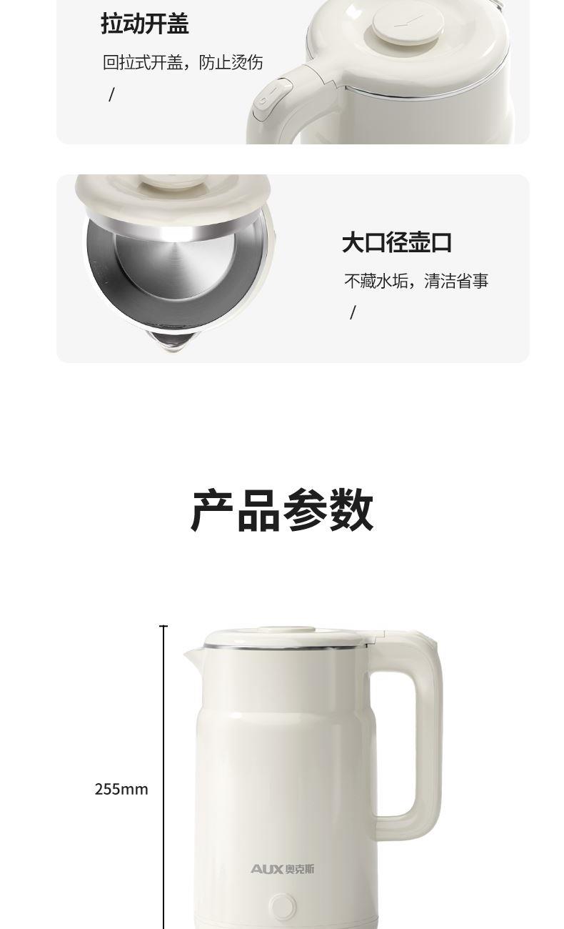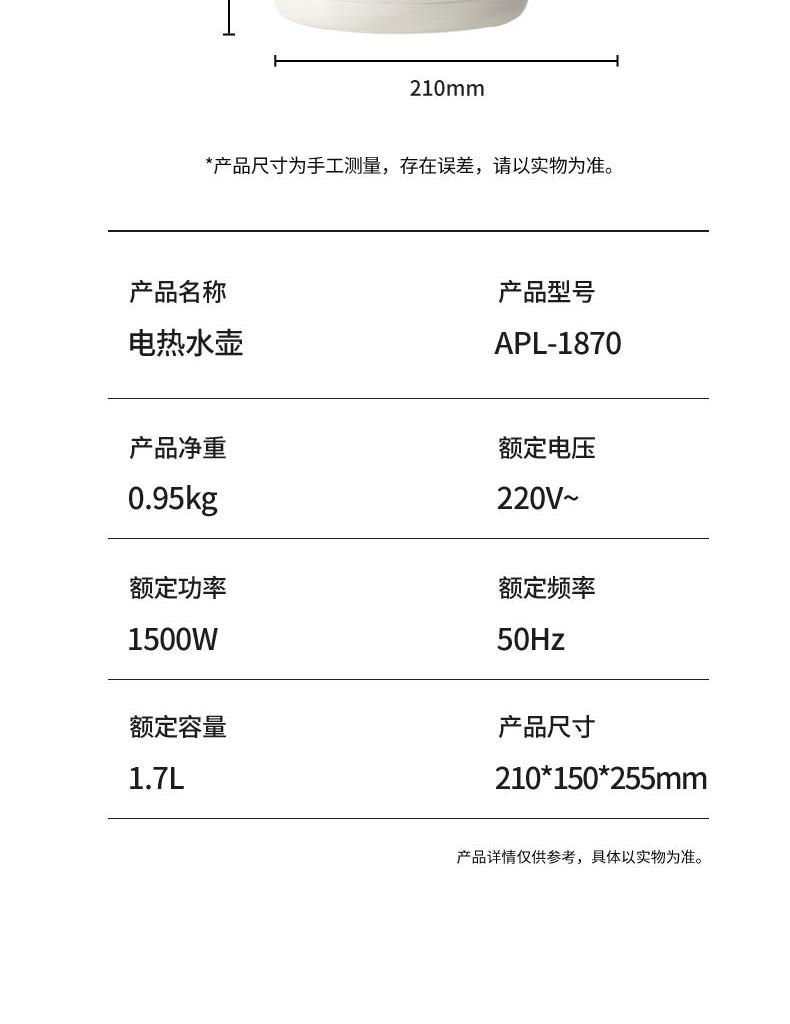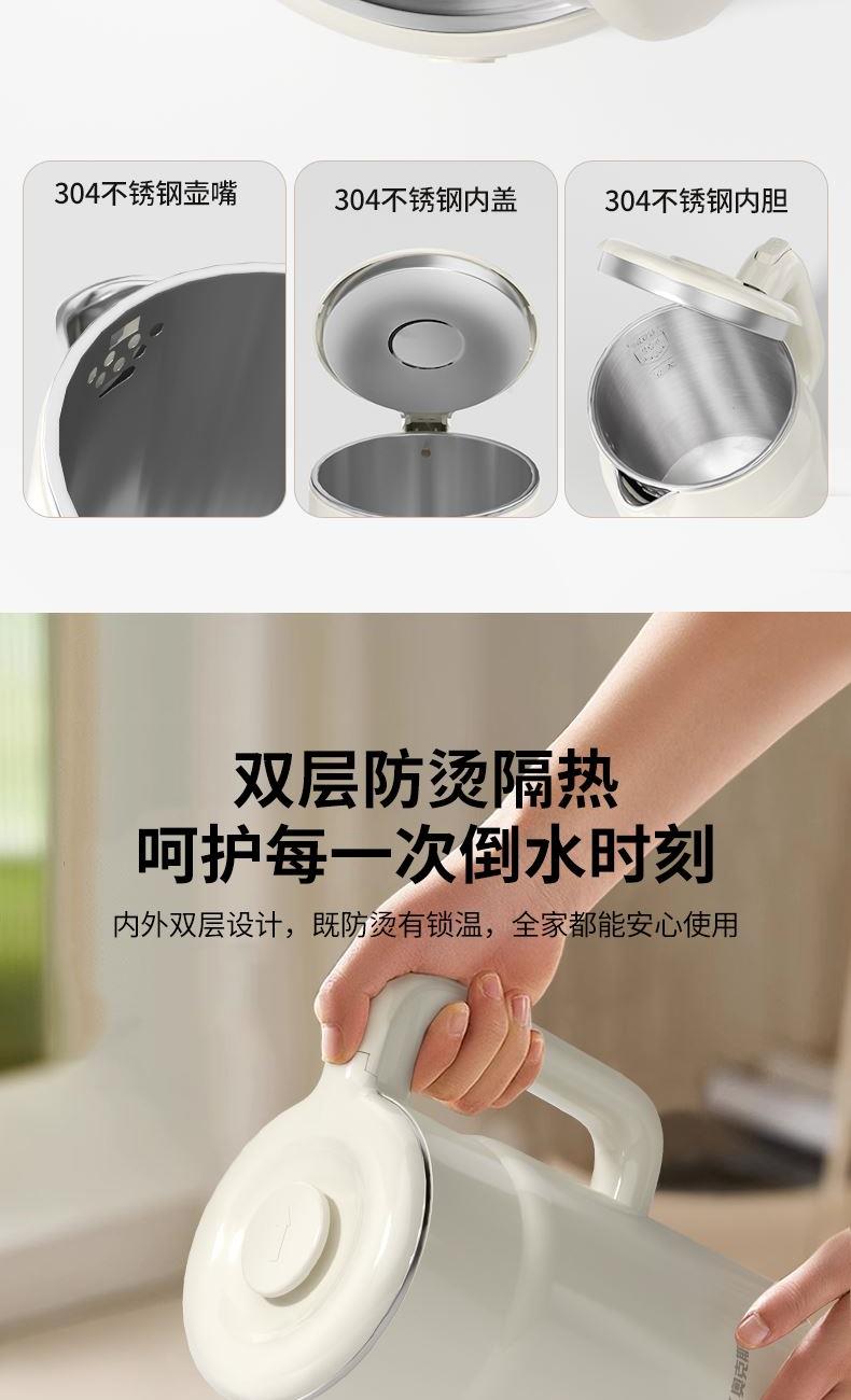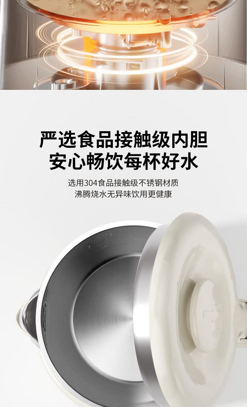 额定电压:220V~ 额定功率:1500W 额定频率:50Hz 材质:内胆材质:304不锈钢,杯盖:304不锈钢,外壳:PP 食品级304不锈钢内身,健康饮水无异味 双层隔热防烫手,给予贴心呵护 1500W聚能速热,冲泡不久等 大广角一键开盖,口径大易清洁 1.7L大容量,满足一天饮水需求