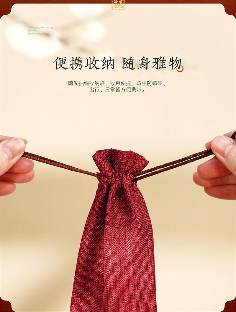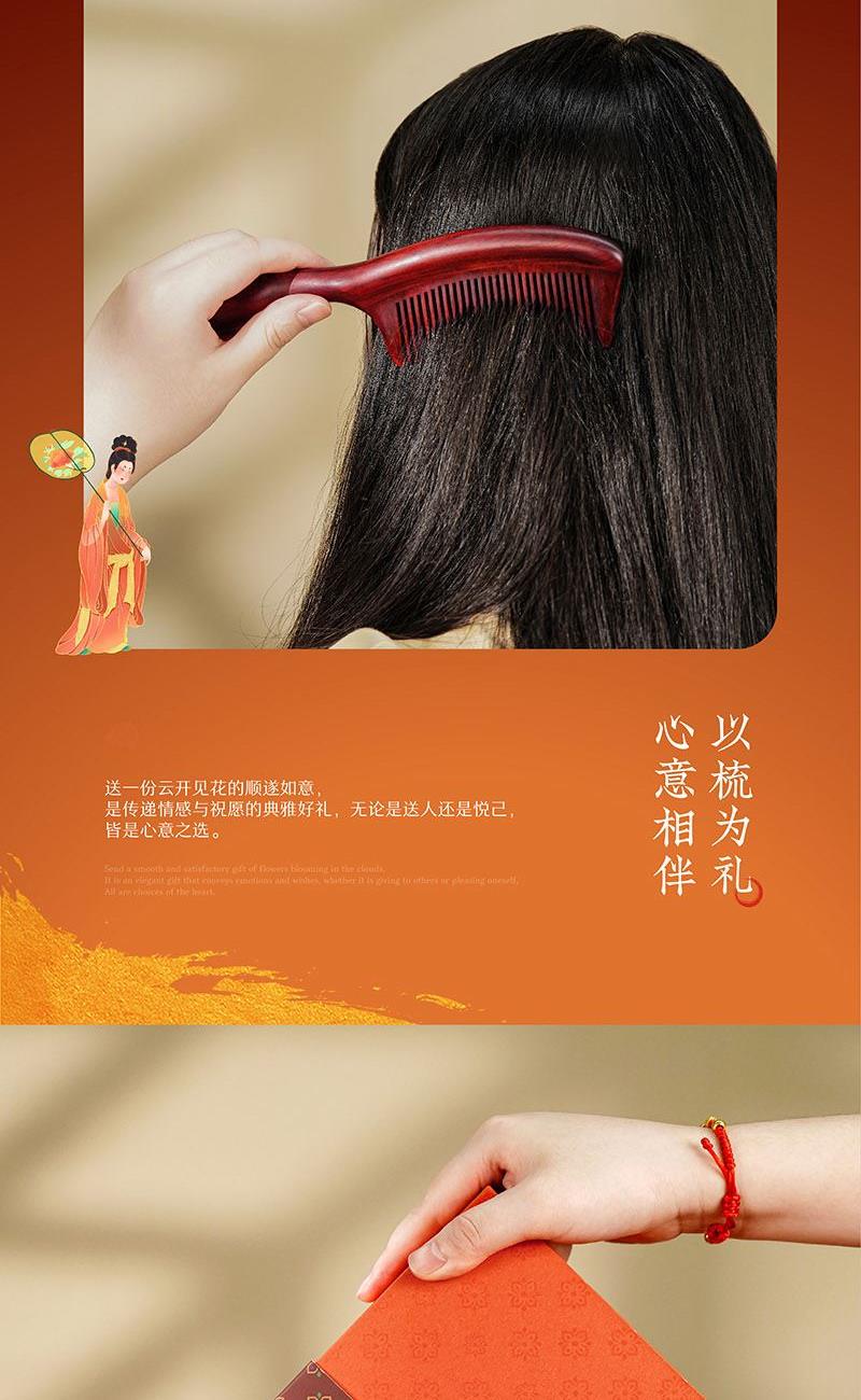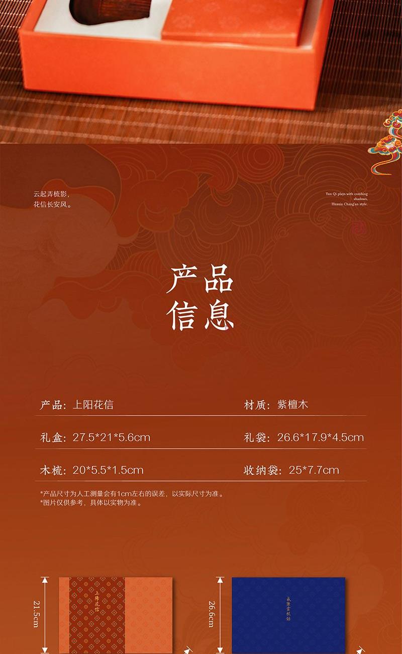 产品清单 木梳*1 收纳袋*1 礼盒*1 礼袋*1 产品 / Product Mini 上阳花信 材质 / Material 紫檀木 规格 / Size 礼盒:27.5*21*5.6cm 礼袋:26.6*17.9*4.5cm 木梳:20*5.5*1.5cm 收纳袋:25*7.7cm *产品尺寸为人工测量会有1cm左右的误差,以实际尺寸为准