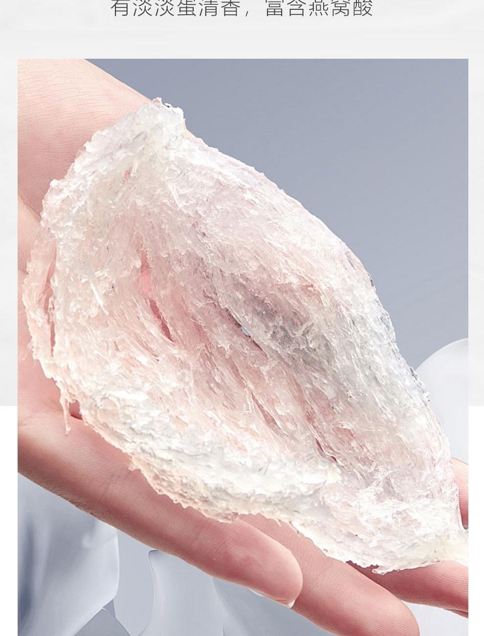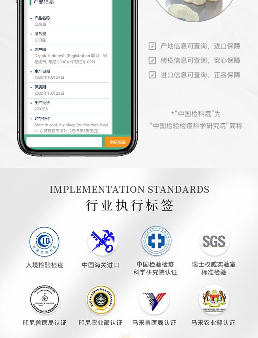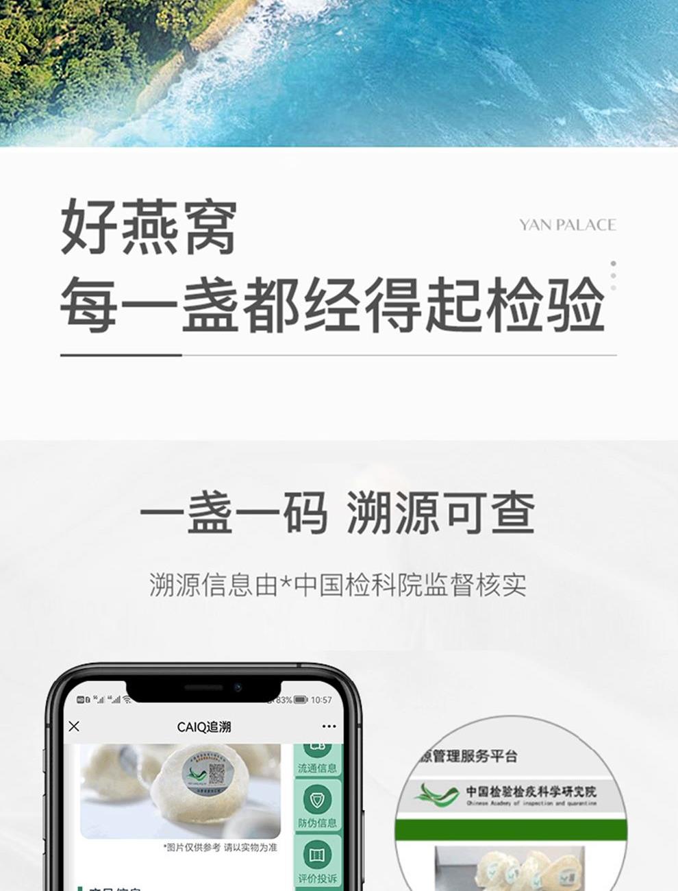 规格:溯源中盏100克(14-17盏) 卖点: 1、一盏一码,溯源可查,品质有保障。 2、不刷胶,不补碎,泡发率高达8-10倍。 3、99.9%洁净度,足干足称,不为一滴水分买单。 4、节省时间、免泡发燕盏省去了泡发的时间,可以开始炖煮。 5、免泡发燕盏的加工过程更加标准化,品质更加稳定。