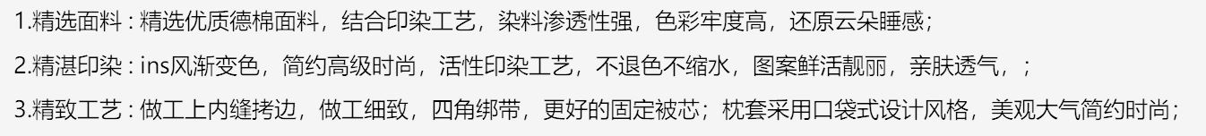 货 号 :HLX-TJ24-19 面 料 :德棉(100 %聚酯纤维) 规 格 :被套200*230cm 床单230*250cm 枕套48*74cm*2 包装尺寸 :41x32x11cm 装 箱明细 :17套 /箱 1.精选面料 : 精选优质德棉面料,结合印染工艺,染料渗透性强,色彩牢度高,还原云朵睡感; 2.精湛印染 : ins风渐变色,简约高 级时尚,活性印染工艺,不退色不缩水,图案鲜活靓丽,亲肤透气,; 3.精致工艺 : 做工上内缝拷边,做工细致,四角绑带,更好的固定被芯;枕套采用口袋式设计风格,美观大气简约时尚;