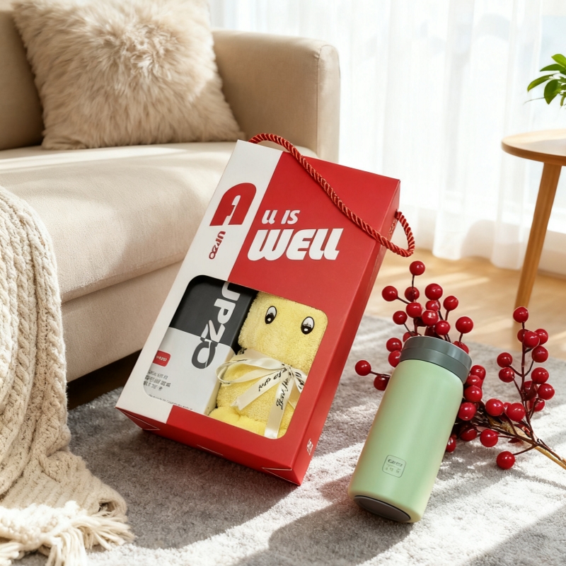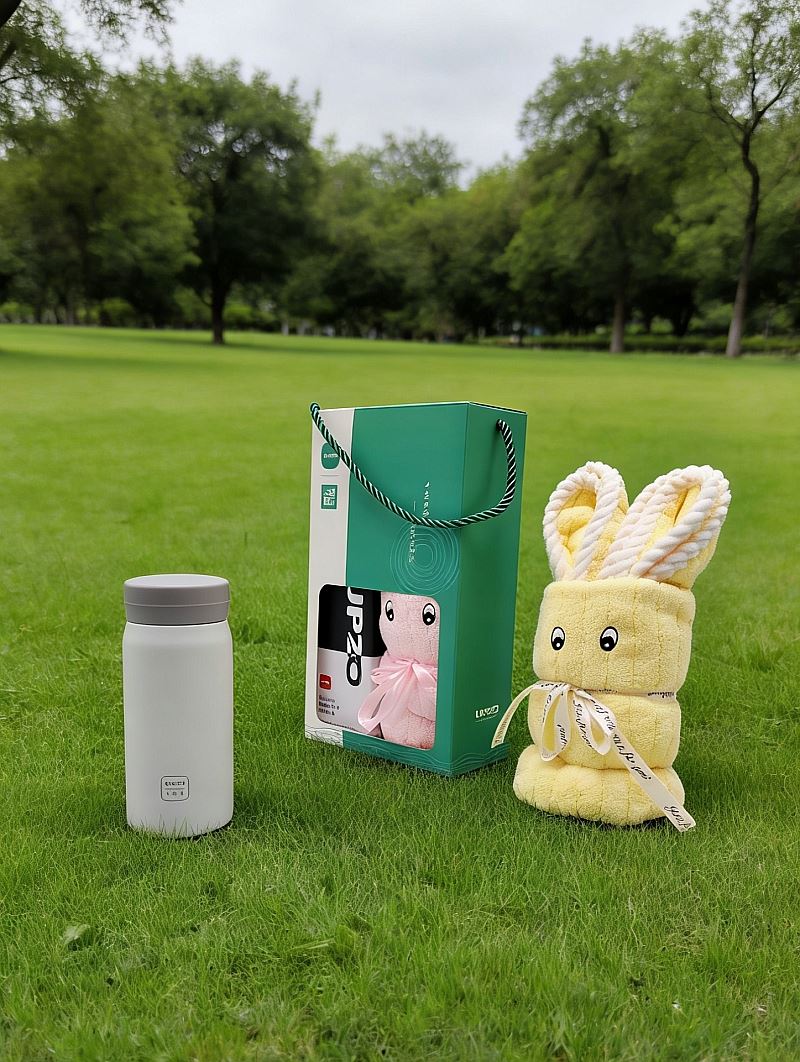 型号: A22B13 产品内容 1、 欢喜小兔毛巾×1 35*75CM 平方克重300克 精致包边工艺 2、 小确幸口袋杯×1 304内胆 PP杯盖 200毫升容量 外盒: 25×14×7cm 欢喜小兔大毛巾 升级精美包边 波浪纹面料 小确幸主题杯 设计融入祝福语 产品撞色搭配 时尚美观