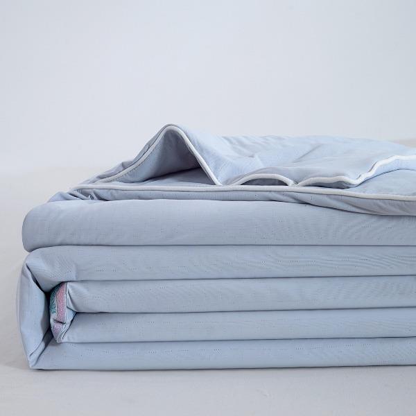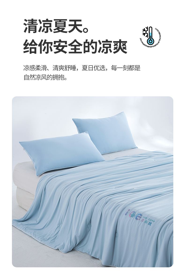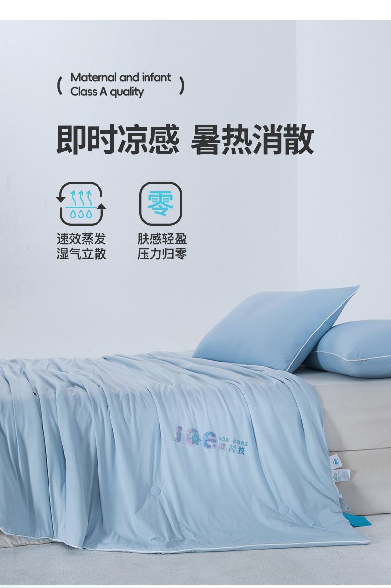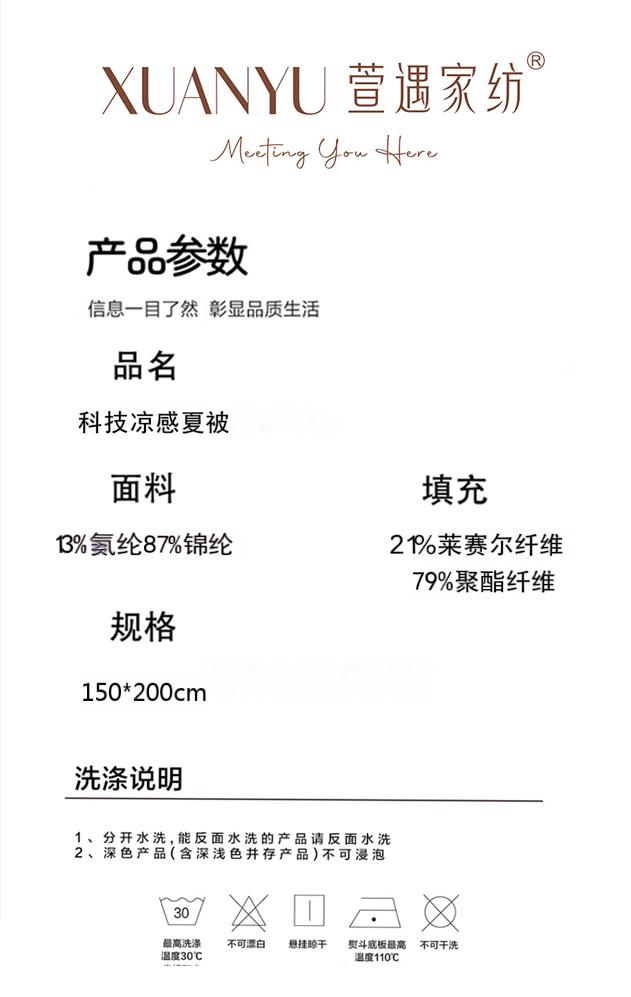尺寸:150*200cm 面料:13%氨纶+87%锦纶 填充:21%莱赛尔纤维+79%聚酯纤维 执行标准:GB/T22796-2021 安全类别:GB18401-2010 B类 1.面料采用87%锦纶+13%氨纶混纺,柔软亲肤、高弹贴身,不易起皱变形,顺滑如丝,透气不闷 2.填充为79%聚酯纤维+21%莱赛尔纤维,结合聚酯纤维的蓬松保暖与莱赛尔的天然透气,轻盈蓬松,吸湿透气,四季适用。 整体柔软细腻,贴身不压身,兼具舒适感与实用性。