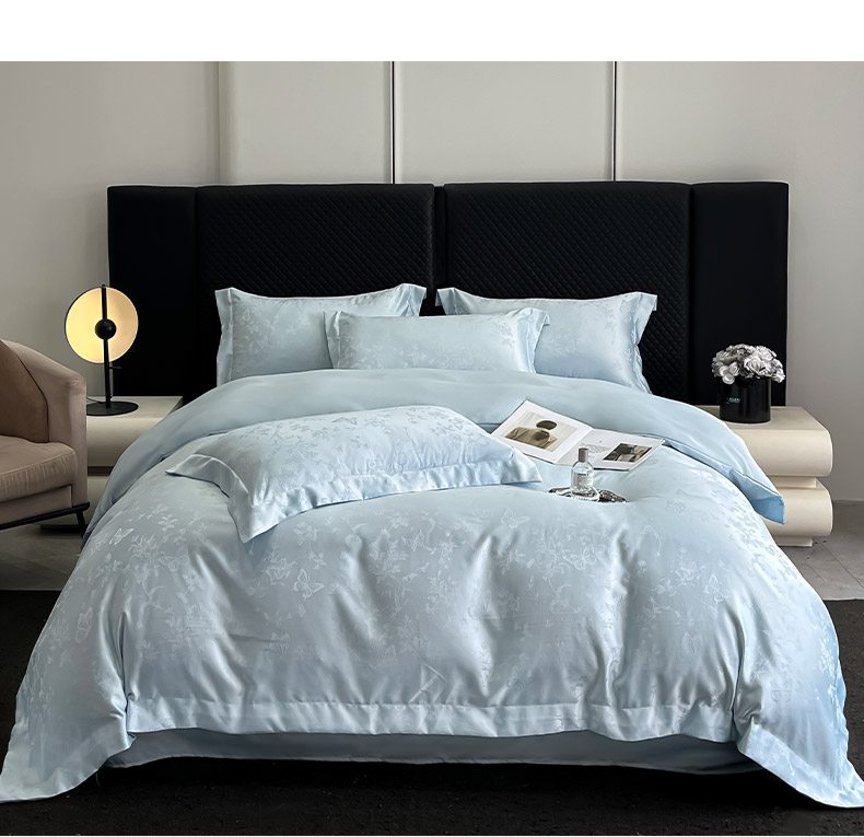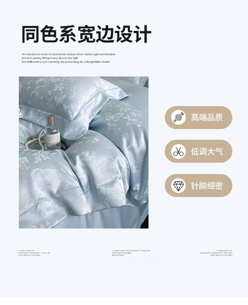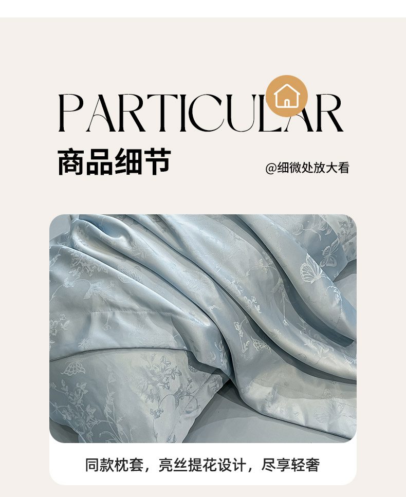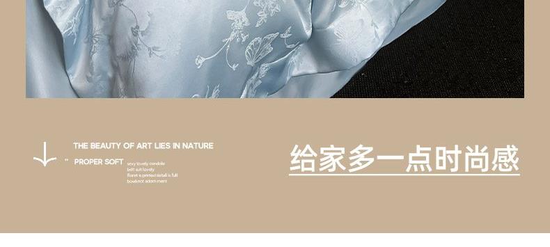如水般的柔滑触感 游走于肌肤之上 时尚提花设计除尘脱俗 颠覆千篇一律 匠心造物 同色系 宽边设计 低调大气 针脚细密 AB双版设计 带来不一样的视觉体验 给床品增添 层次 愈睡愈爱