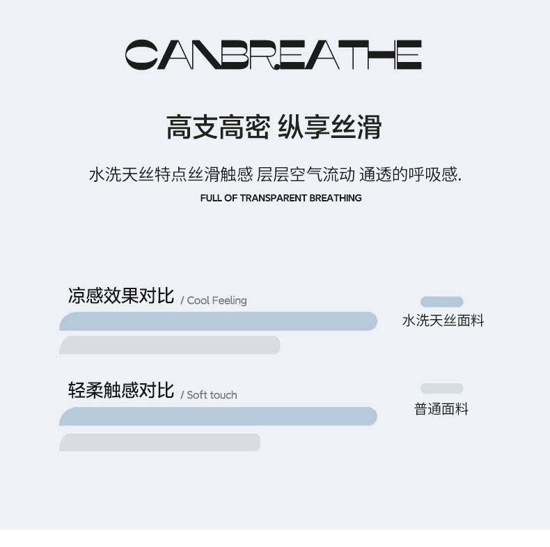 自在消暑 清凉质感 构筑舒爽盛夏 触肤即凉 抚平你的夏日焦躁 触手生凉 丝滑有垂感 自带柔和的光泽感 水洗天丝特点丝滑触感 层层空气流动 通透的呼吸感
