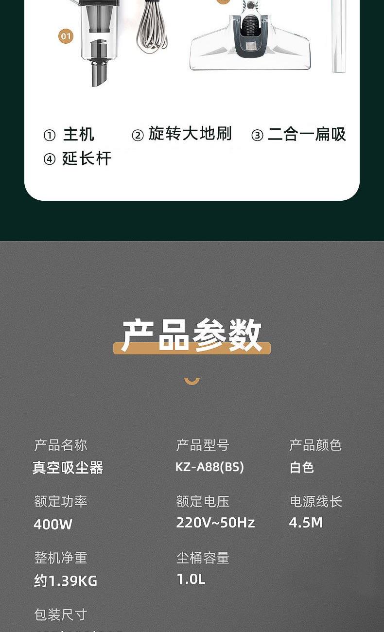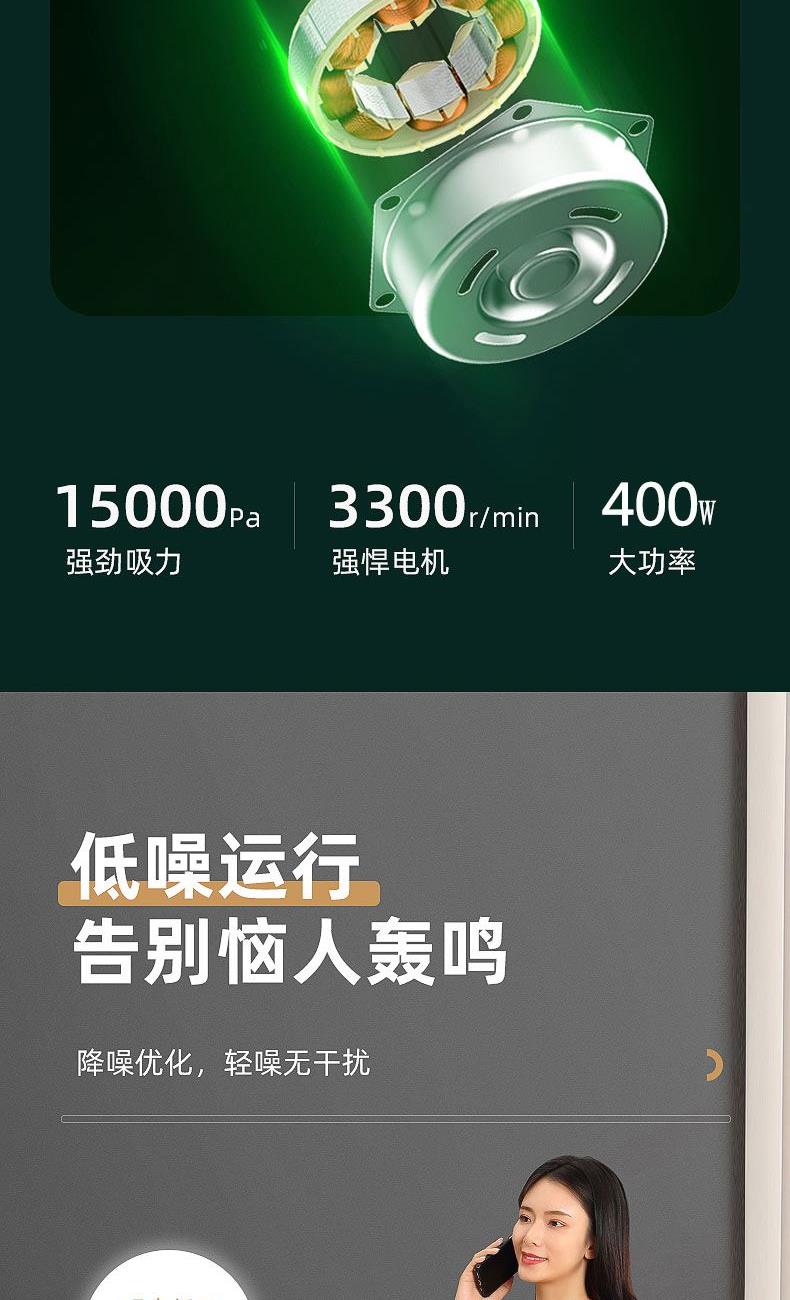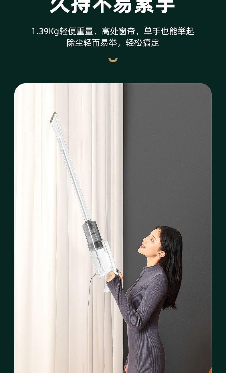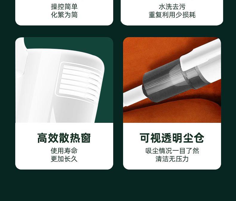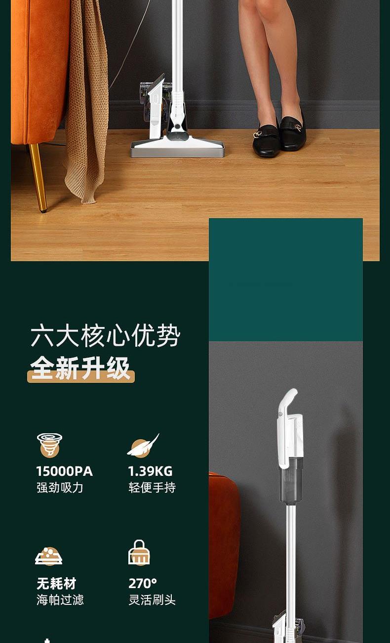 功率:400W 额定电压:220V 集尘容量1.0L 整机净重:约1.39KG 包装尺寸:495*180*205mm 15000PA强劲吸力 1.39kg轻便手持 海帕过滤无耗材 270°灵活刷头 机身小巧,轻松收纳 70dB低噪音