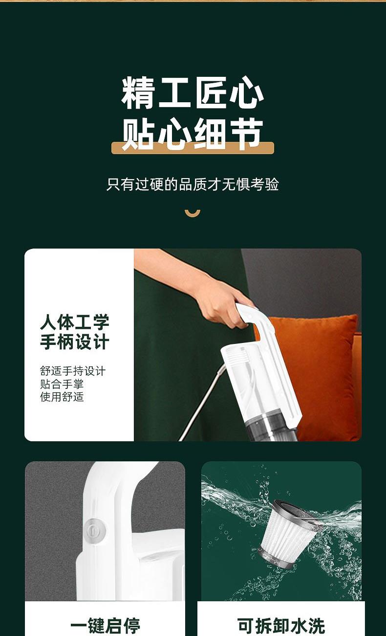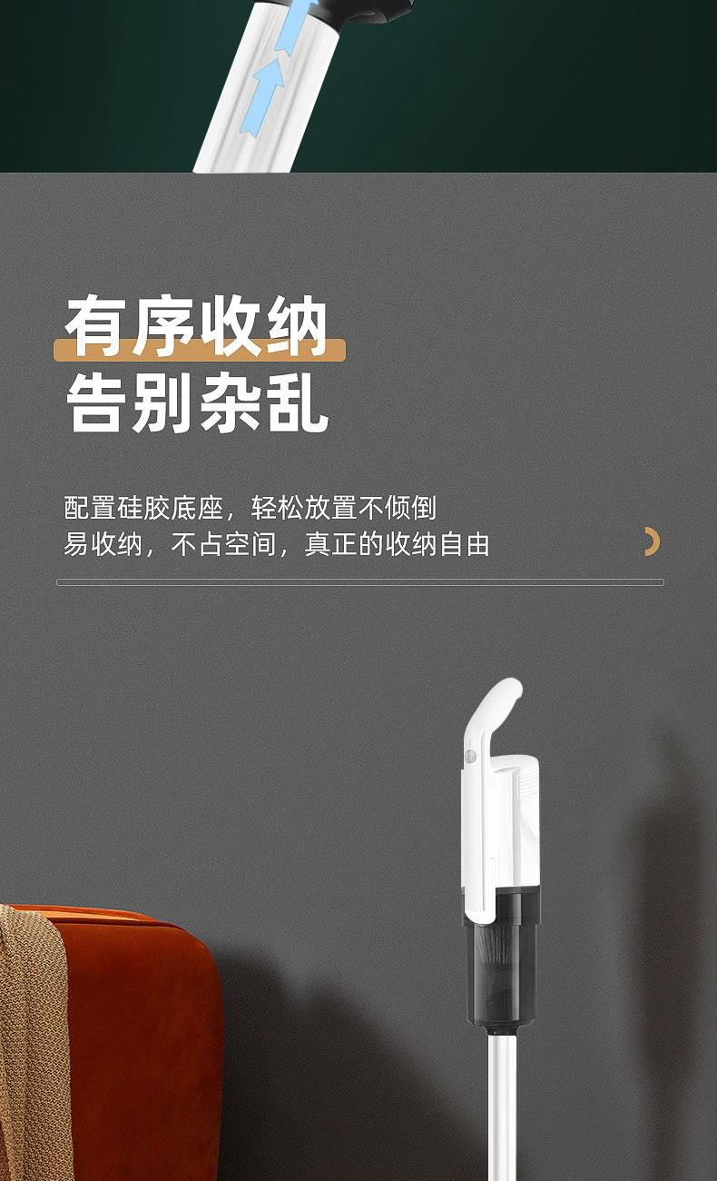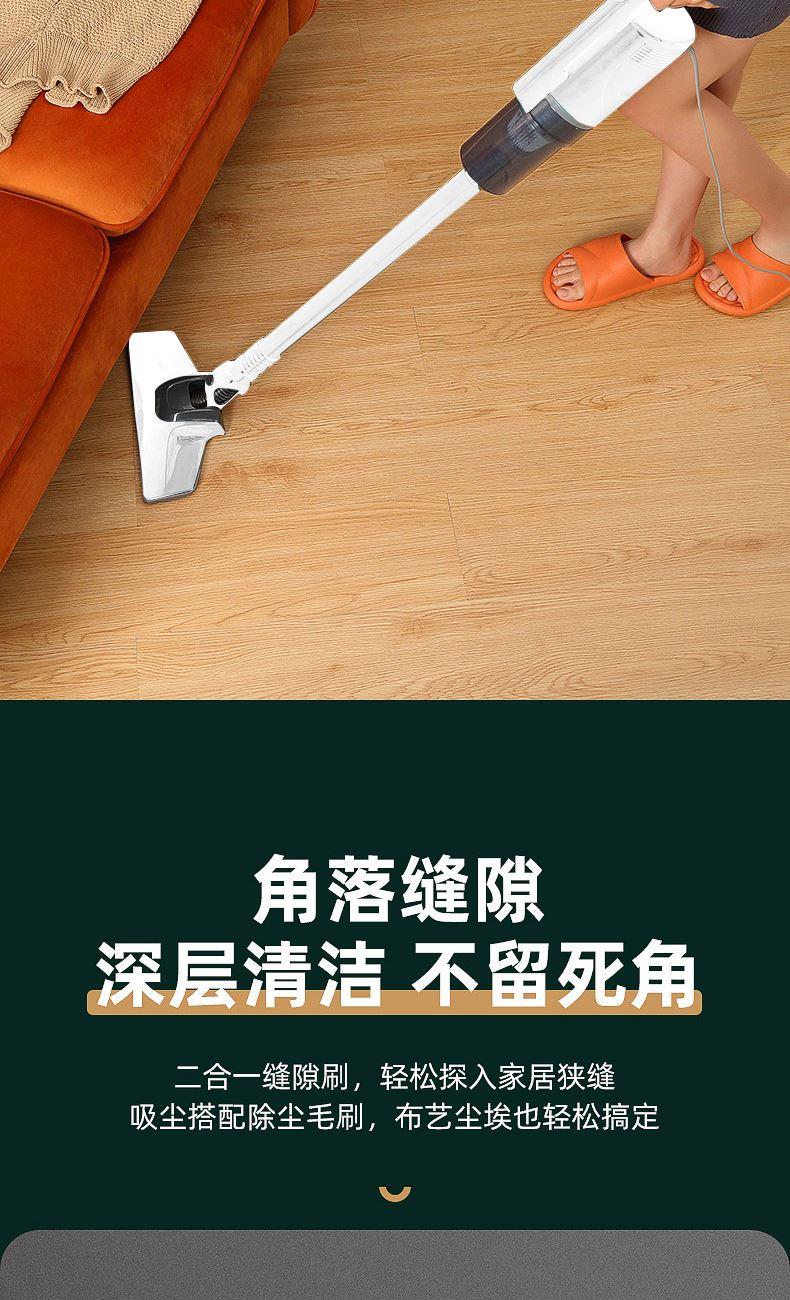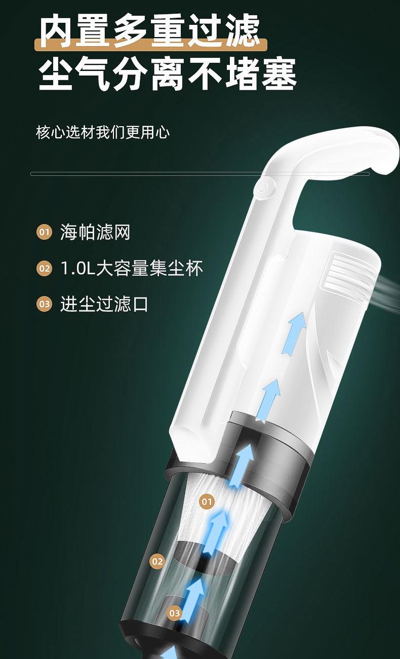 功率:400W 额定电压:220V 集尘容量1.0L 整机净重:约1.39KG 包装尺寸:495*180*205mm 15000PA强劲吸力 1.39kg轻便手持 海帕过滤无耗材 270°灵活刷头 机身小巧,轻松收纳 70dB低噪音
