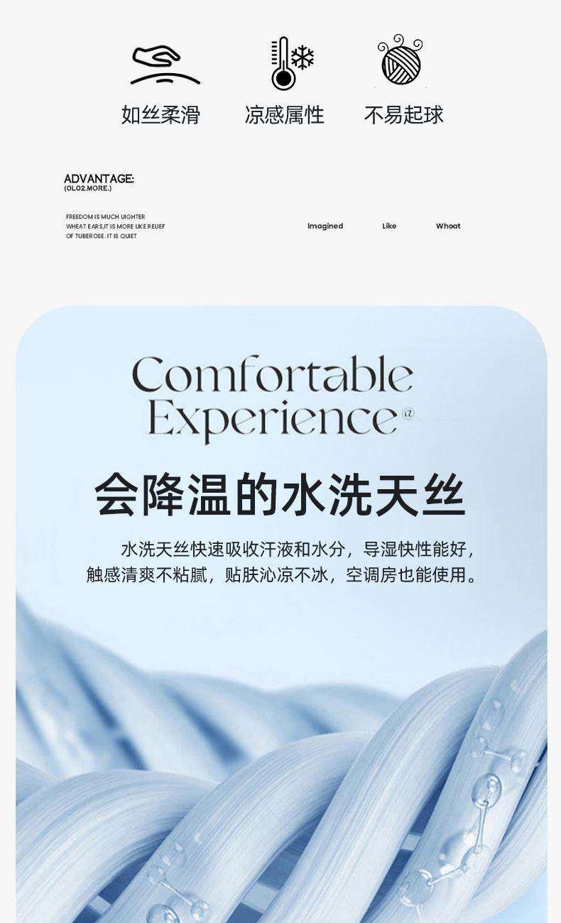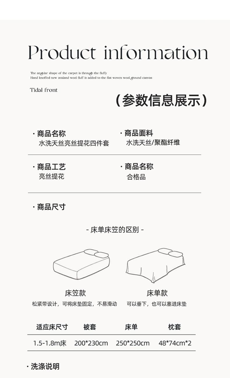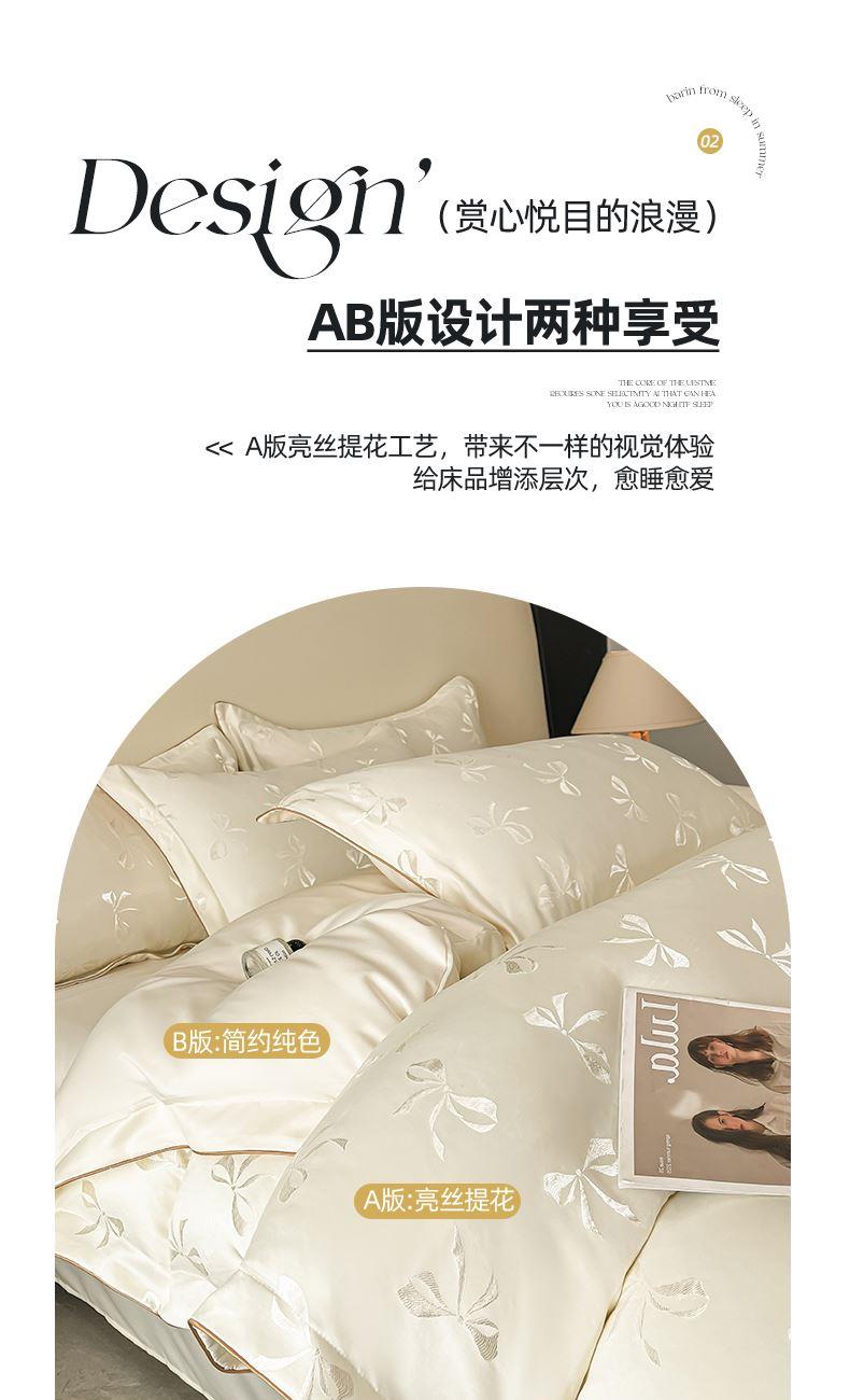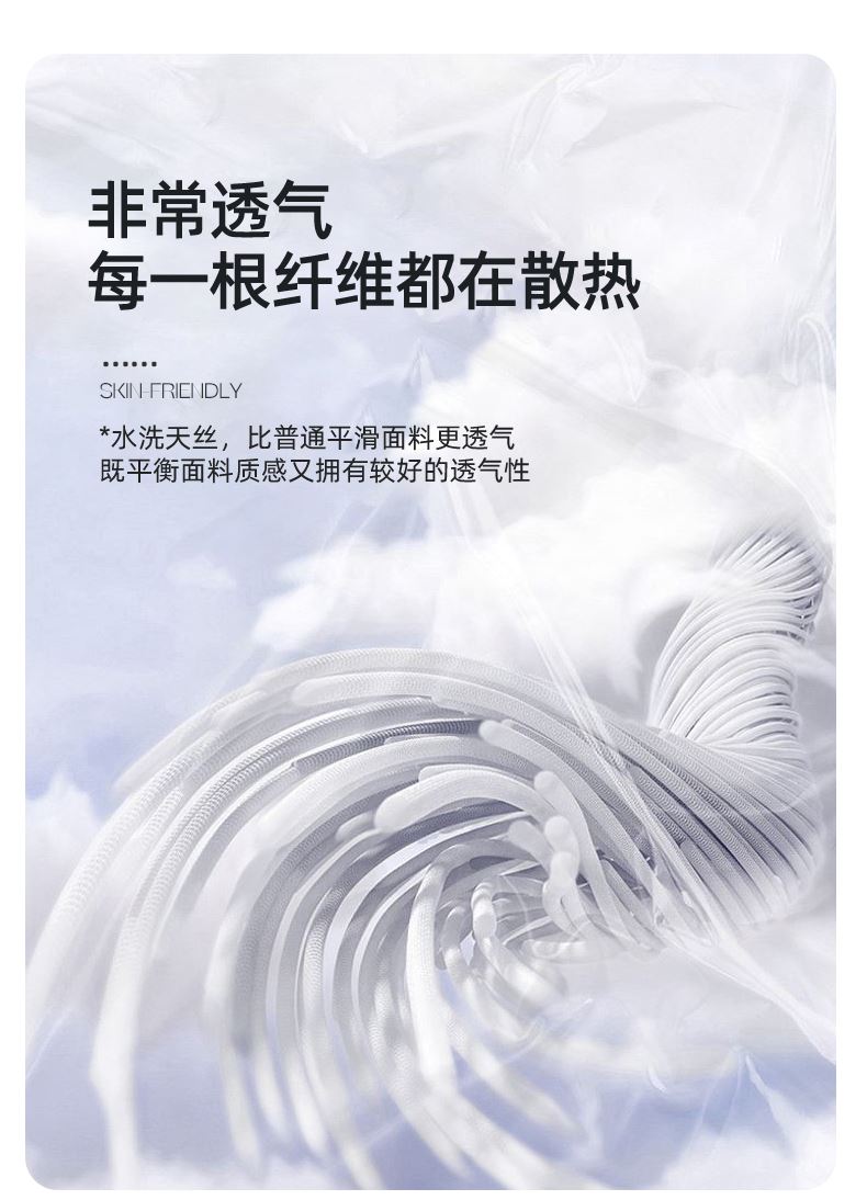 规格:被套200*230cm*1床单245*245cm*1枕套48x74cm*2 面料:聚酯纤维(水洗天丝) 花色:雅蝶-白、雅蝶-薄荷绿、雅蝶-粉、雅蝶-灰、雅蝶-蓝 闭眼感受 丝滑触感 细腻如丝 柔软若云的触感 仿佛能穿越时空 耐洗耐用 贴身丝滑 水洗天丝面料 AB版设计 活性印染 可机洗水洗 不易起球 水洗天丝快速吸收汗液和水分 导湿快 性能好 触感清爽不粘腻 贴肤沁凉不冰 空调房也能使用