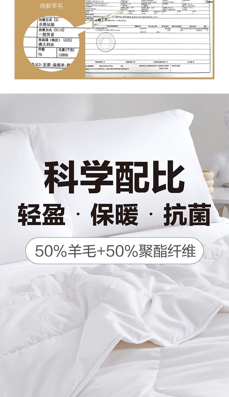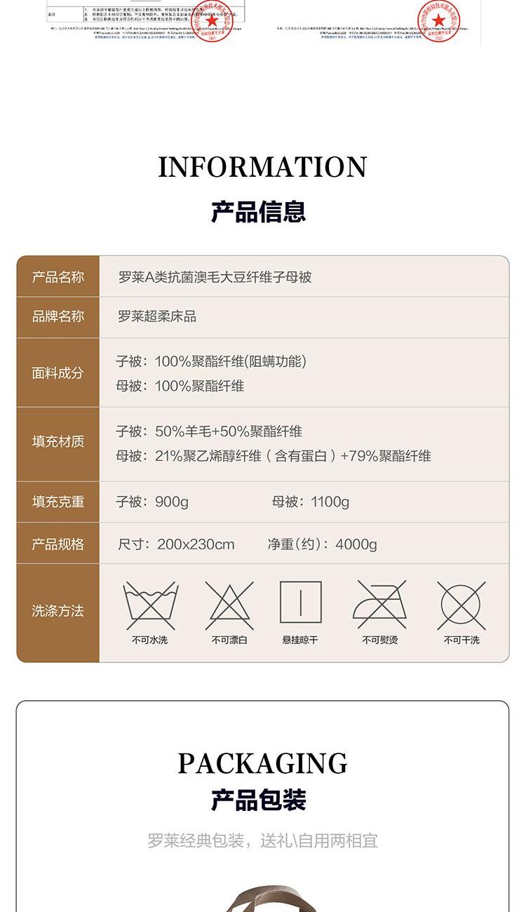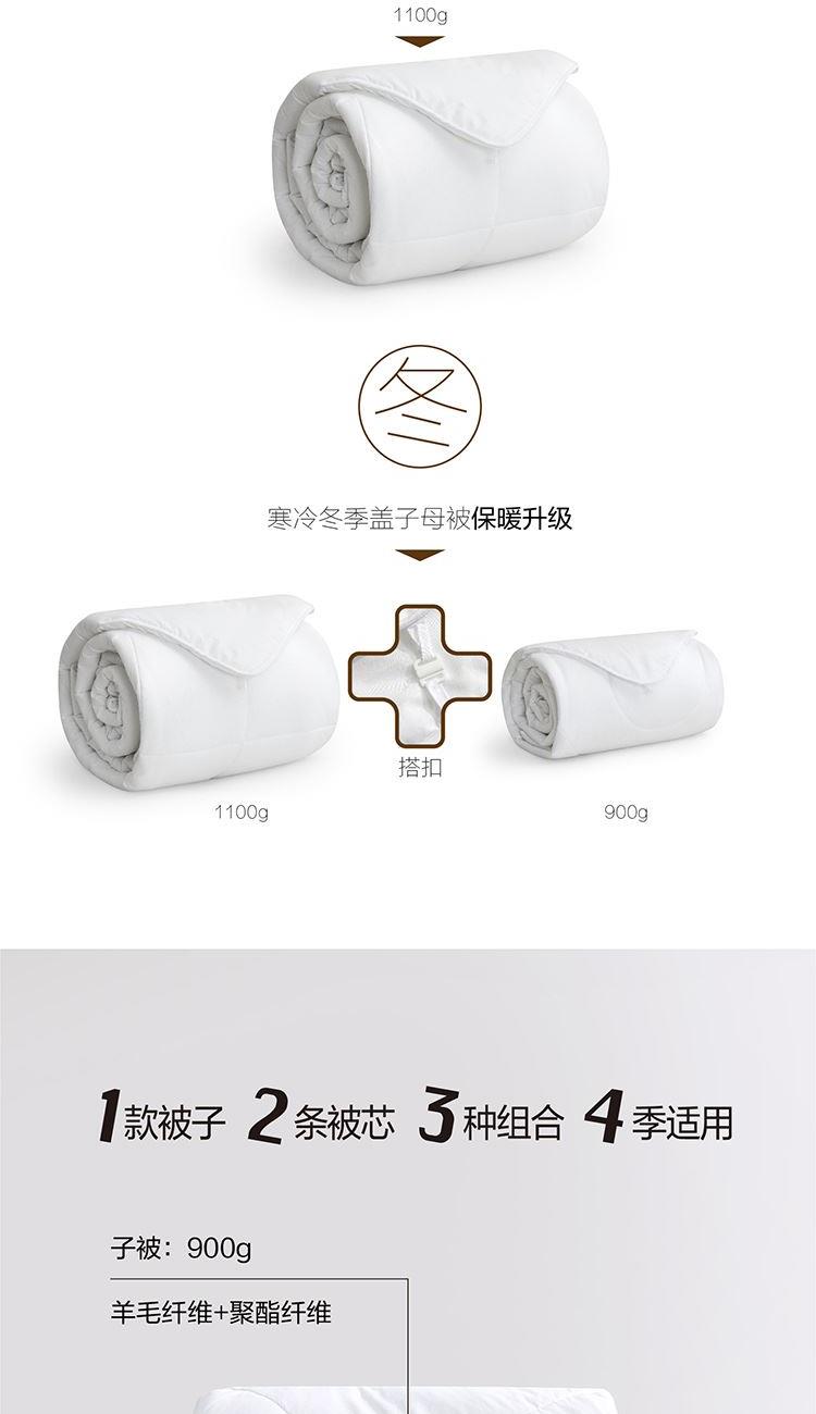 面料:聚酯纤维(防螨) 规格:200cm*230cm 子被:50%羊毛+50%聚酯纤维 母被:21%聚乙烯醇纤维(含有非转基因防螨大豆蛋白)+79%聚酯纤维 填充重量:子被:900g 母被:1100g