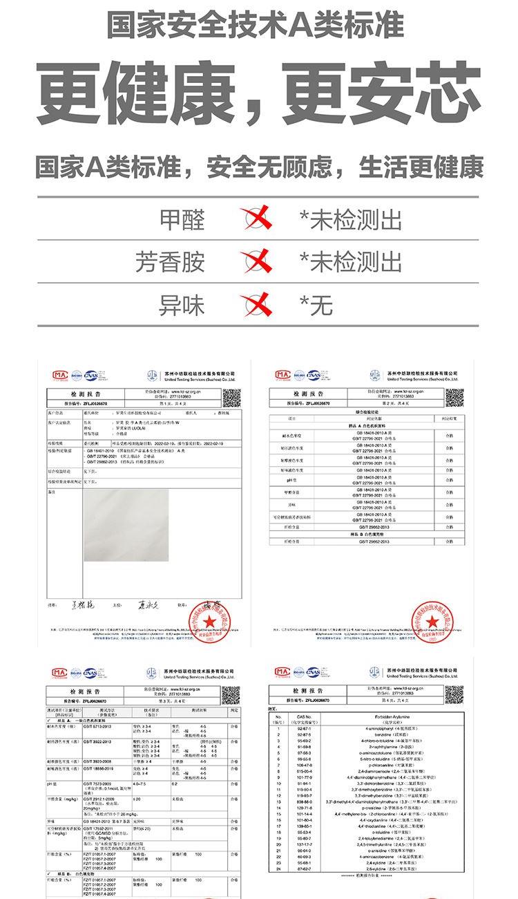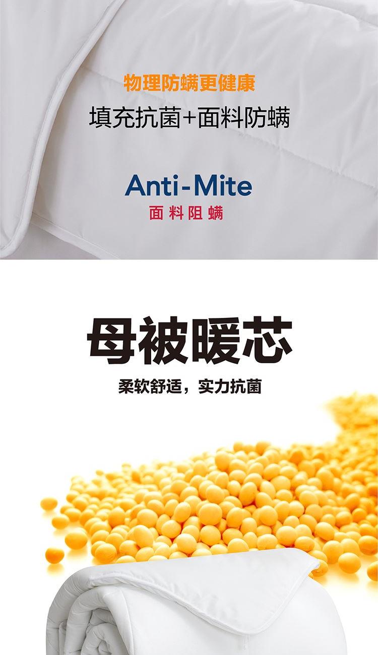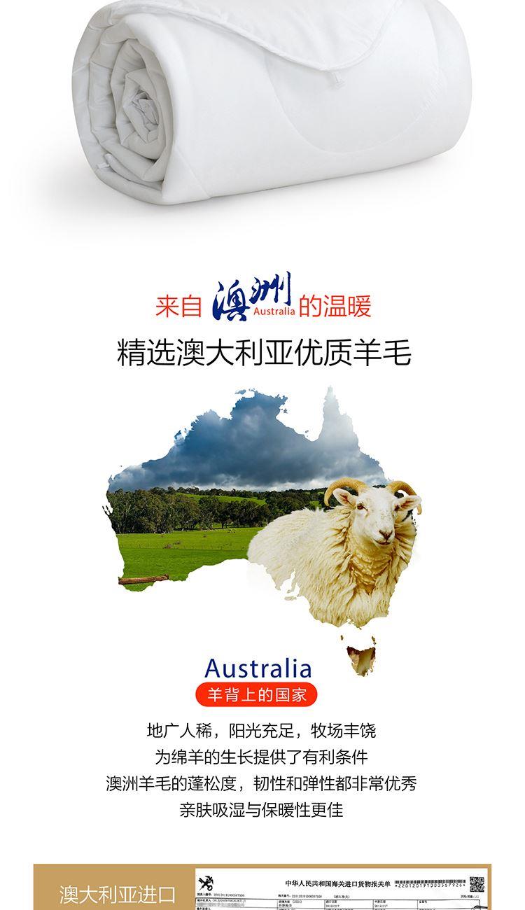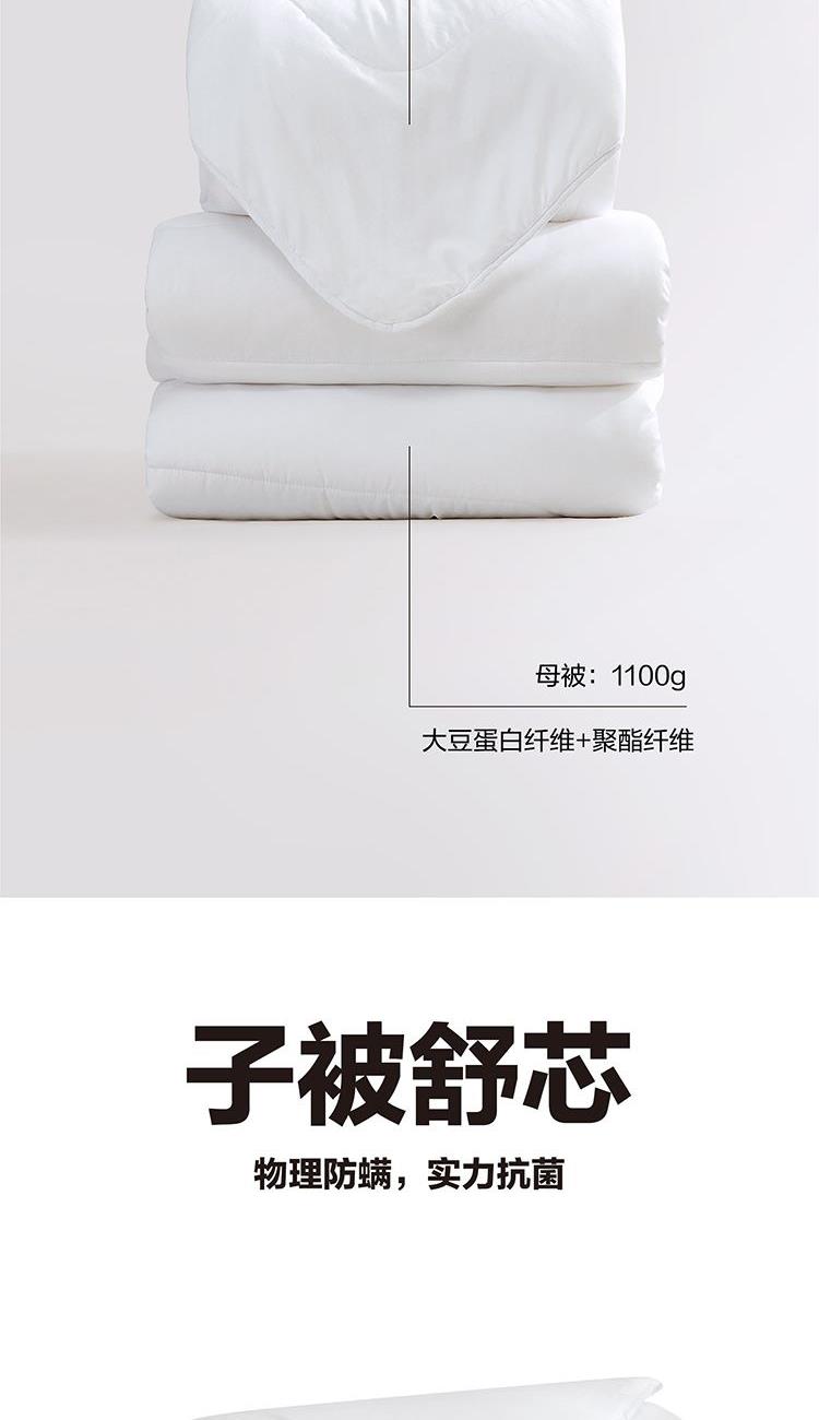 面料:聚酯纤维(防螨) 规格:200cm*230cm 子被:50%羊毛+50%聚酯纤维 母被:21%聚乙烯醇纤维(含有非转基因防螨大豆蛋白)+79%聚酯纤维 填充重量:子被:900g 母被:1100g