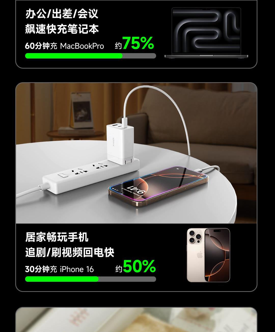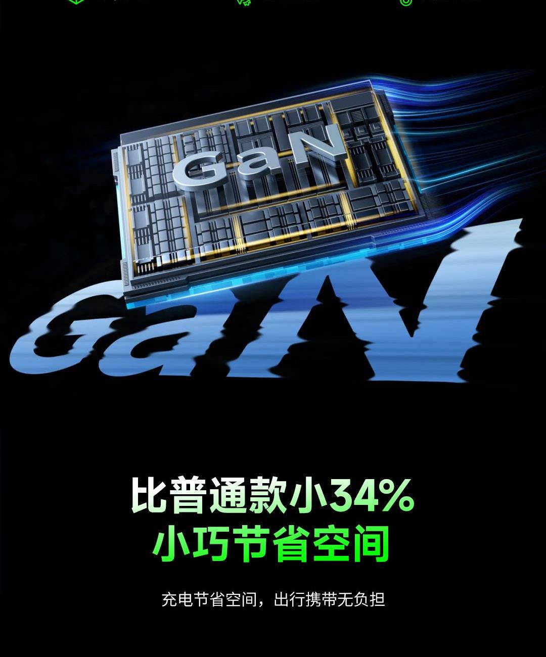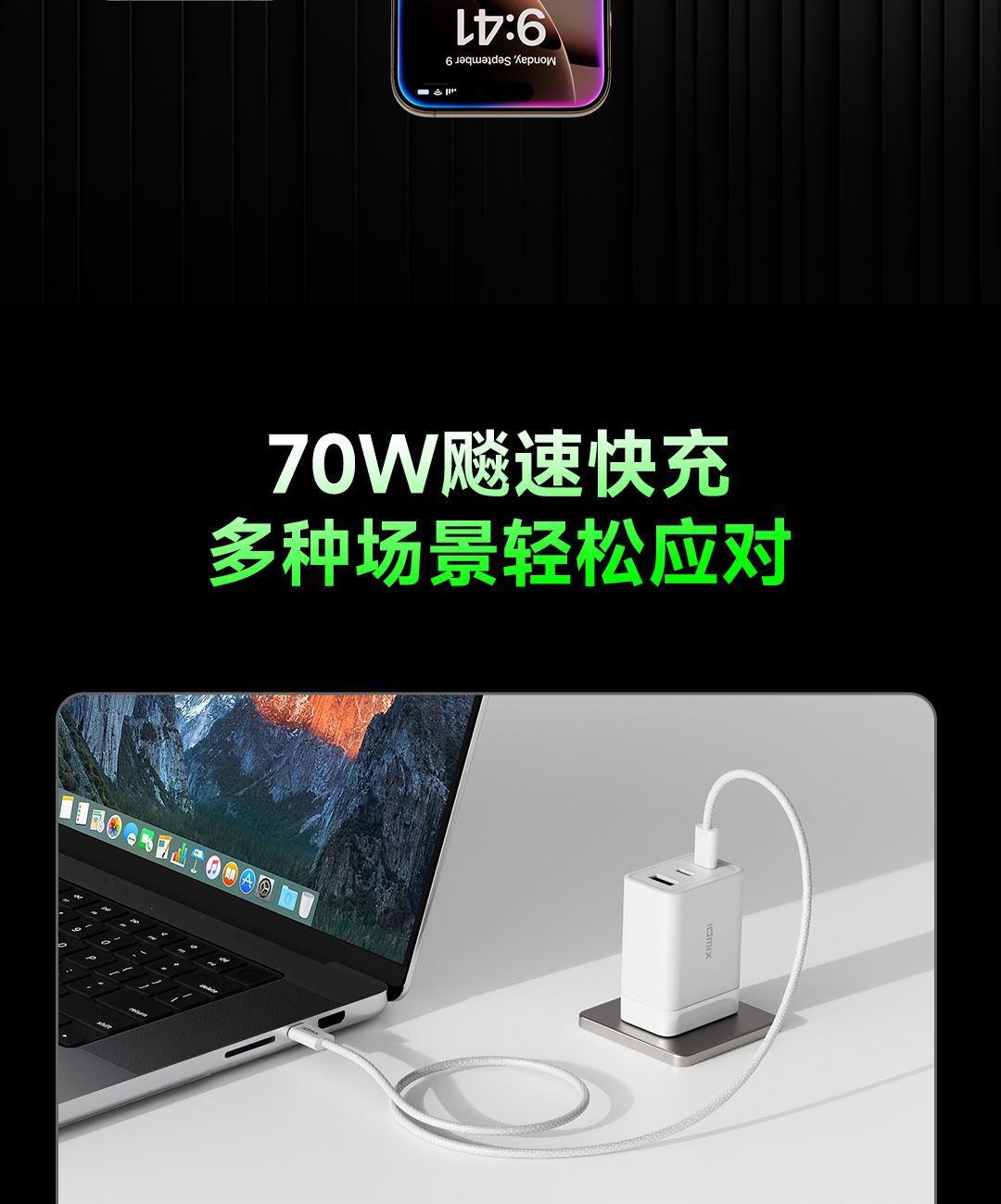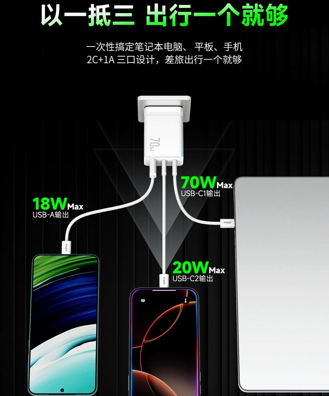 采用航天领域新型半导体材料GaN(氮化镓),使芯片集成度和能量转化率更高,体积更小,效率更高,发热更低. 可折叠插脚,便携70W飚速快充+PD60W数据线 USB-C1独立使用PD70W大功率输出,SUB-C2独立工作时支持20W输出,可供笔记本电脑快速充电; 2C口+1A口输出,可同时支持3台设备充电。智能调整输出电压及电流! 外壳采用V0级防火阻燃材质,耐磨耐用。3C安全认证,使用更安全. 输入:100-240V~,50/60HZ,1.5A 输出:5V=3A,9V=3A,12V=3A,15V=3A,20V=3.5A 产品尺寸:61.5*44.4*29.4mm 产品重量:约108g