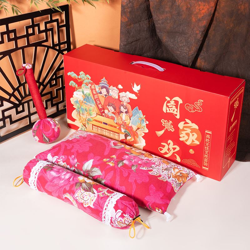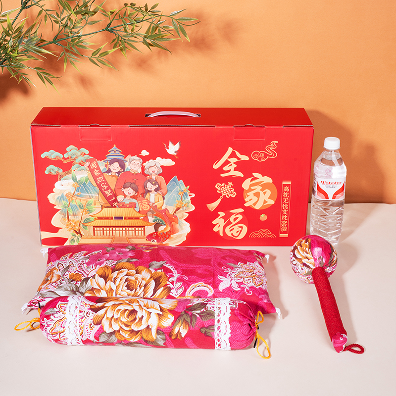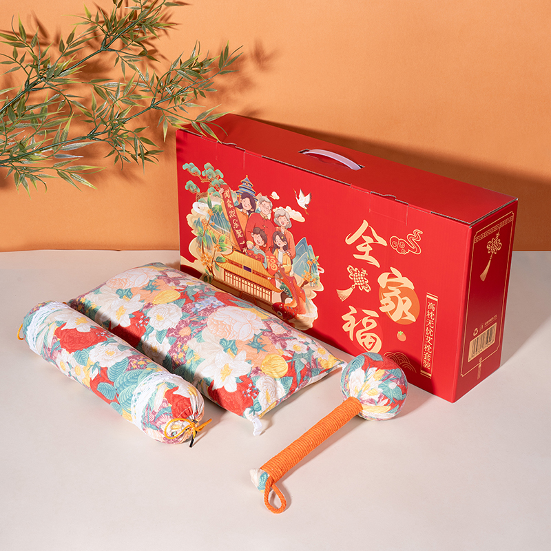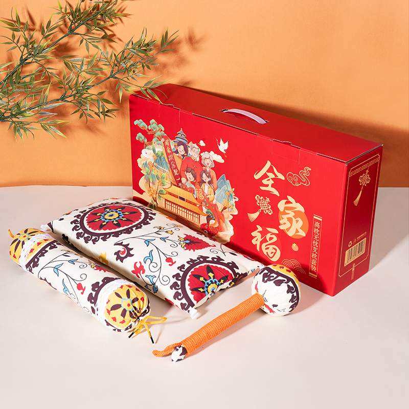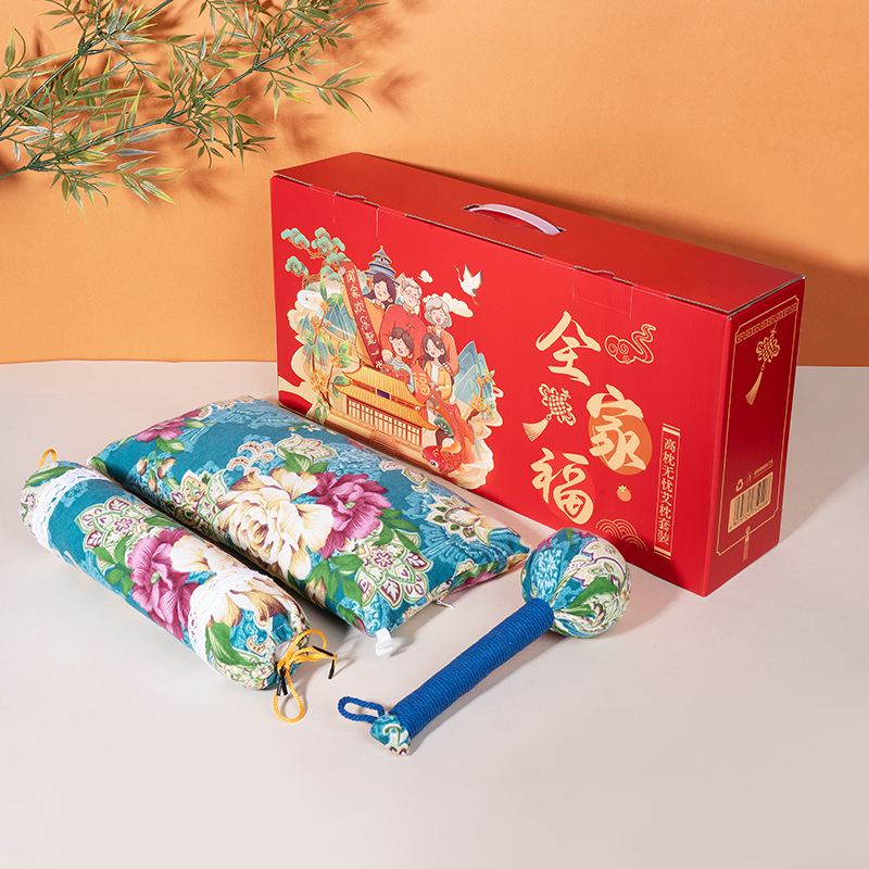 礼盒规格: 540*260*120mm 产品配置:艾草宫廷枕40*20*6cm*1 艾草颈椎枕35*8*8cm*1 艾草养生锤26cm*1 推荐理由: 1、主题“全家福 阖家欢”,献礼家和团圆,国潮风,大气喜庆。 2、产品套装包含宫廷枕、颈椎枕和养生锤,一套解决家居健康需求。 3、精选老粗布面料,色泽鲜艳,亲肤透气,内芯填充艾草碎,淡淡艾草香,可安神舒眠,温经通络。 4、宫廷枕两侧设卡扣,牵引/睡眠模式随心转换,颈椎枕拉伸颈椎,艾草锤日常按摩捶打。 5、花开富贵,繁花似锦,五种花色混搭,每种都好看。