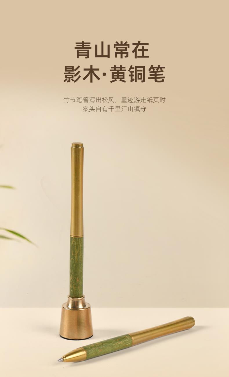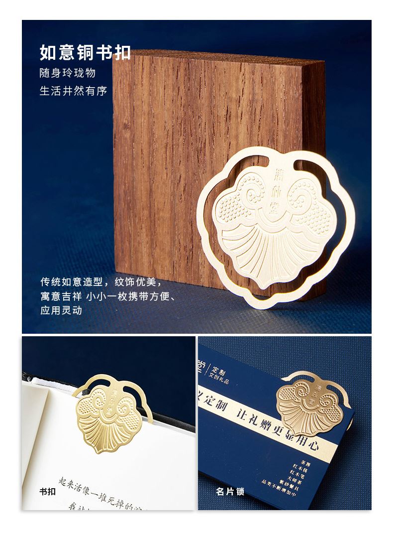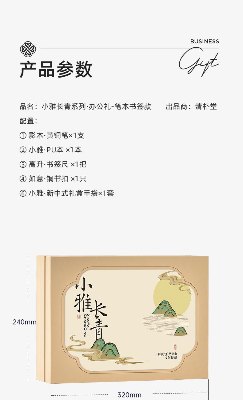配置 · ① 影木·黄铜笔×1支 ② 小雅·PU本 ×1本 ③ 高升·书签尺 ×1把 ④ 如意·铜书扣 ×1只 ⑥ 小雅·新中式礼盒手袋×1套
