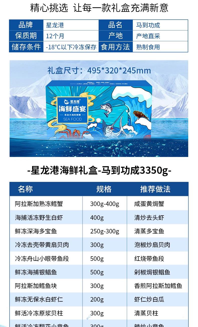 阿拉斯加熟冻鳕蟹300g-400g 海捕活冻野生白虾400g 鲜冻深海多宝鱼250g-300g 冷冻去壳带黄扇贝肉300g 冷冻舟山小眼带鱼段500g 鲜冻海捕银鲳鱼500g 阿拉斯加鳕鱼块300g 鲜冻无保水虾仁200g 鲜活冷冻原浆贝柱300g 鲜活冷冻翻花小章鱼300g