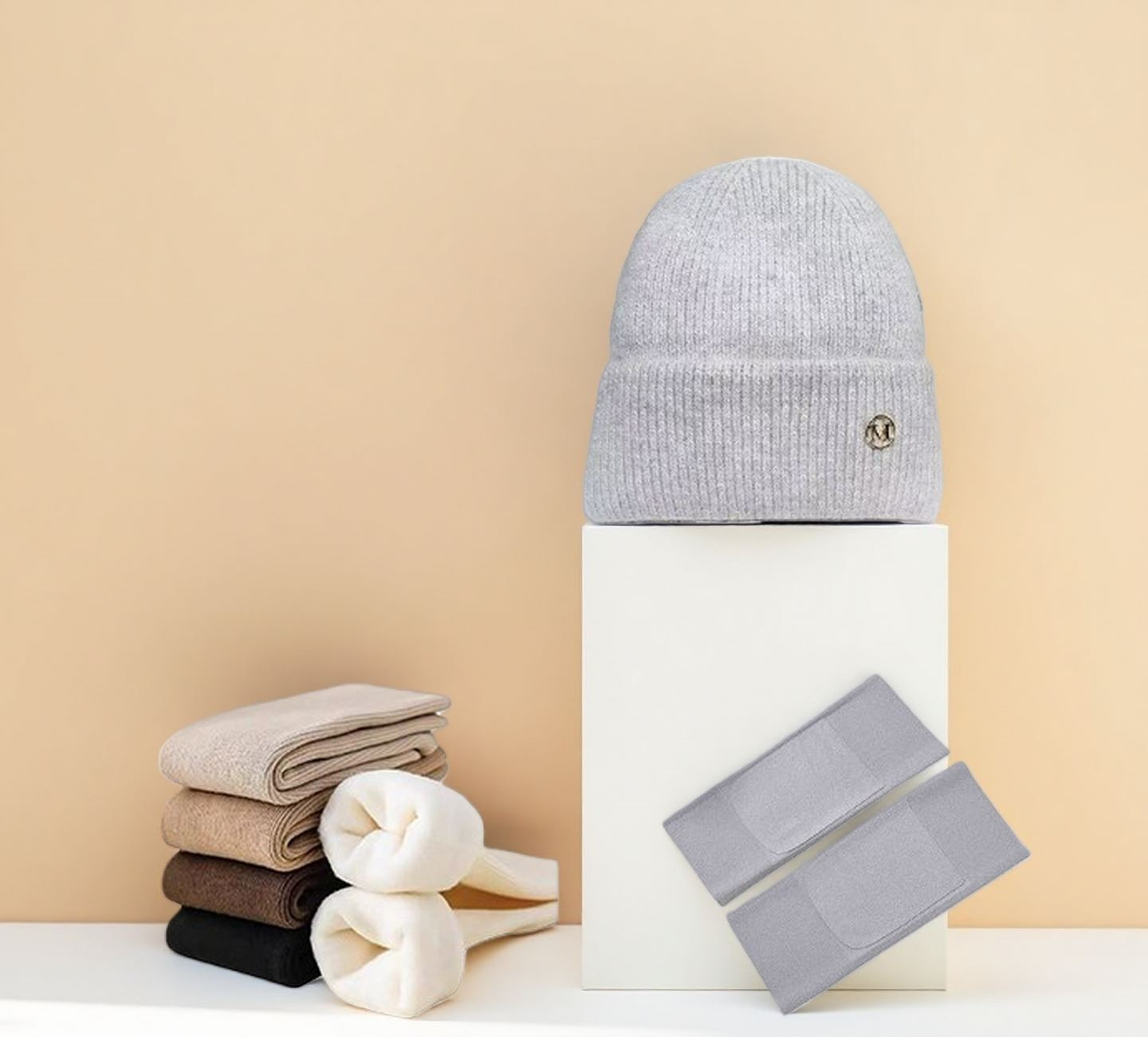产品材质: 帽子:加绒聚酯纤维 袜子:聚酯纤维 护膝:聚酯纤维 产品规格: 帽子:均码 袜子护膝:均码 产品组合:(帽子袜子护膝)