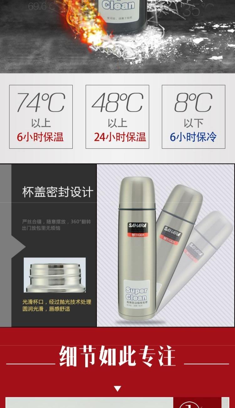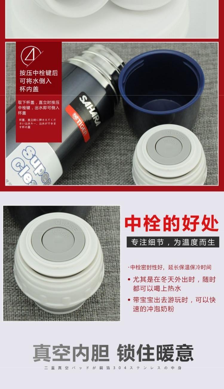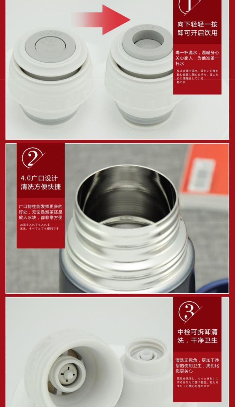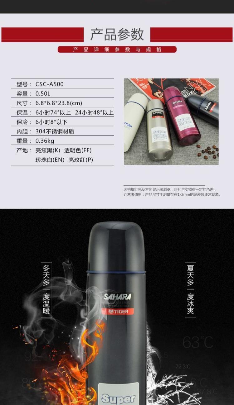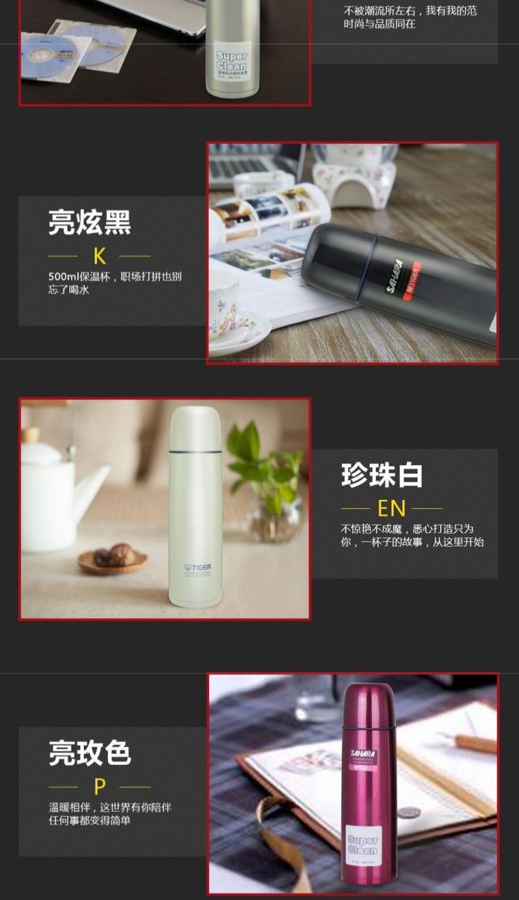 颜色: 亮炫黑K 透明色FF 珍珠白EN 亮玖红P 容量:500ML 材质 :304不锈钢 尺寸 :6.8*6.8*23.8cm 重量: .0.36GK 保温效果: 6小时70度以上 保冷6小时9度以下 超轻量设计的超薄(0.3mm)不锈钢瓶体 轻薄高强度,携带无负担 主材料为不锈钢(#304) 内部表面采用特殊工艺进行镜面加工 中栓式按钮可分离 极易清洗