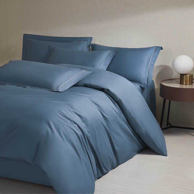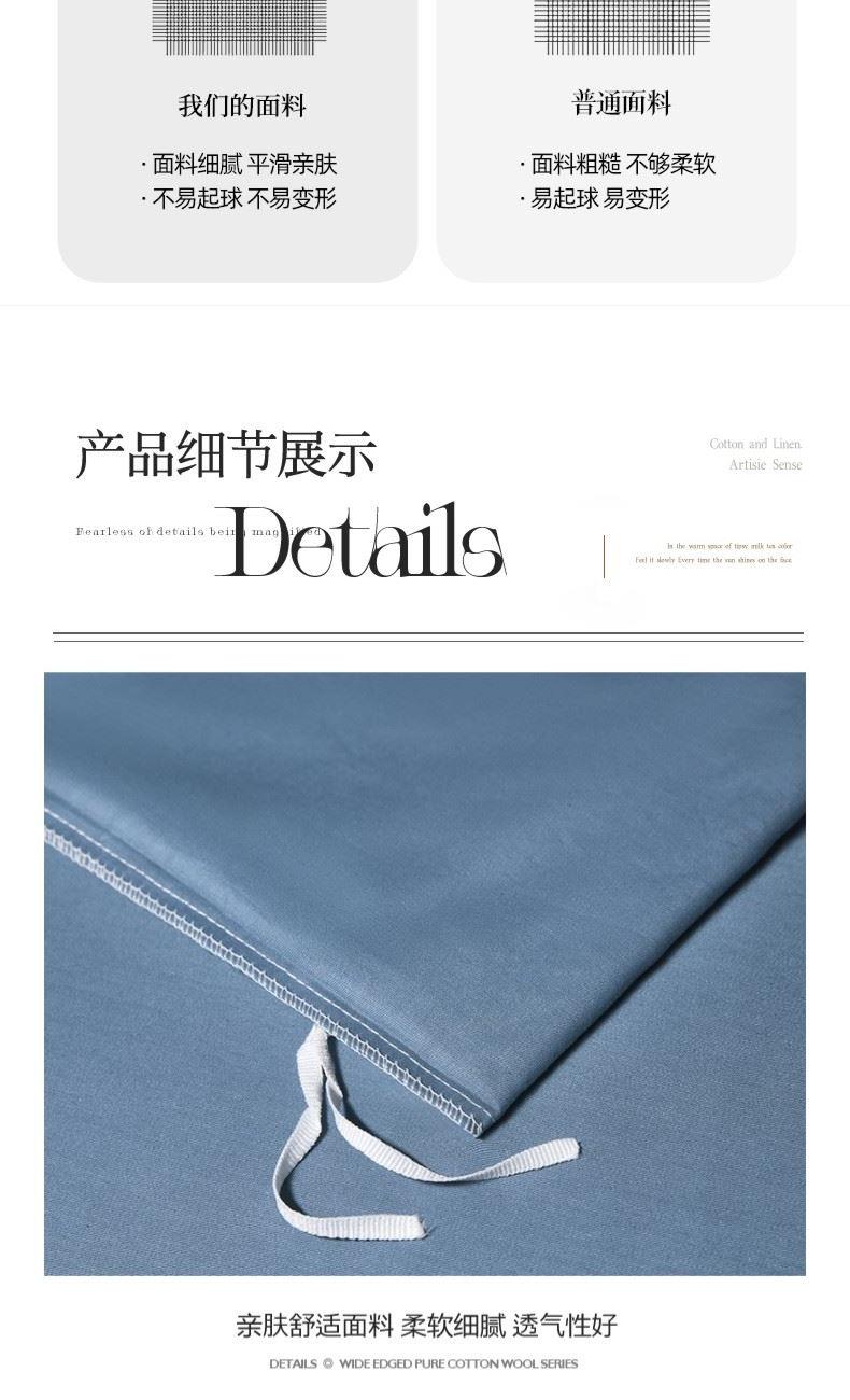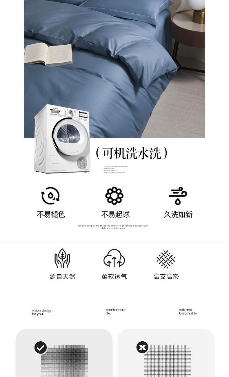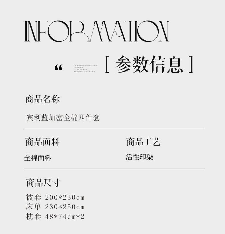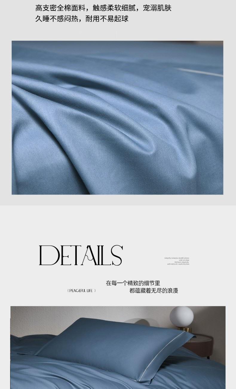 货 号:BGM-T2629 规 格:被套:200*230cm 床单:230*250cm 枕套:48*74cm*2 面料成份:高密全棉 花 型:宾利蓝 高密全棉材质:精选高支高密全棉面料,触感细腻顺滑,兼具良好的透气性与吸湿性,春夏使用清爽不闷,秋冬使用温润亲肤,适配四季睡眠需求。 精密织造工艺:高密度织造结构让面料更挺括耐用,不易起球变形,久洗仍能保持平整质感,为卧室带来长久的精致体验