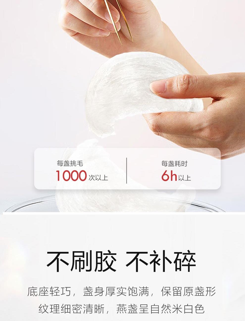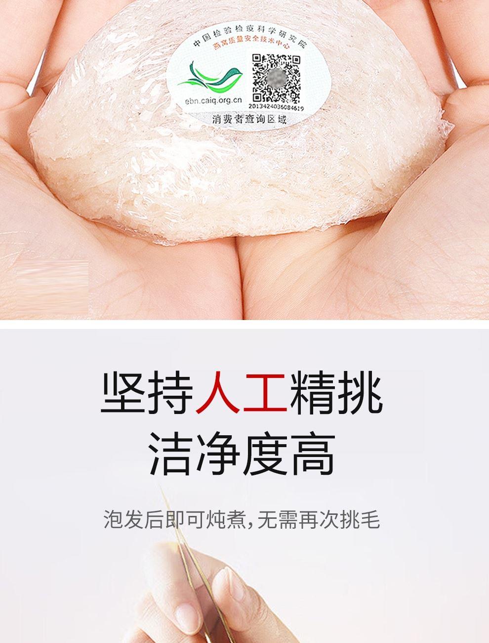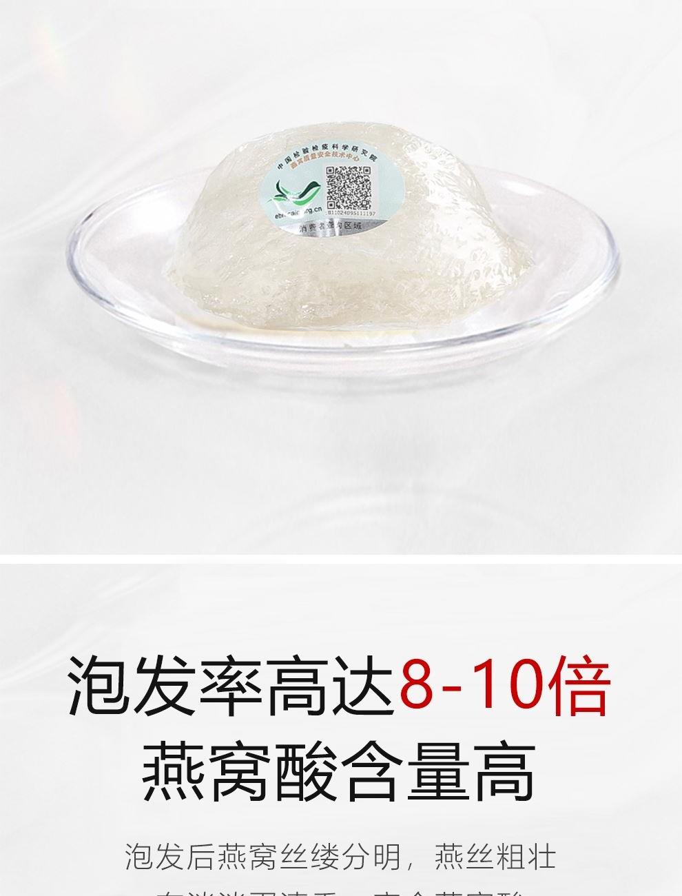 规格:溯源中盏50克(10盏) 卖点: 1、一盏一码,溯源可查,品质有保障。 2、不刷胶,不补碎,泡发率高达8-10倍。 3、99.9%洁净度,足干足称,不为一滴水分买单。 4、节省时间、免泡发燕盏省去了泡发的时间,可以开始炖煮。 5、免泡发燕盏的加工过程更加标准化,品质更加稳定。