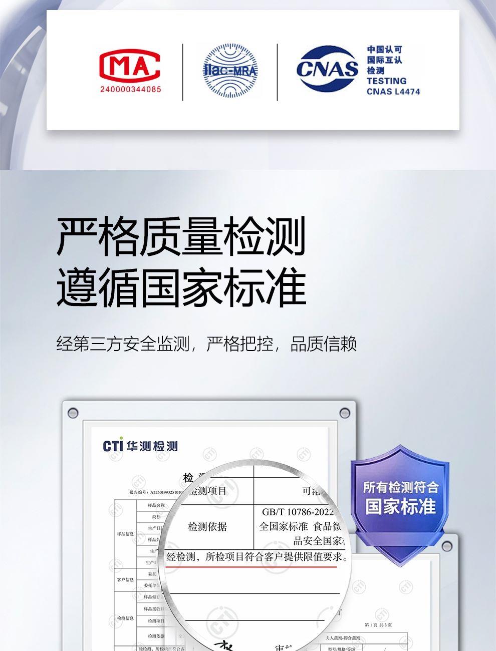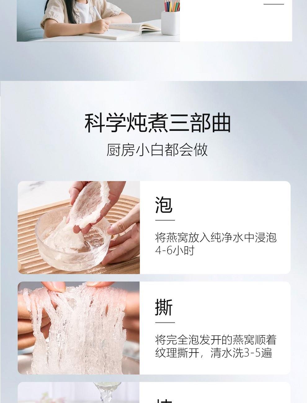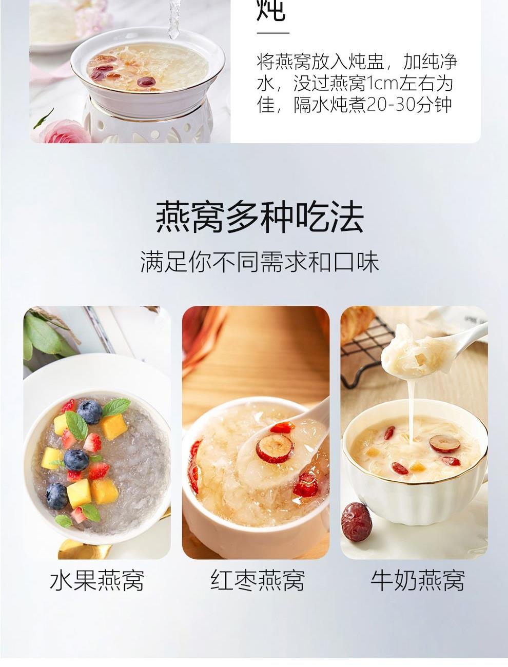 规格:溯源中盏50克(10盏) 卖点: 1、一盏一码,溯源可查,品质有保障。 2、不刷胶,不补碎,泡发率高达8-10倍。 3、99.9%洁净度,足干足称,不为一滴水分买单。 4、节省时间、免泡发燕盏省去了泡发的时间,可以开始炖煮。 5、免泡发燕盏的加工过程更加标准化,品质更加稳定。