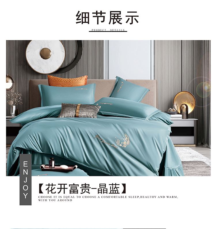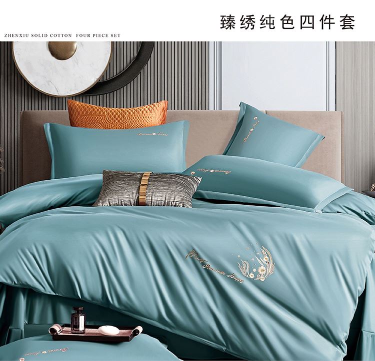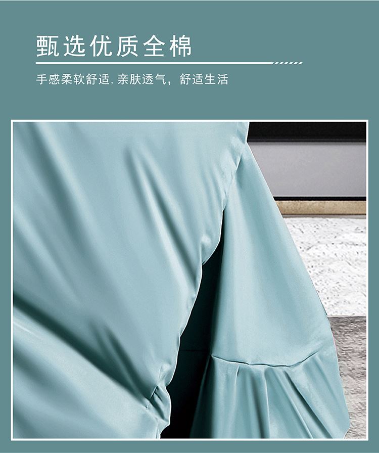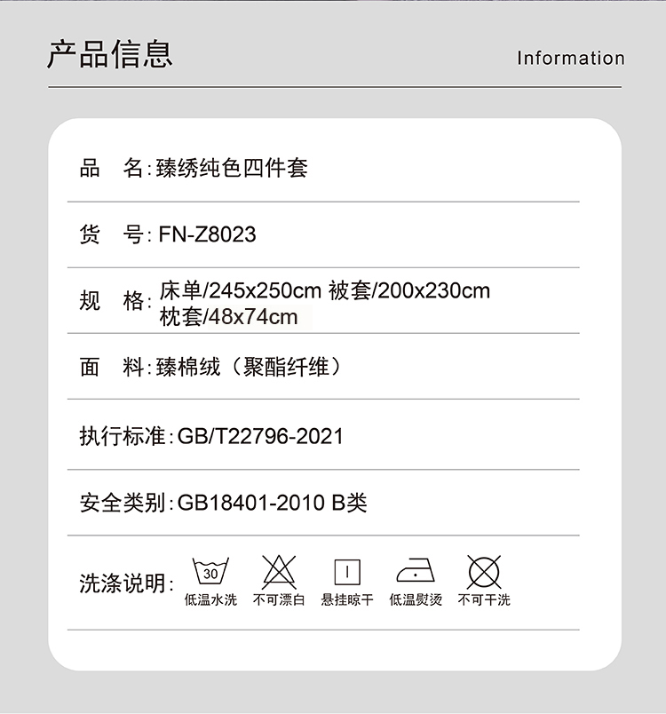 床单:245x250cm 被套:200x230cm 枕套:48x74cm 【面 料】臻棉绒(聚酯纤维) 产品特点: 1.加厚加密臻棉绒面料,细密紧实,精美绣花装饰,品质轻奢; 2.高雅纯色设计,适合不同家居风格,活性印染,色泽明亮; 3.锁边内缝式被套,圆角贴边床单,工艺精致。