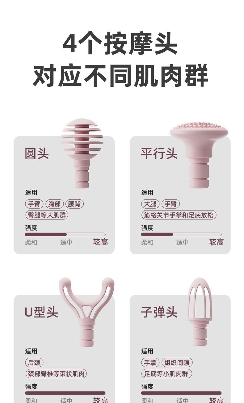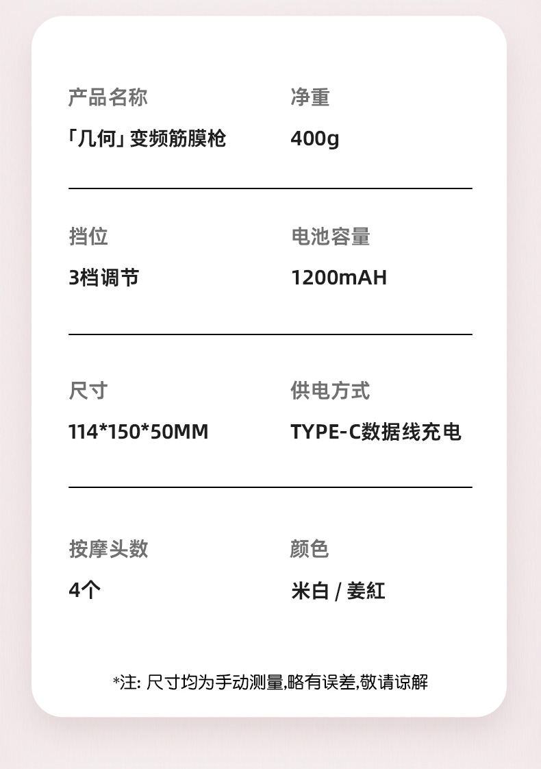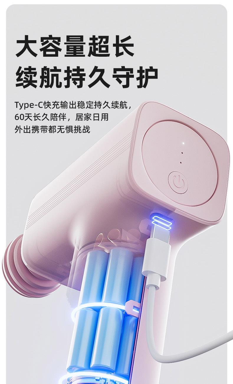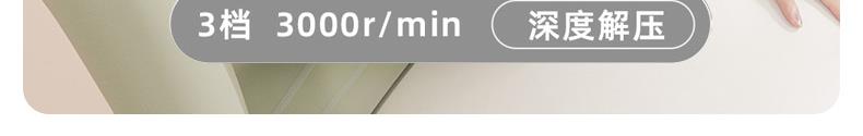 额定输入:DC5V 额定功率:18W 电池容量:1200mAh 高转速:3000r/min 产品材质:ABS 产品净重 422g 使用时间 5-6小时 充电类型 Type-c充电口 强悍性能,高性价比 快速放松,即刻享受 口袋里的按摩利器,持续畅享按摩 Type-C闪电快充,时刻补充能量 让按摩融入生活,肆意挥汗,悦享身心
