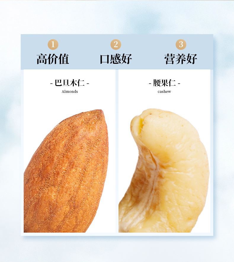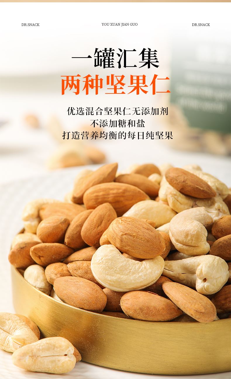 源自原味,口感酥脆,家庭量贩装,实惠大份量,一罐汇集两种坚果仁,科学配比均衡美味贯彻到底