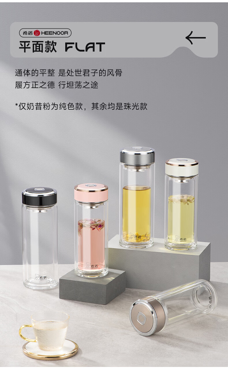 容量 XN-CG003C: 280ml 规格(mm) XN-CG003C: 48(杯口直径) x66(直径) x176(高度) 杯体 高硼硅玻璃 杯盖 食品级PP 、304不锈钢 滤网 食品级硅胶 、304不锈钢 密封圈 食品级硅胶 条形码 XN-CG003C: 6951097702077 颜色 XN-CG003C :奶昔粉 ,极光白 ,琉璃金 ,深海蓝