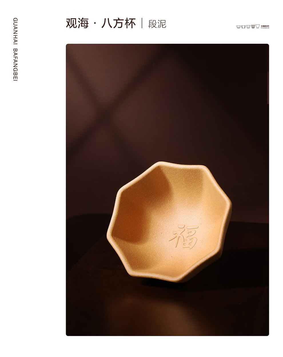 五杯、五型、五色一次集齐,福字与杯身一体成型,难能可贵。寓意五福临门,佳韵天成,兼具自然之美与人文风情。