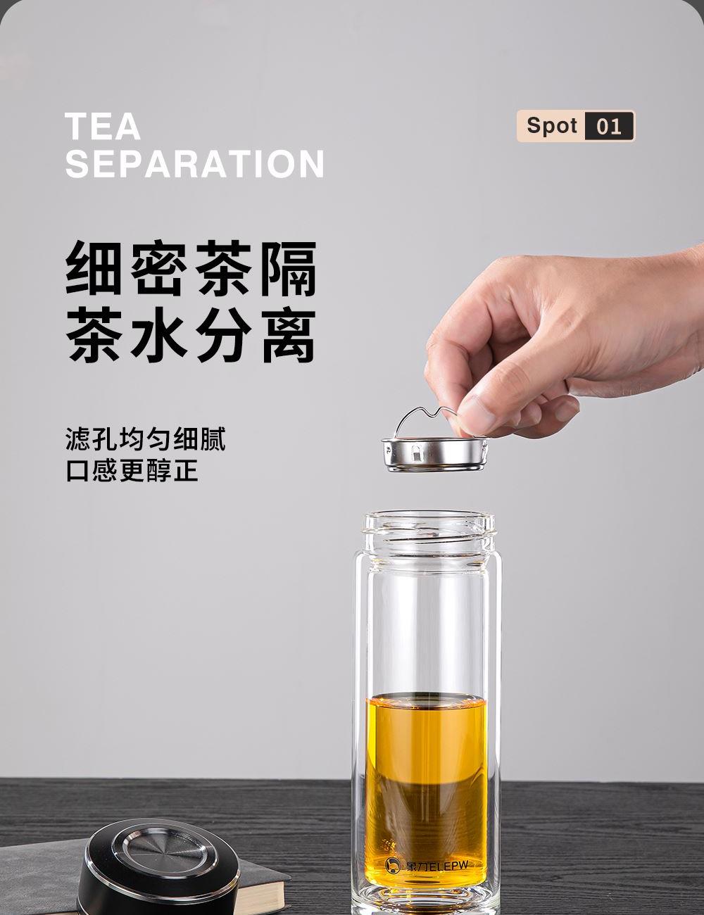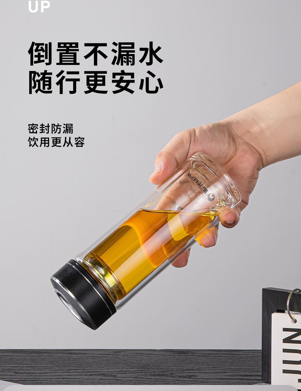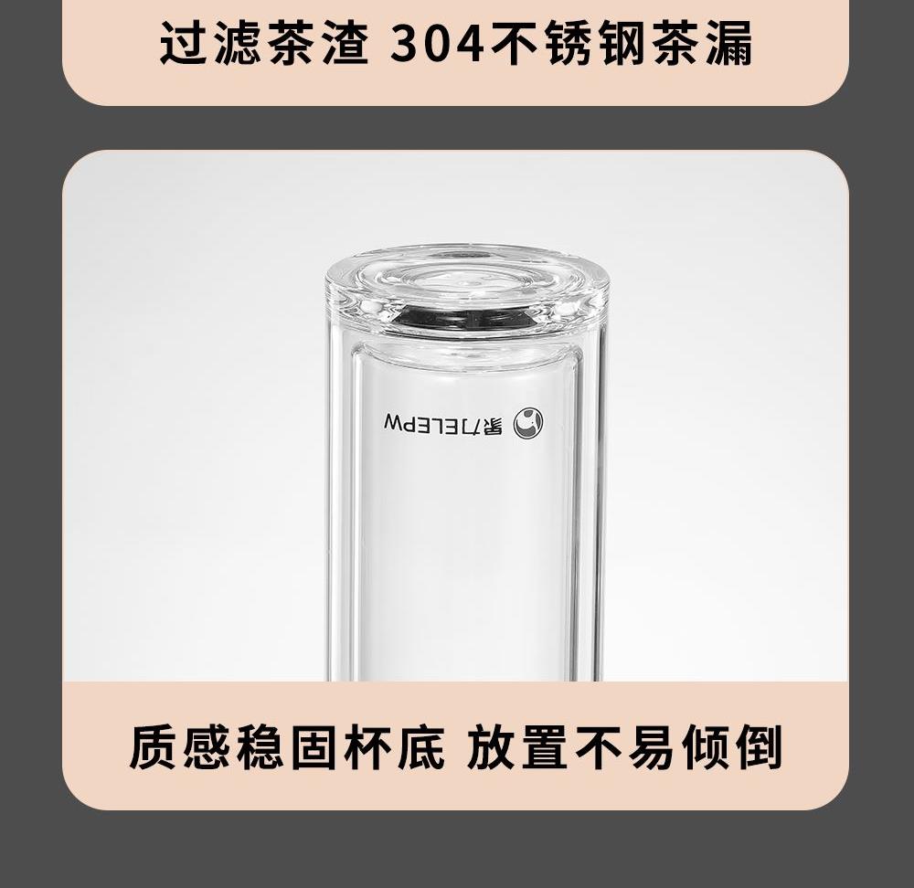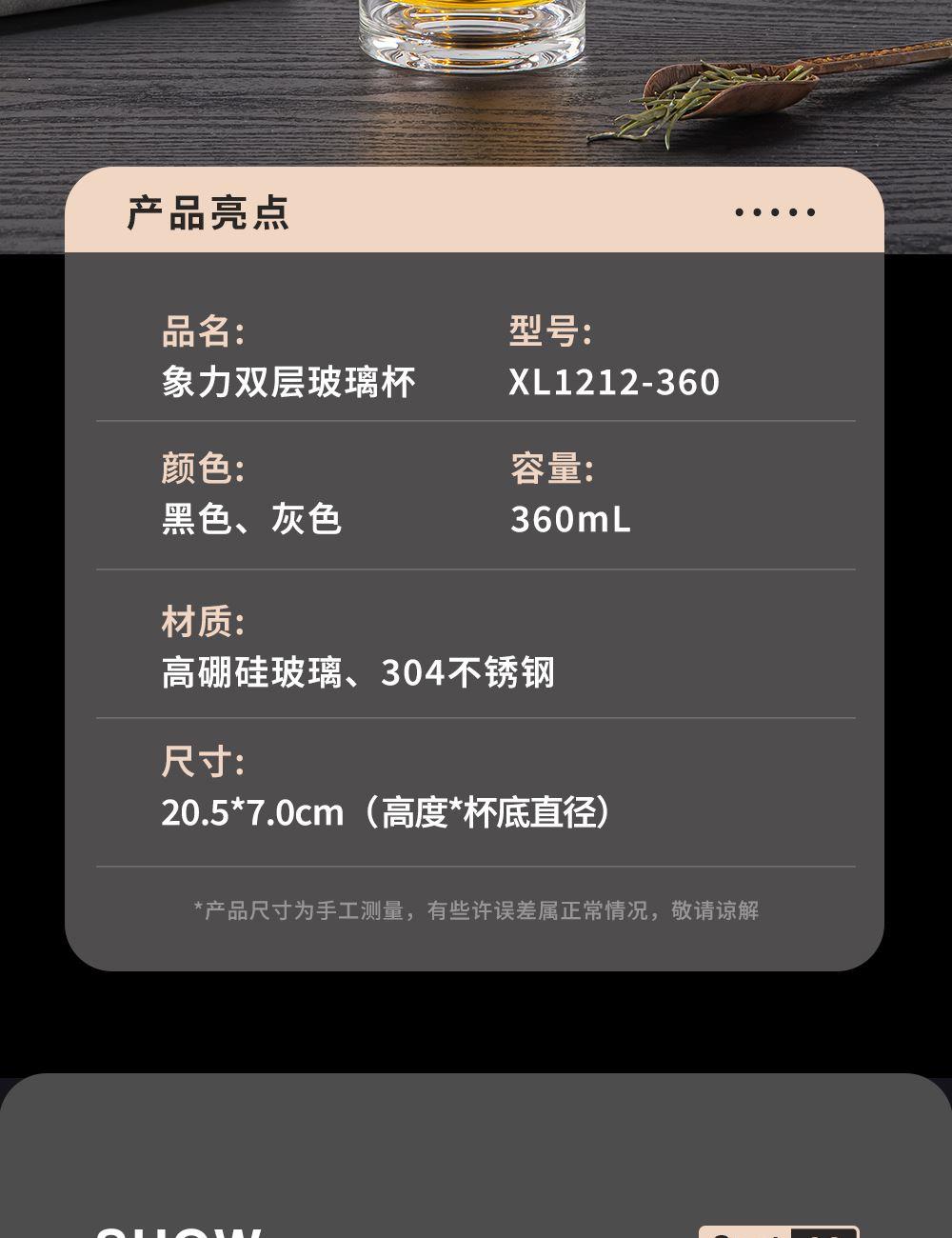 容量:360ml 颜色: 灰色 黑色 蓝色 材质:杯盖采用304不锈钢电镀配色+食品级PP材料,304不锈钢内芯。 杯体采用双层高硼硅玻璃,杯底手工加厚烧制一体成型。 加厚食品级硅胶密封胶圈,升级防漏品质。 包装:单瓦盒