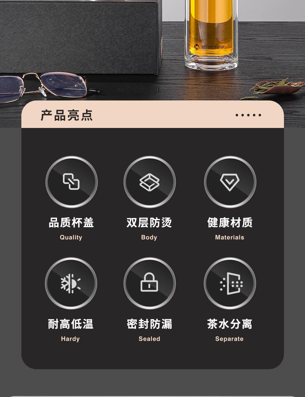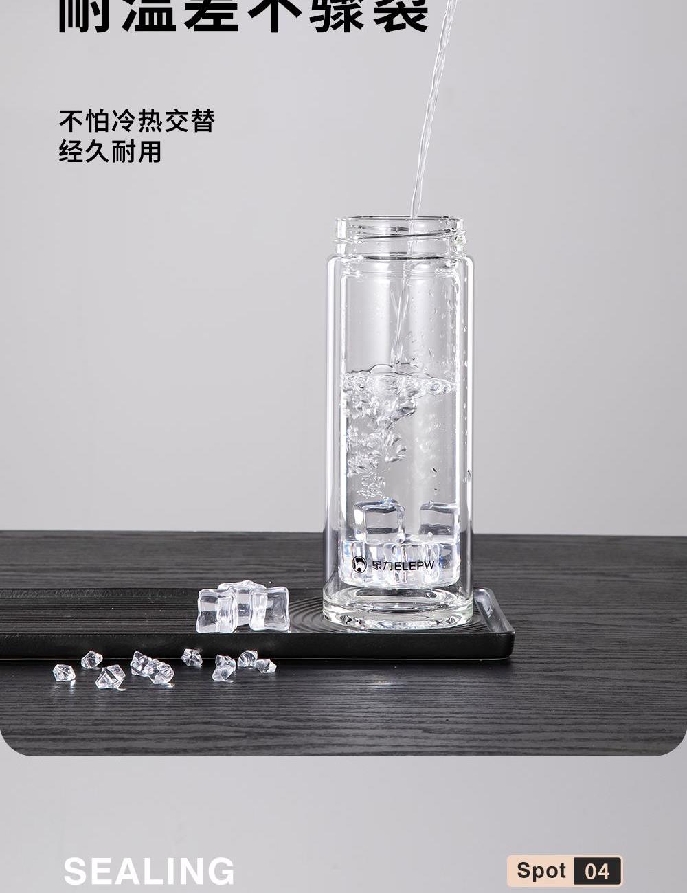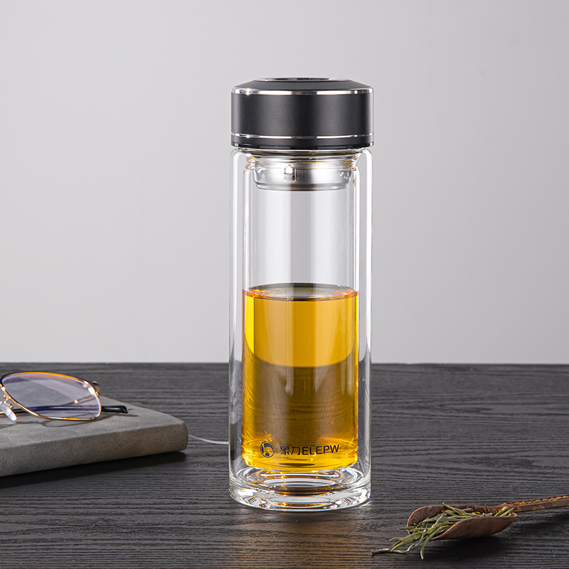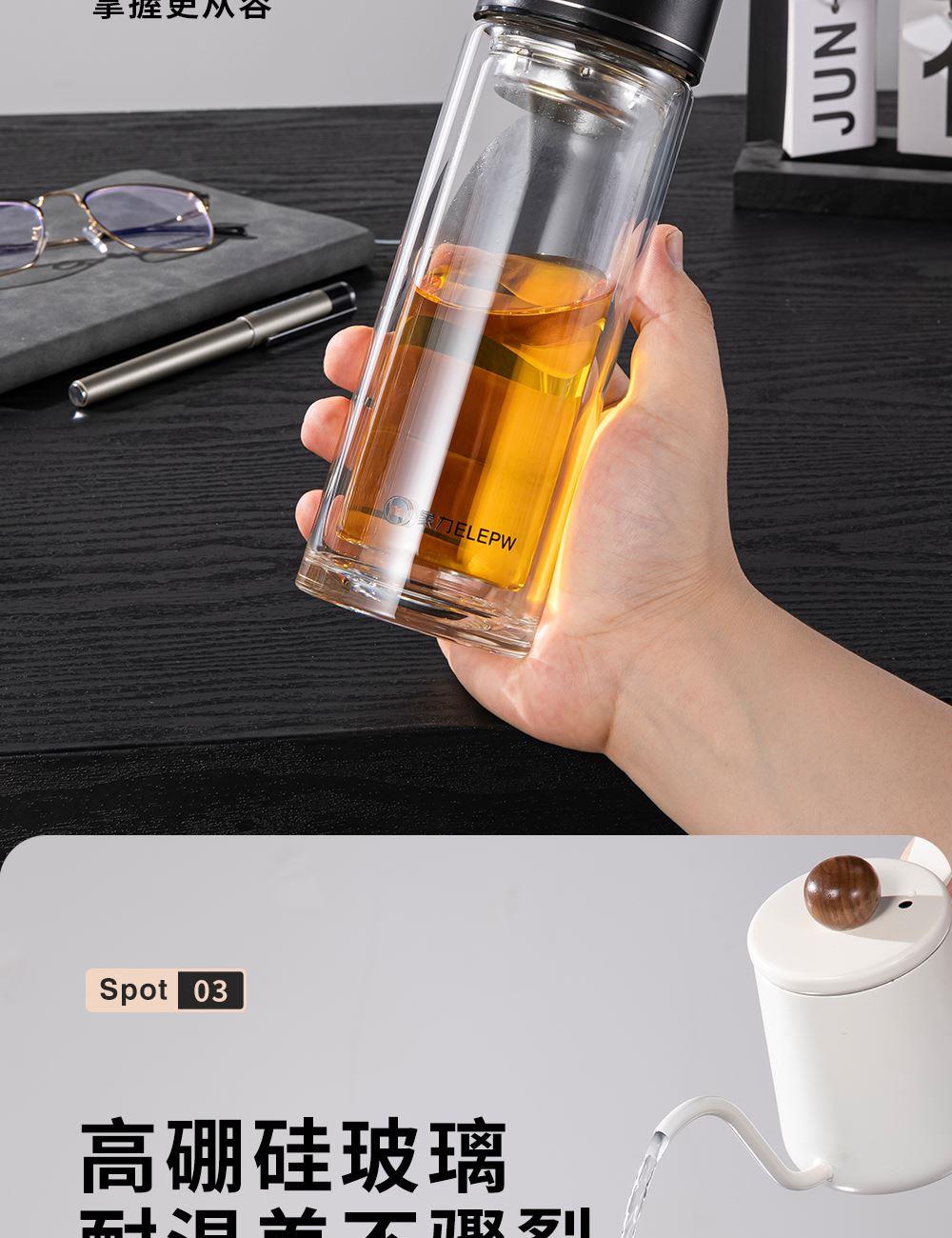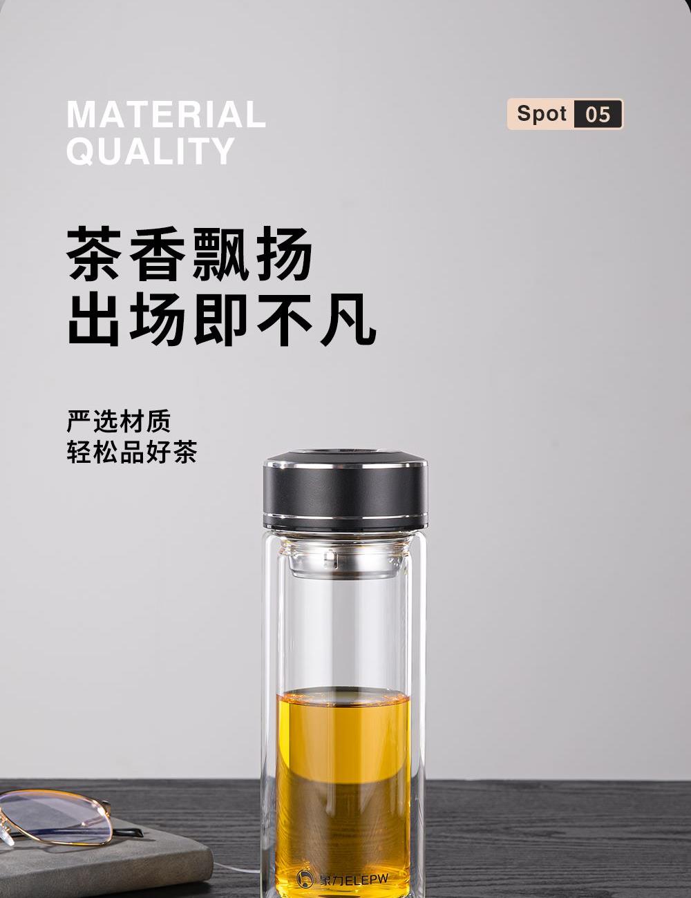 容量:360ml 颜色: 灰色 黑色 蓝色 材质:杯盖采用304不锈钢电镀配色+食品级PP材料,304不锈钢内芯。 杯体采用双层高硼硅玻璃,杯底手工加厚烧制一体成型。 加厚食品级硅胶密封胶圈,升级防漏品质。 包装:单瓦盒
