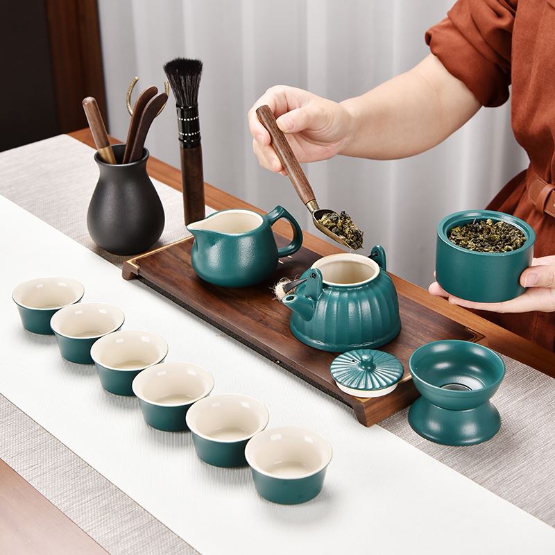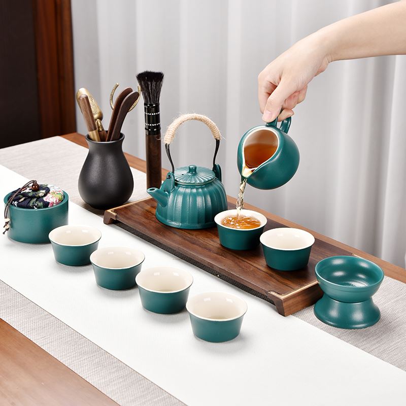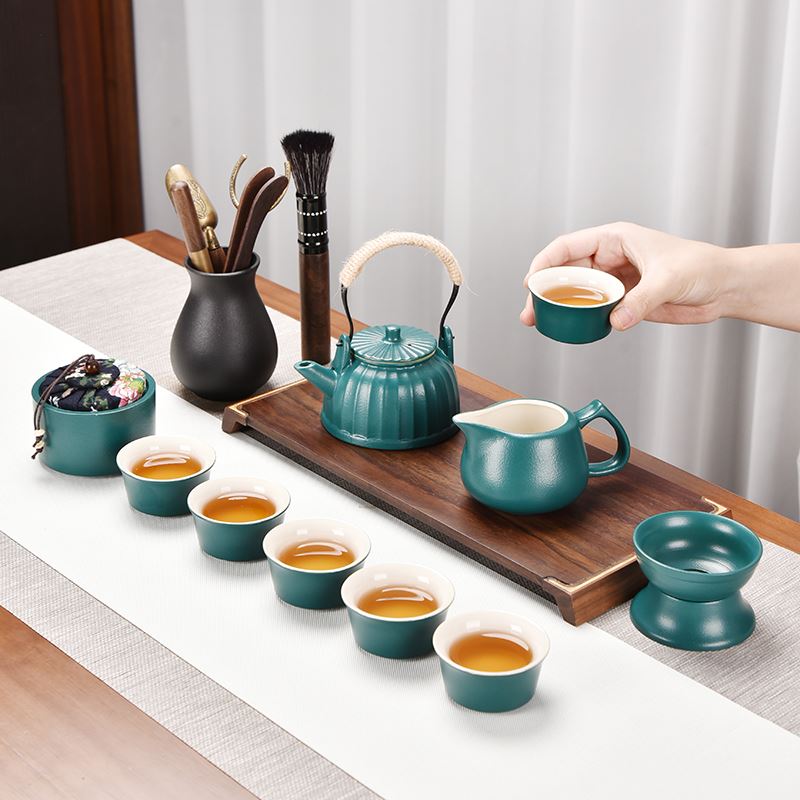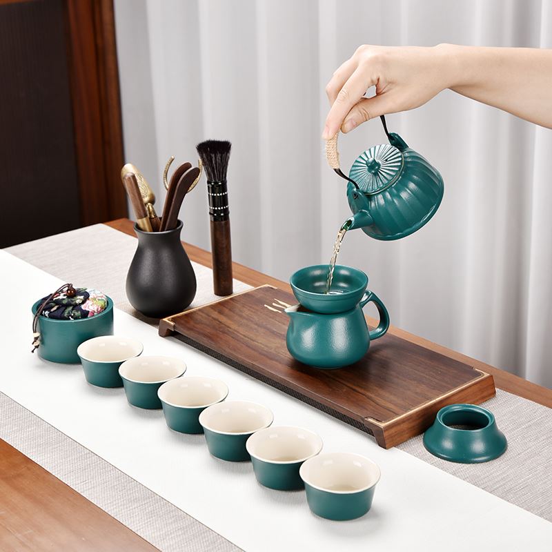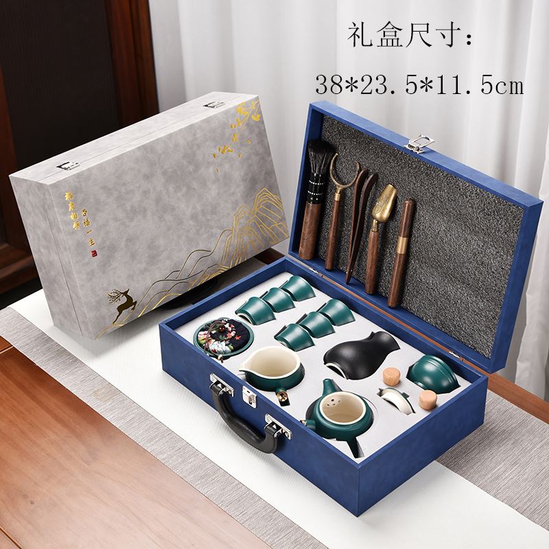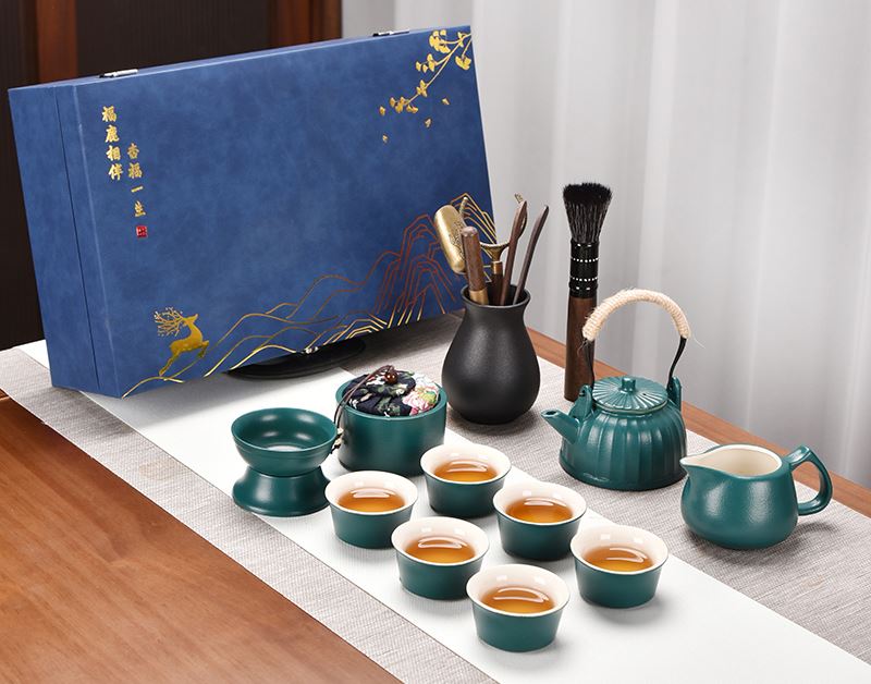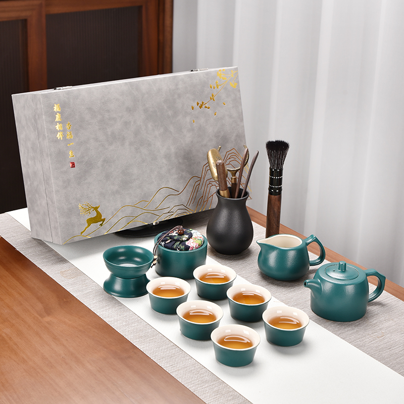 配制:1壶 6杯 1茶叶罐1公道杯1茶托1茶漏 1茶道6件套 1礼盒 材质:细陶 规格: 茶壶:11.7*9.5cm 杯: 6.3*3.3cm 茶叶罐: 8*7cm 公道杯:11.9*8.5cm 推荐说明:绿色茶具套装。亚光磨砂釉茶具,手感舒适。16头一应俱全,大气实用