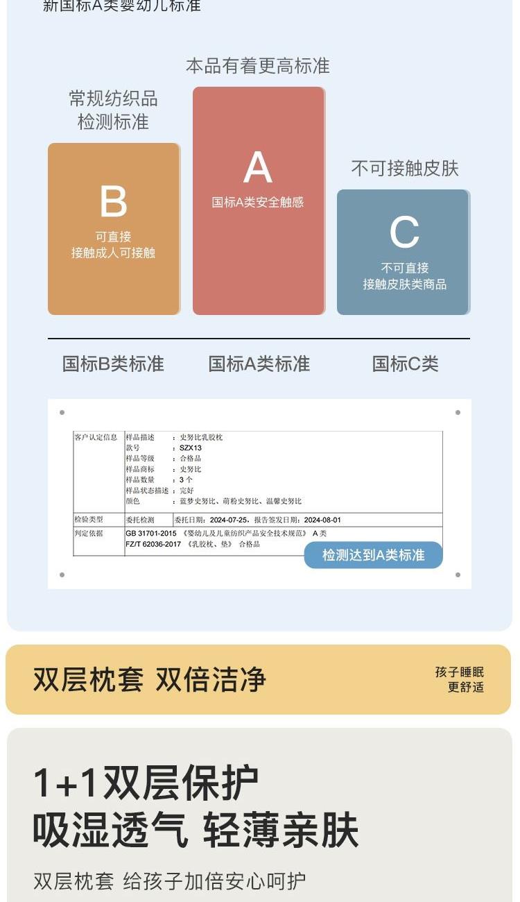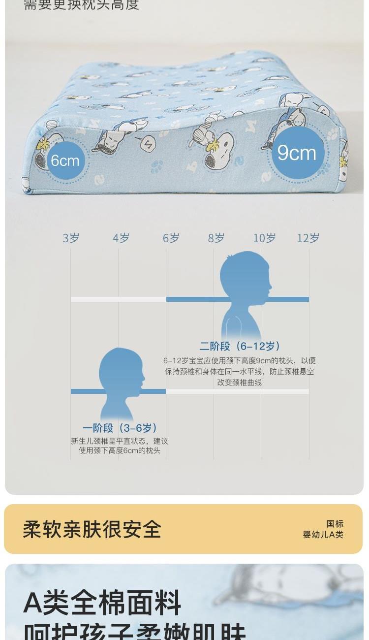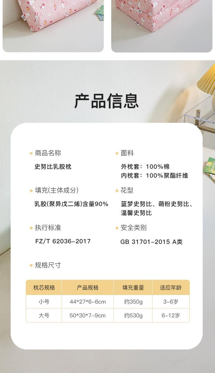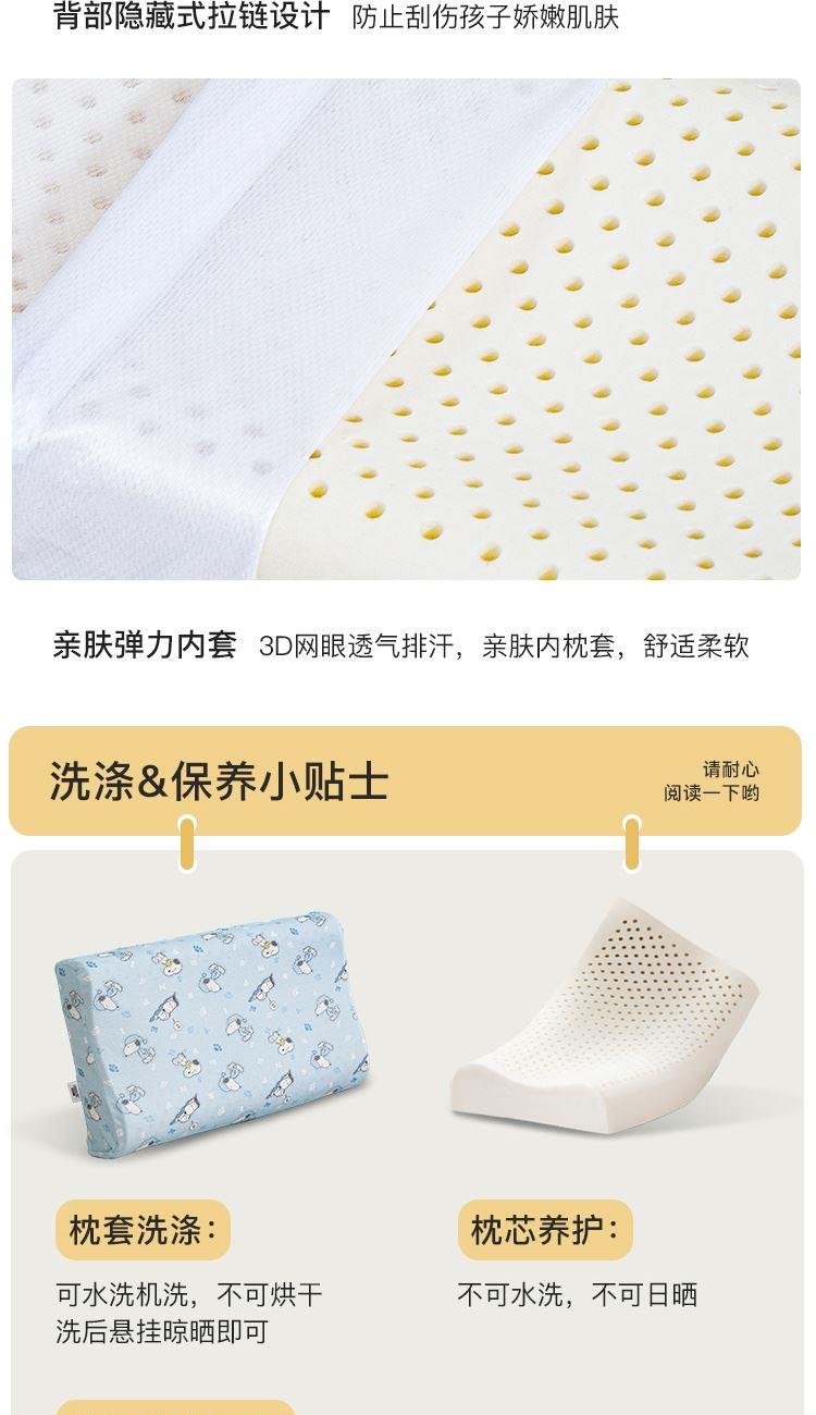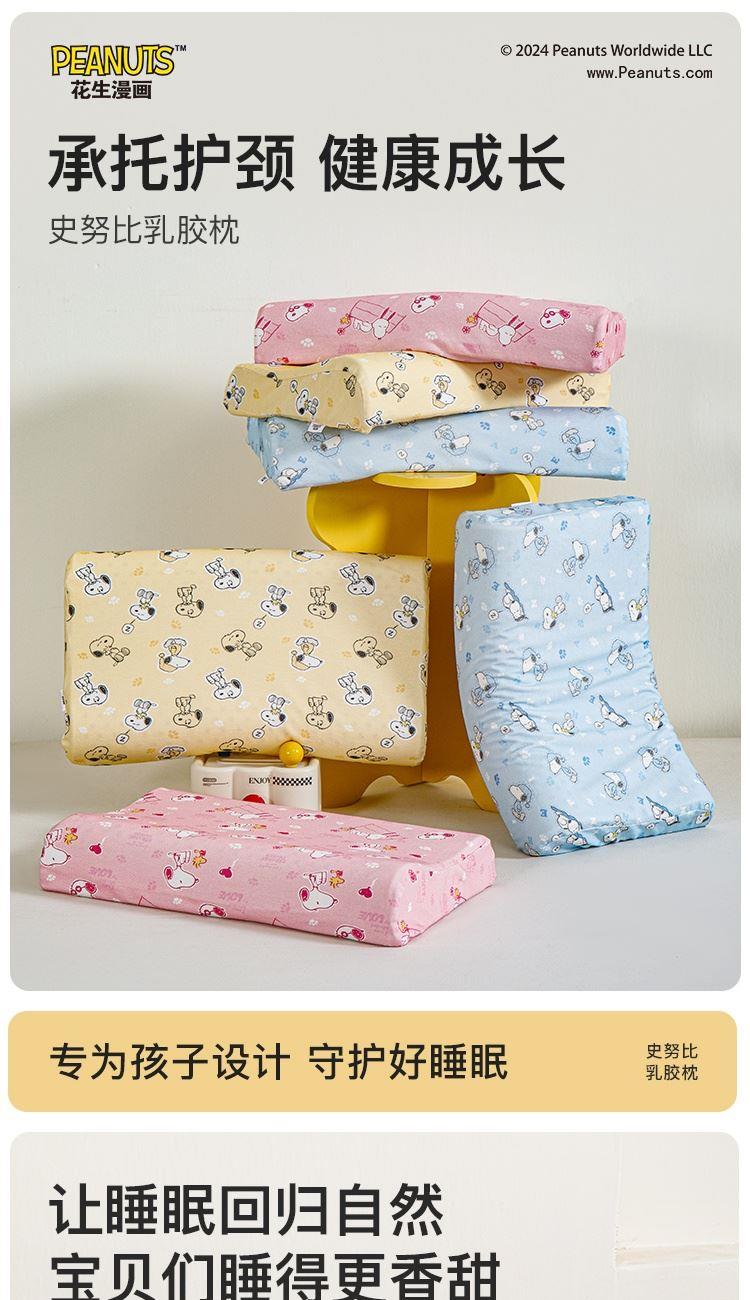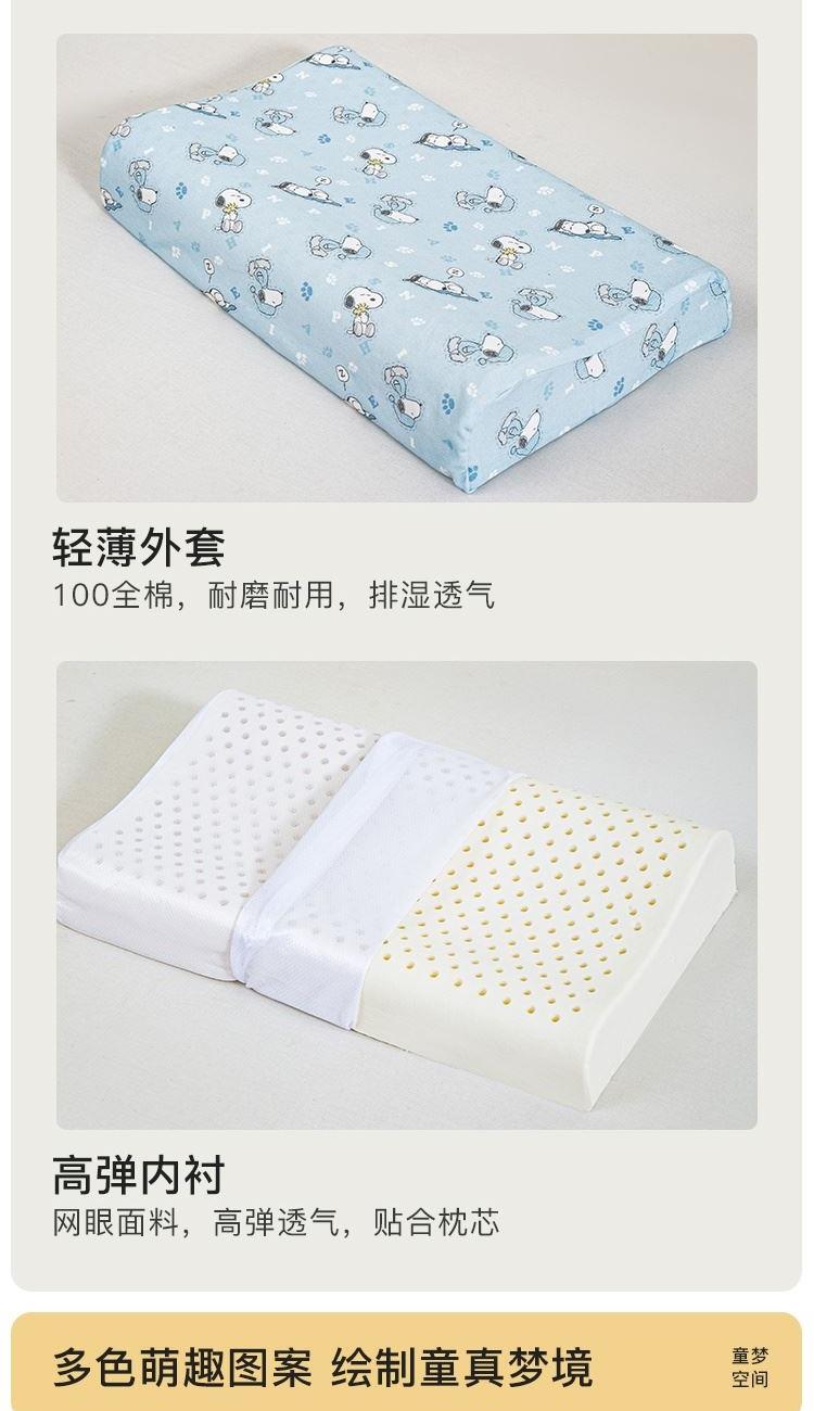 商品货号:SZX13 商品面料:棉 里料:聚酯纤维 枕芯材质:乳胶(聚异戊二烯) 商品颜色:蓝梦史努比、萌粉史努比、温馨史努比 A类全棉面料呵护孩子柔嫩肌肤 吸湿透气轻薄亲肤 双层枕套 给孩子加倍安心呵护 多色萌趣图案 绘制童真梦境