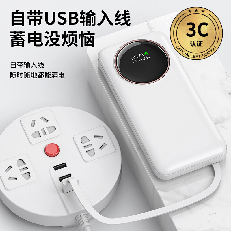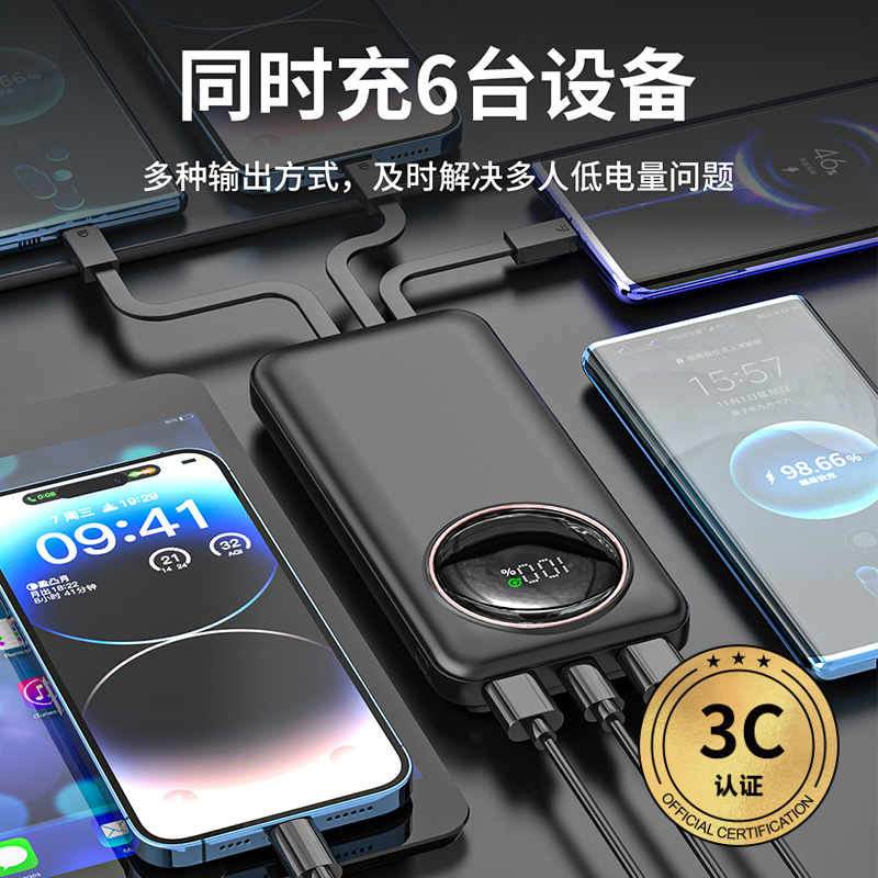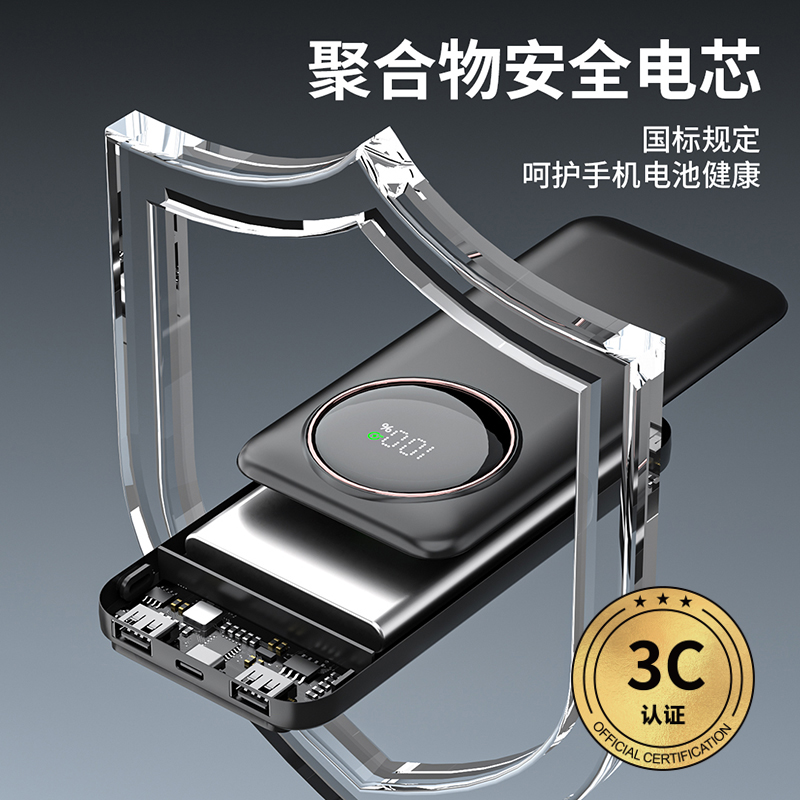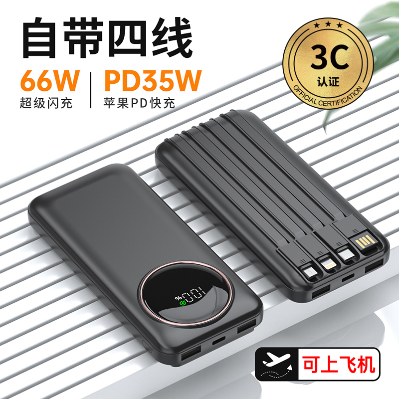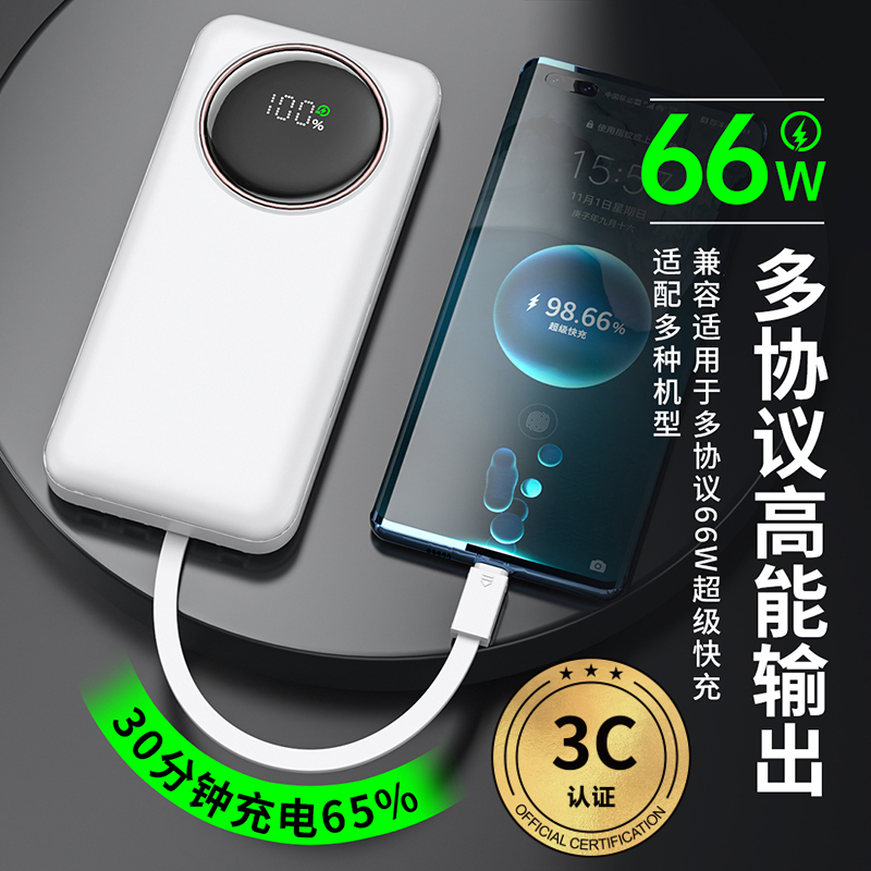 22.5W超级快充内置线移动电源X03 颜色:商务白 经典黑 材质:ABS 容量:10000毫安 包装:彩盒包装 22.5W超级快充 3C强制质量认证体系 数字电量显示 内置四线满足各种手机充电 符合民航局标准,可随身携带