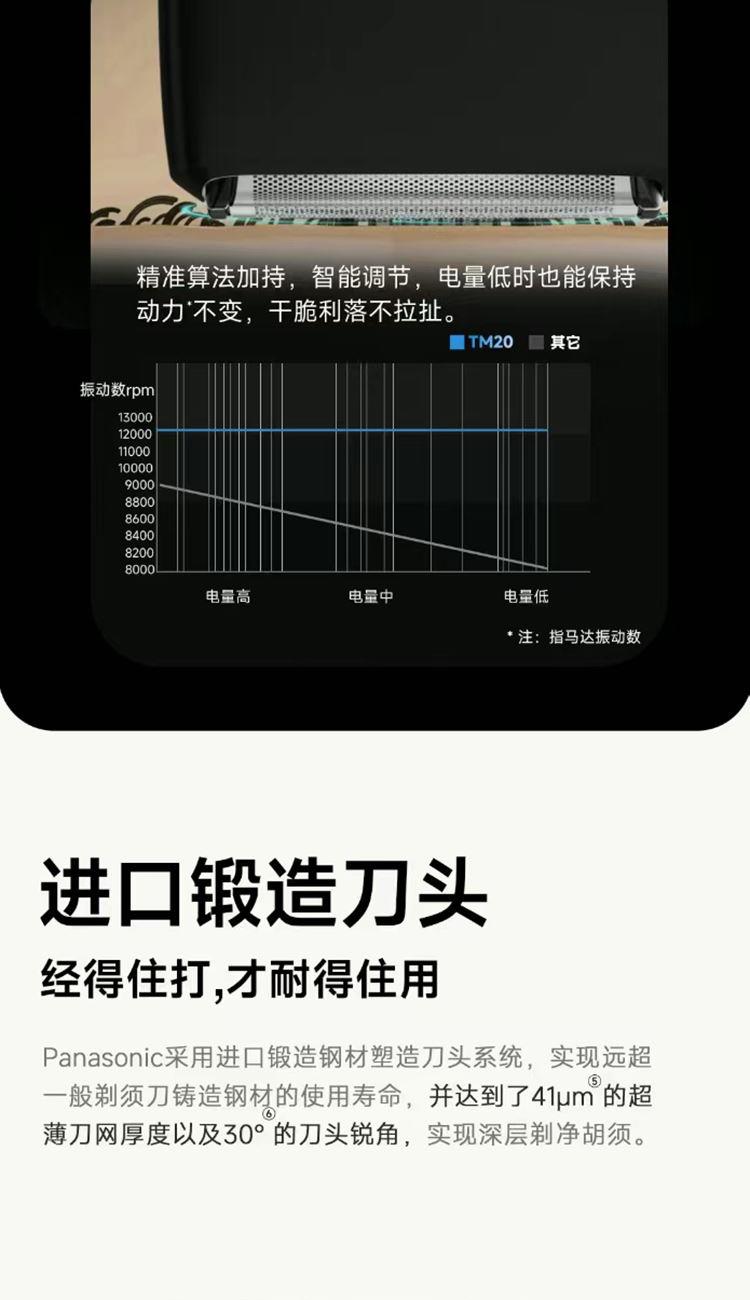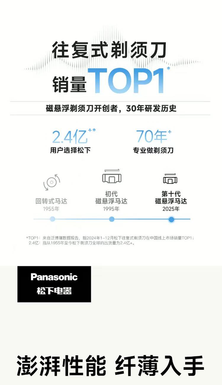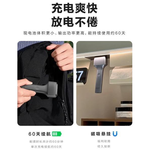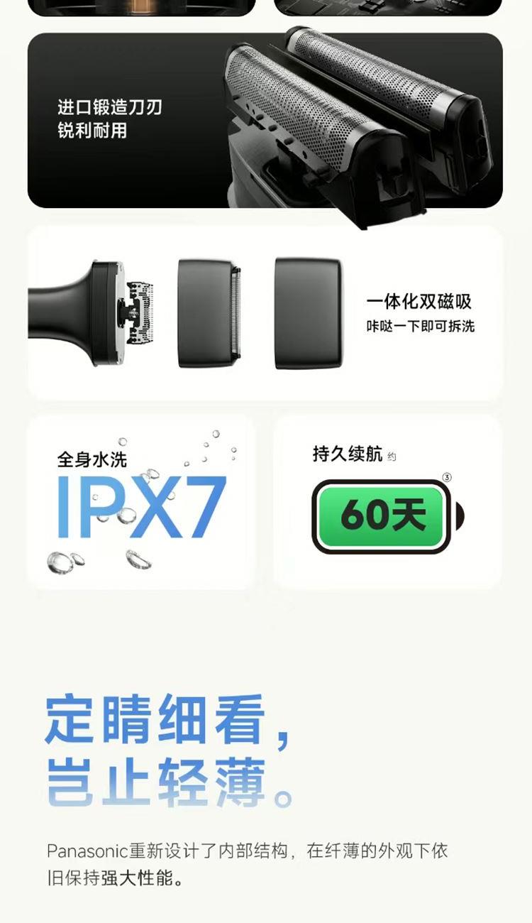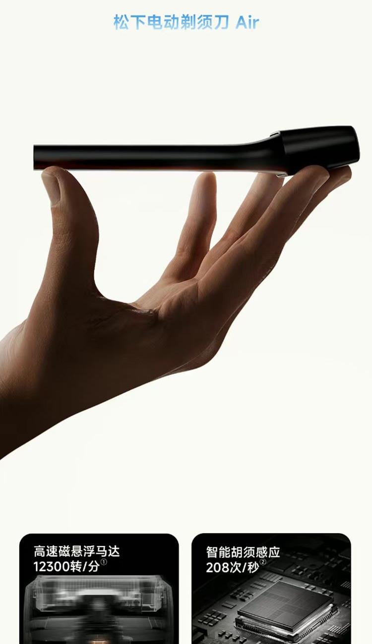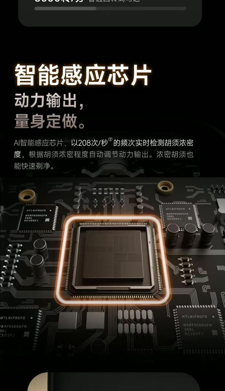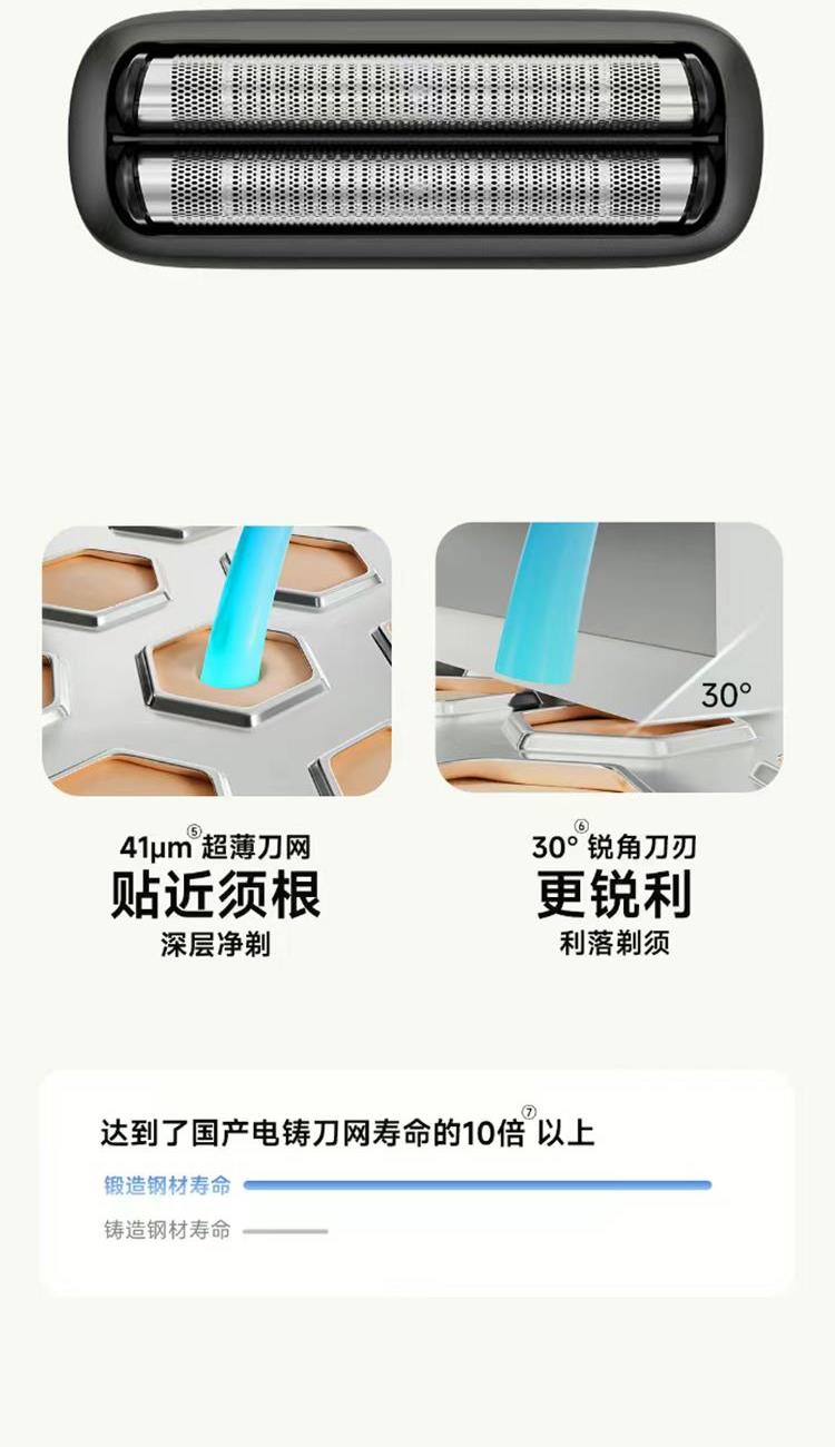 澎湃性能,纤薄入手; 第十代自研磁悬浮马达; 智能感应芯片; 进口锻造刀头,实现深层剃净胡须; IPX7防水,水性,格外出众; 充电爽快,能持续使用约60天;