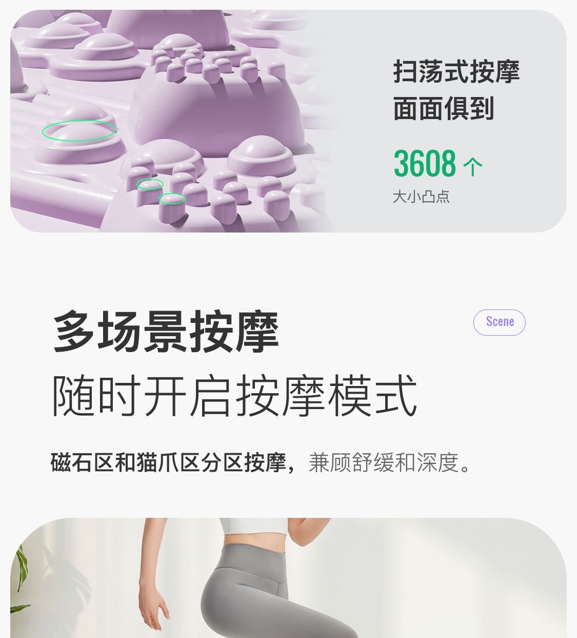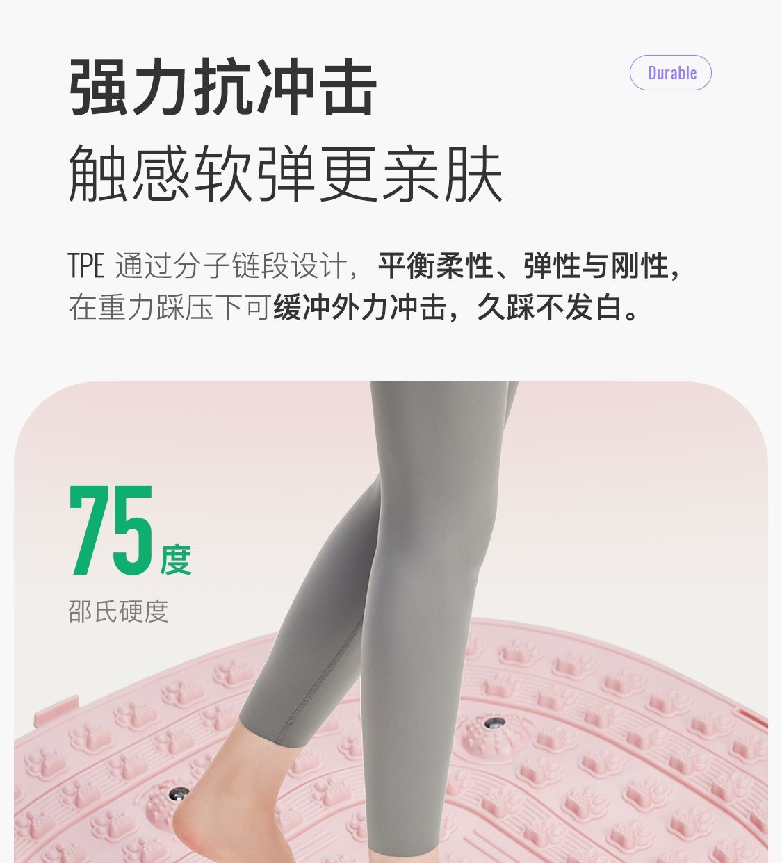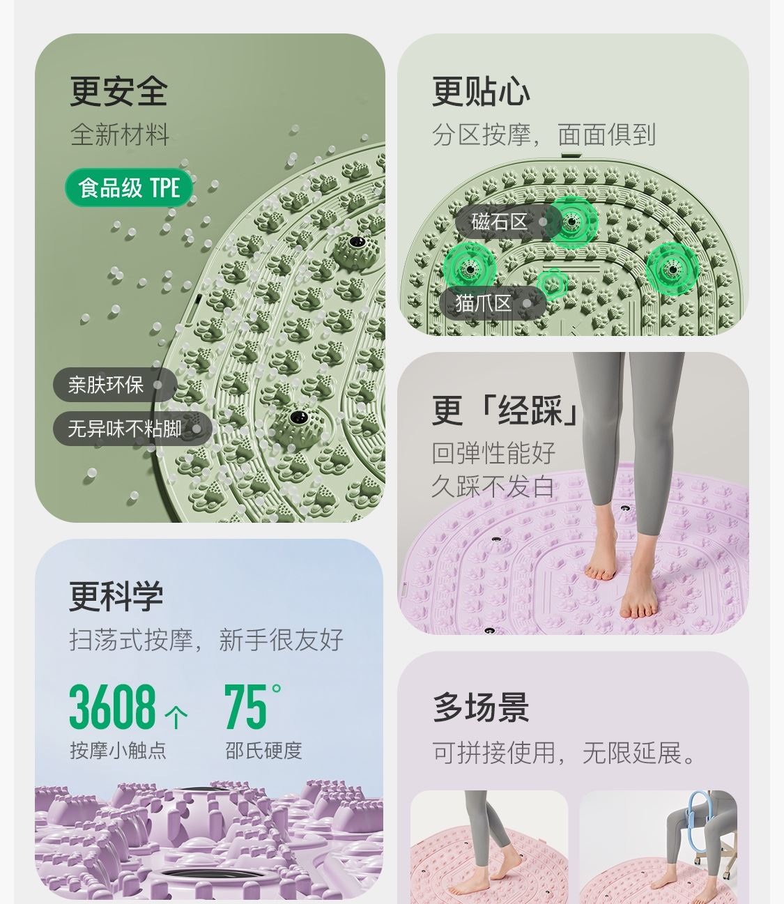 尺寸:41.5*41.5cm TPE环保无毒材质 方形圆角加大加密设计 仿「猫爪」设计 双分区多功能按摩 75°科学刺激硬度 支持无限串联拓展 加密按摩凸点 可做浴室防滑垫