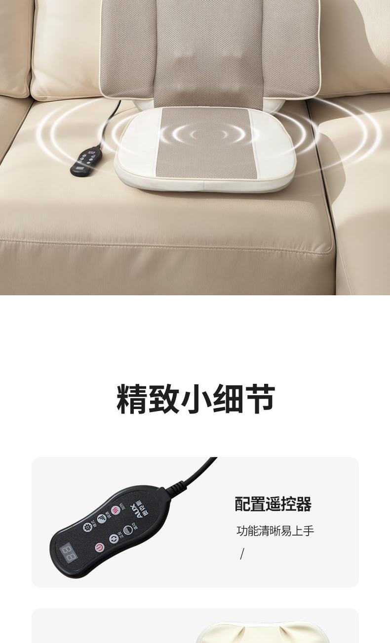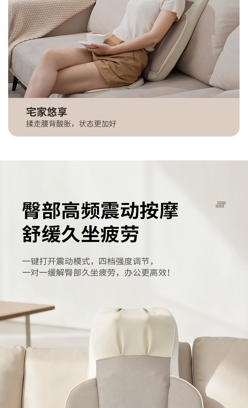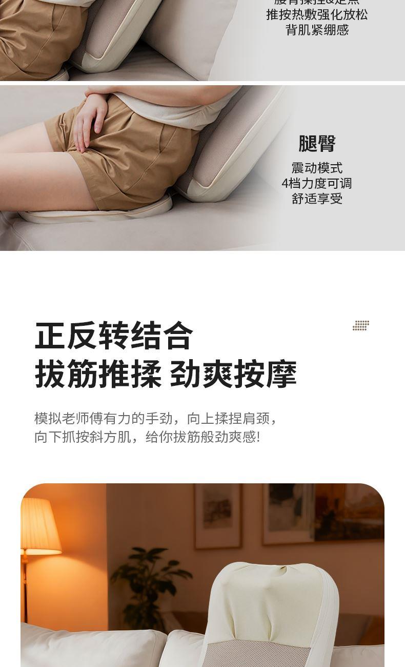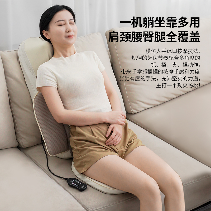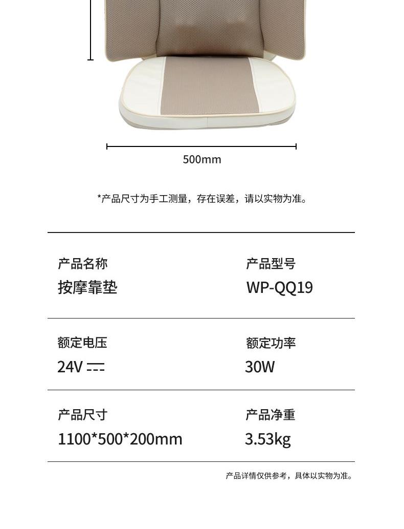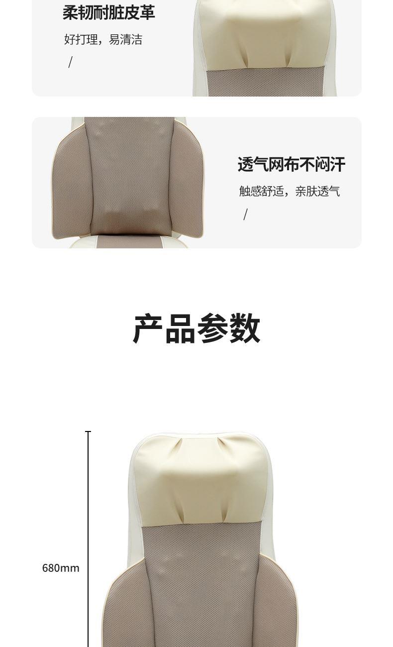 额定电压:24V 额定功率:30W 材 质:PU皮、弹性网 深度舒享按摩,升级体感、温感技术,大面积深度揉按 一机多用,物有所值,多方位合理支撑身体,贴合人体曲线 五种模式,有力按摩带来舒爽的按摩体验 三档加热,热敷融化僵硬感,深度缓解酸累肌群 一键启动,简洁面板,一目了然