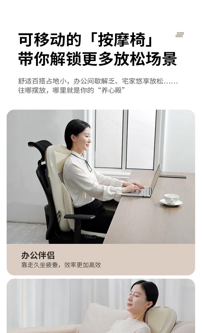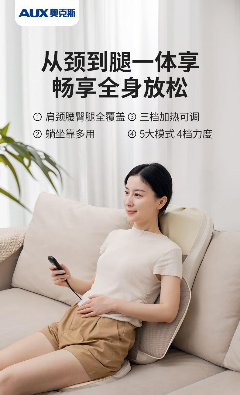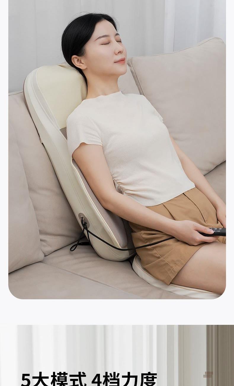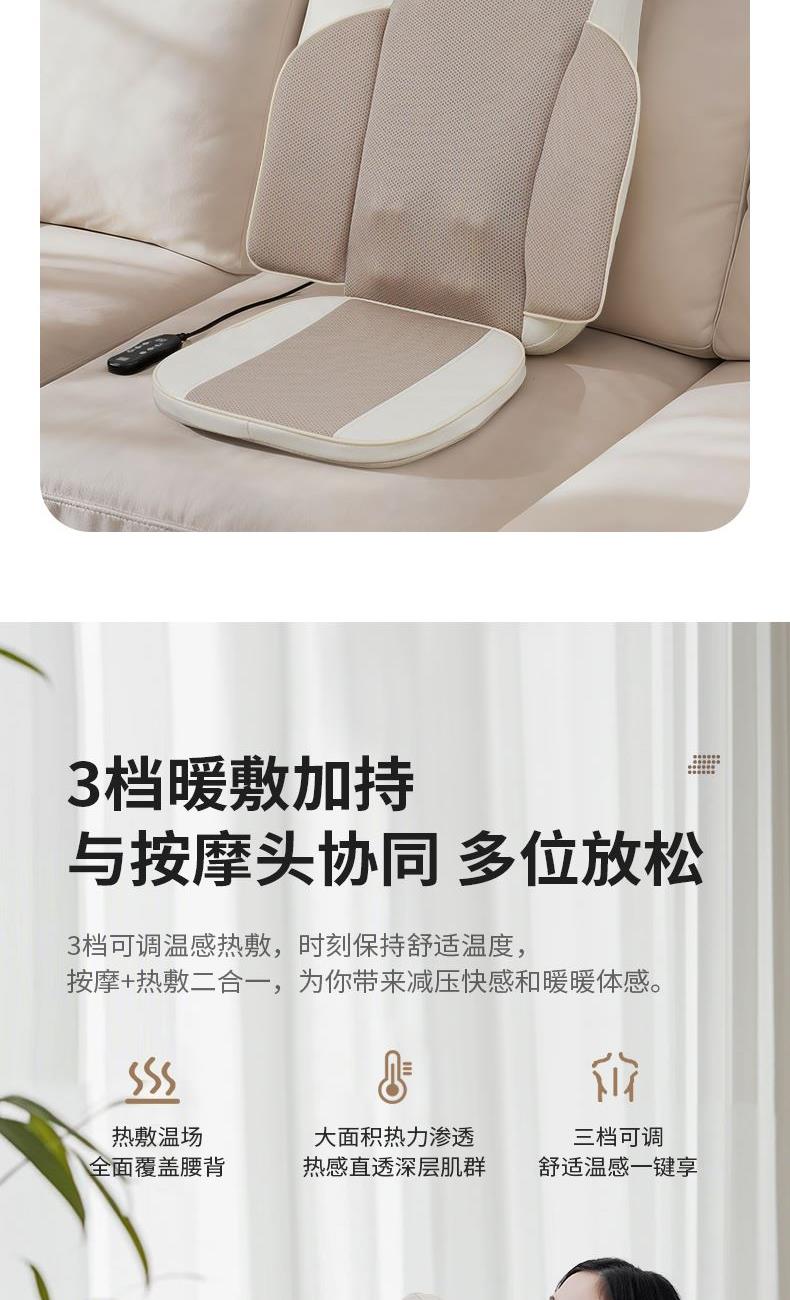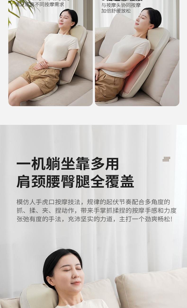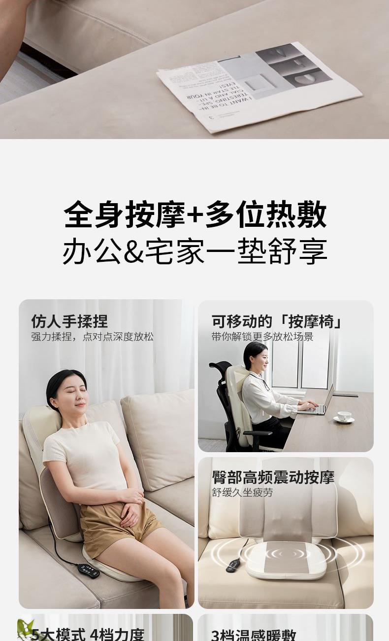 额定电压:24V 额定功率:30W 材 质:PU皮、弹性网 深度舒享按摩,升级体感、温感技术,大面积深度揉按 一机多用,物有所值,多方位合理支撑身体,贴合人体曲线 五种模式,有力按摩带来舒爽的按摩体验 三档加热,热敷融化僵硬感,深度缓解酸累肌群 一键启动,简洁面板,一目了然