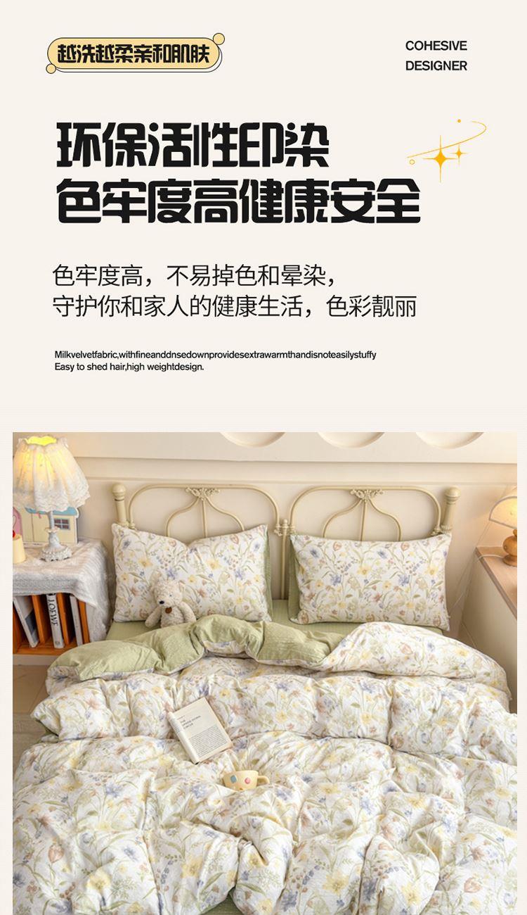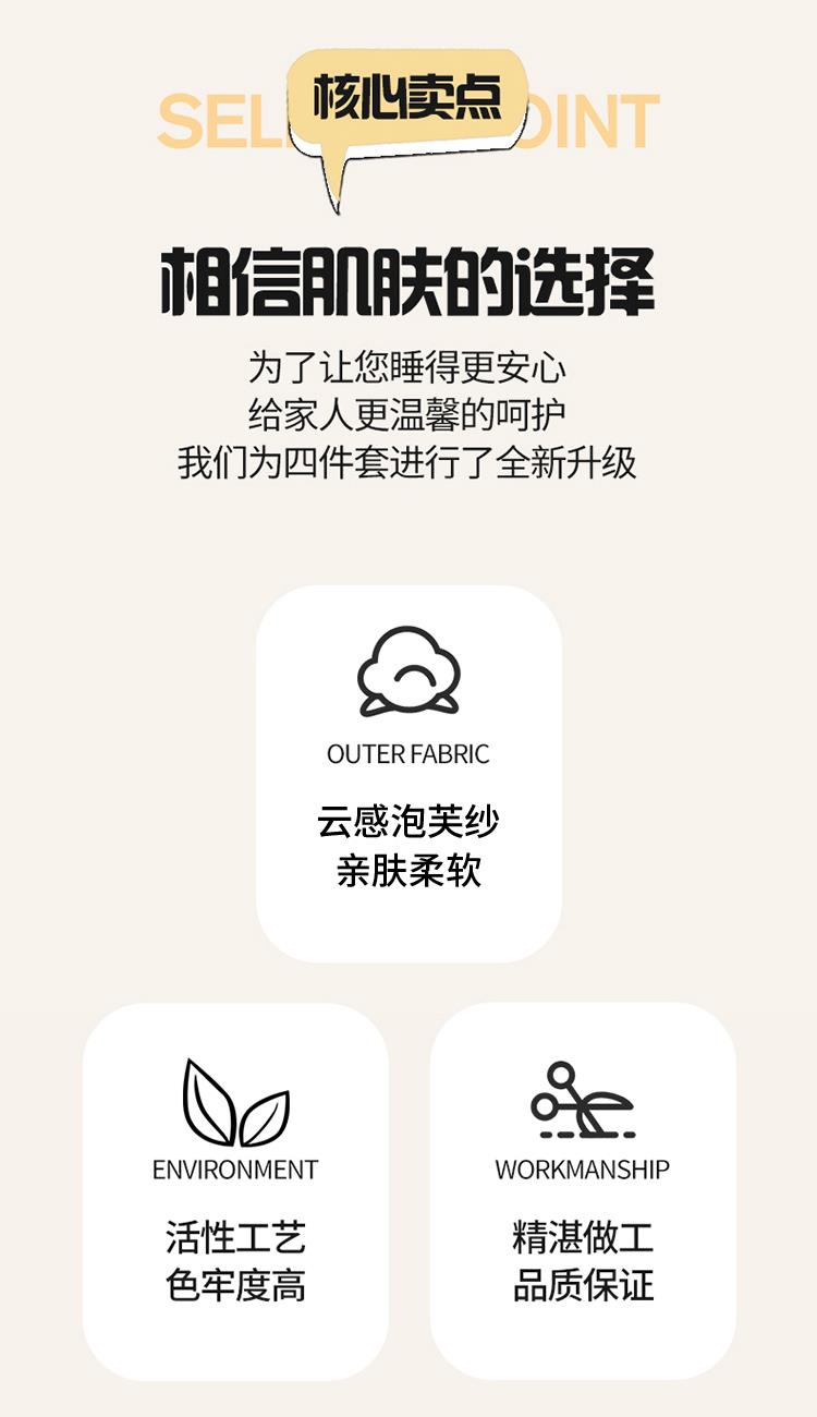 被套:200*230cm 床单:230*235cm 枕套:48*74cm*2 面料:泡芙棉 执行标准:GB/T22796-2021 安全类别:GB18401-2010 B类 1.面料采用生态亲肤棉,新型环保浆料活性印染,不褪色,不缩水,其生态环保理念在很大程度上满足了消费者对床品舒适度的高要。 2.生态棉面料,手感柔软,舒适质感丰厚,而且有厚重感,容易打理。整体套件,色彩丰富自然,阵线细致密实,错落有序,更显档次。