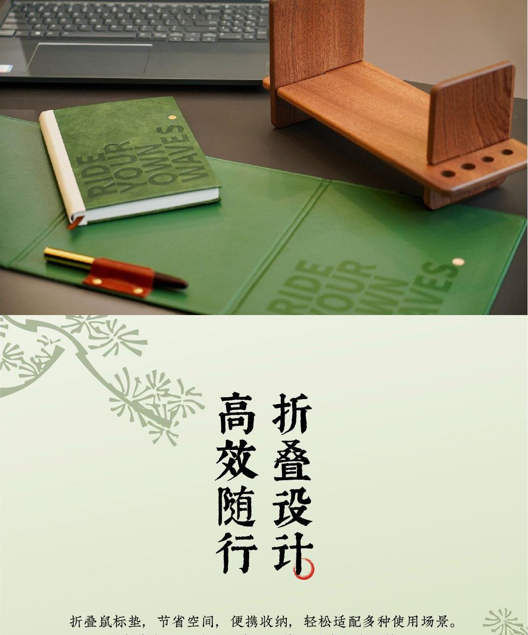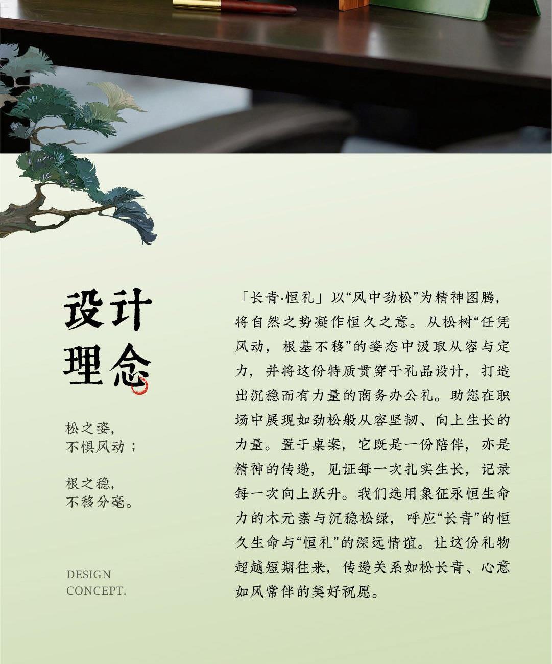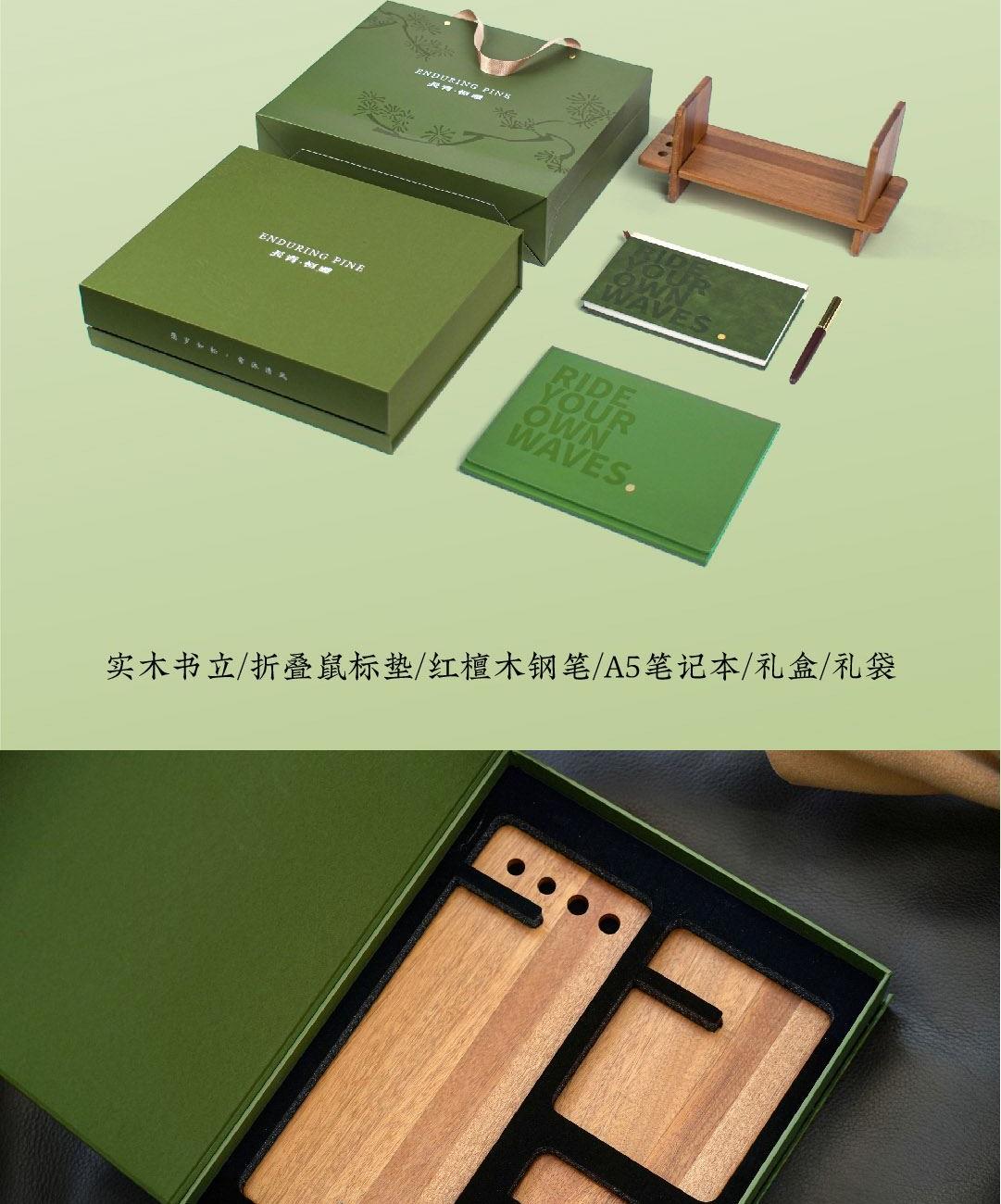 松之姿,不惧风动;根之稳,不移分毫。「长青·恒礼」以“风中劲松”为精神图腾,将自然之势凝作恒久之意。从松树“任凭风动,根基不移”的姿态中汲取从容与定力,并将这份特质贯穿于礼品设计,打造出沉稳而有力量的商务办公礼。助您在职场中展现如劲松般从容坚韧、向上生长的力量。置于桌案,它既是一份陪伴,亦是精神的传递,见证每一次扎实生长,记录每一次向上跃升。我们选用象征永恒生命力的木元素与沉稳松绿,呼应“长青”的恒久生命与“恒礼”的深远情谊。让这份礼物超越短期往来,传递关系如松长青、心意如风常伴的美好祝愿。 材质 / Material 红檀木 沙比利木 皮革 规格 / Size 礼盒:37*29*8cm 礼袋:38.5*32.5*9.4cm 实木书立:30*15*12cm(组装后) 折叠鼠标垫:25*20cm 展开长度:25*60cm A5笔记本:21*14.8cm 红檀木钢笔:14*φ1.2cm
