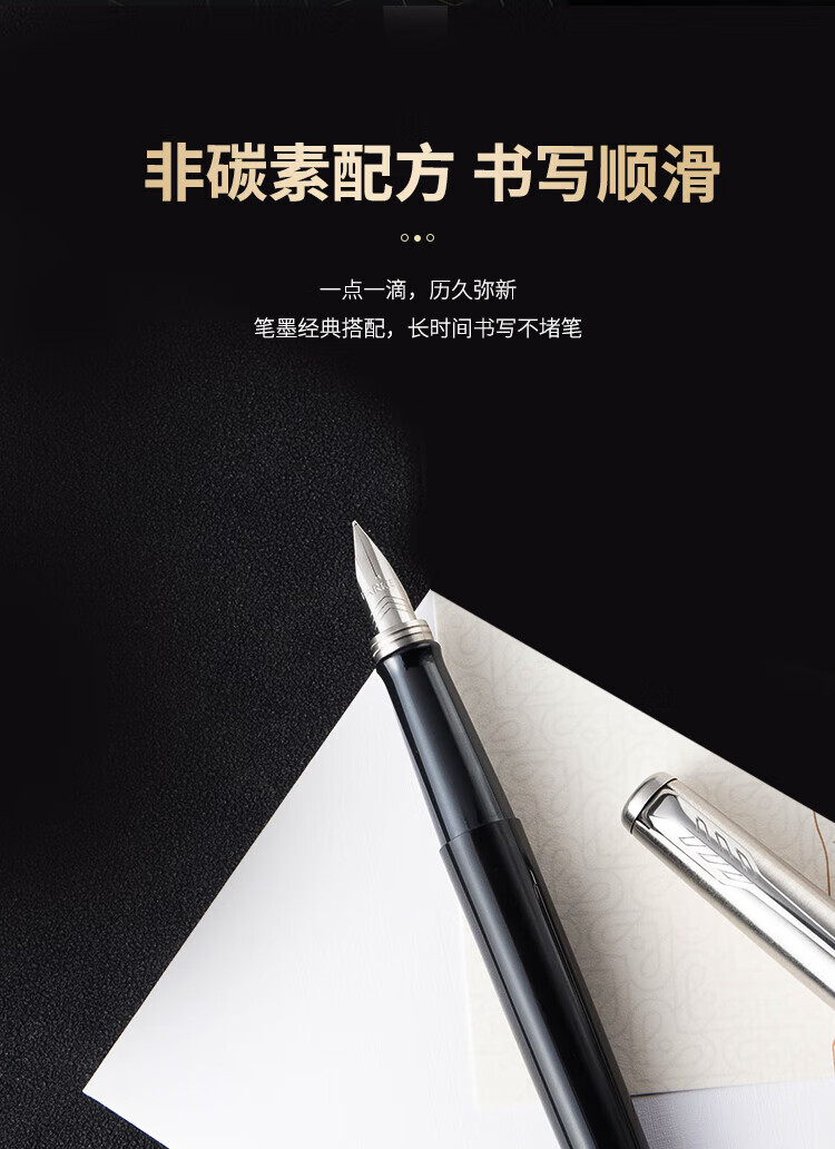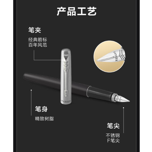 [规格] 笔长128mm 直径10mm [粗细] F尖 [笔尖] 不锈钢笔尖 [材质] 树脂材质笔身,不锈钢笔夹 [配置] 笔、墨水、保修卡、使用说明书、派克手提袋、礼盒 特点 1、笔帽雕刻派克LOGO; 2、不锈钢笔尖雕刻派克LOGO; 3、树脂材质笔身; 4、金色笔冠,商务伙伴。