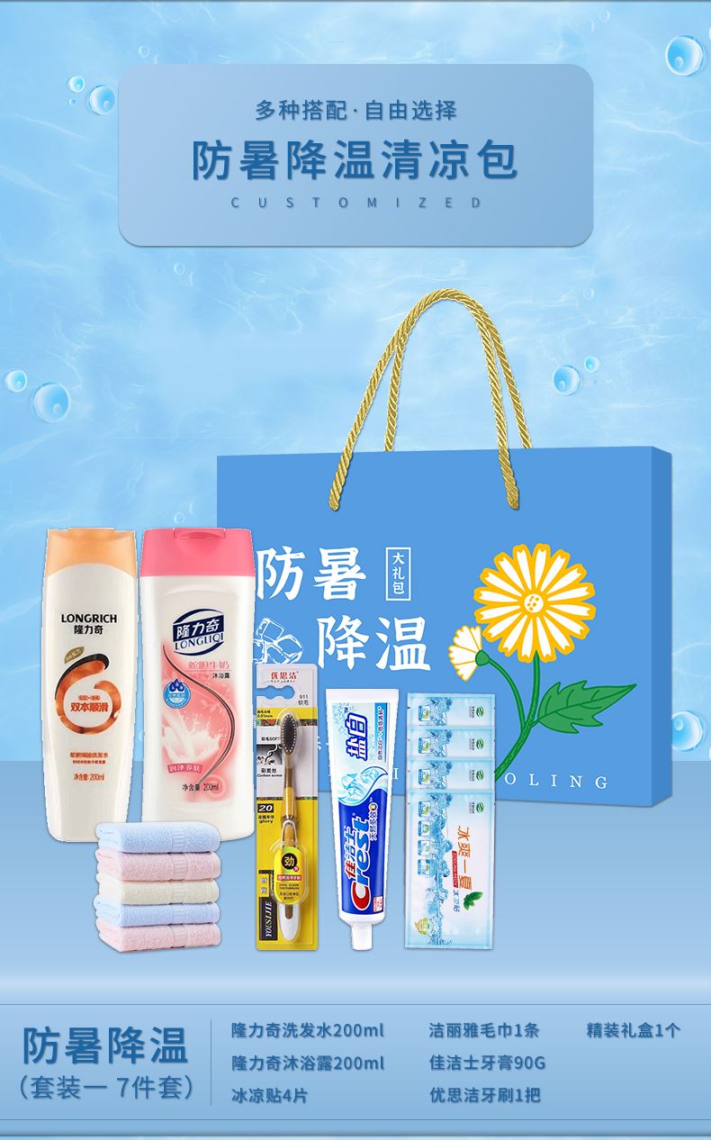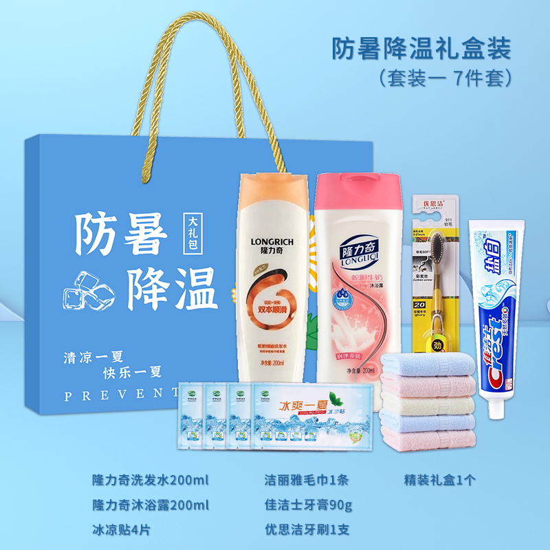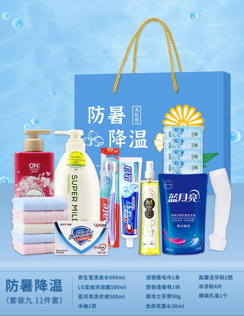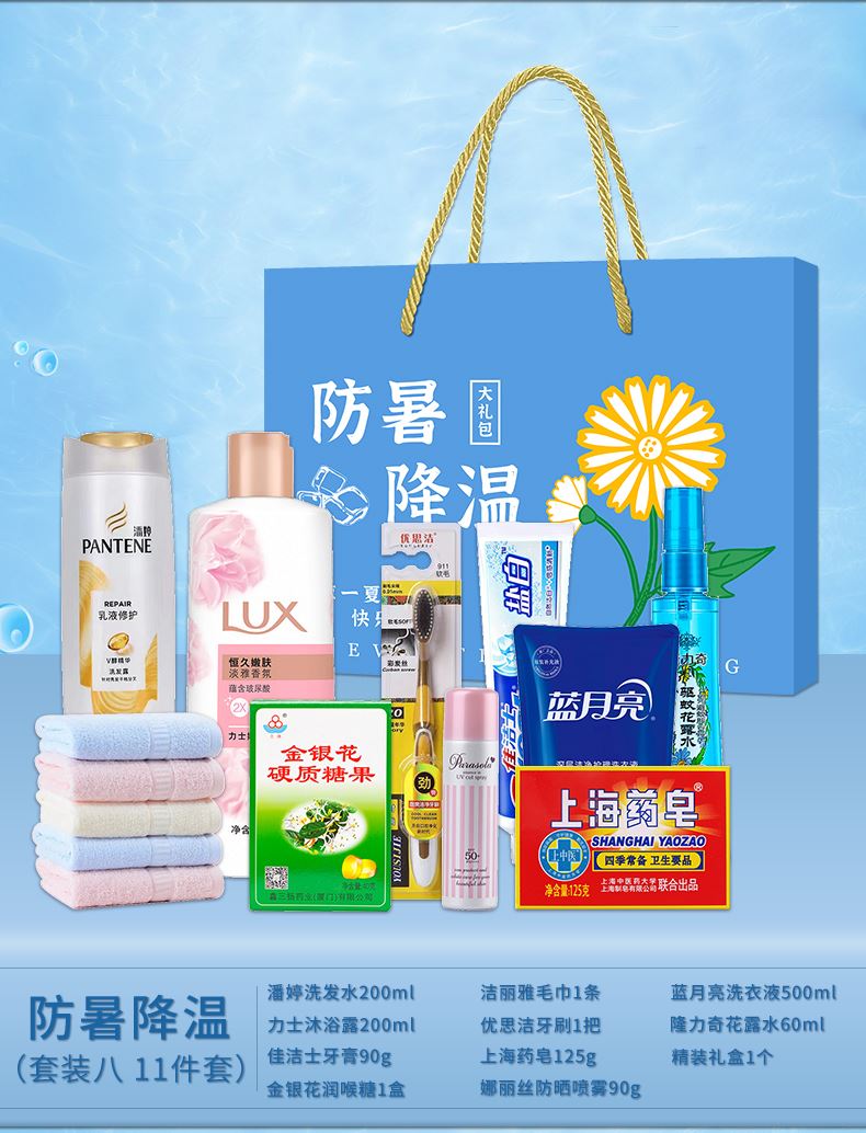 1.注:商城报价对应首张主图款式! 其他套装参考细节图,费用另计! 2. 咨询下单请备注好产品信息! 3.首图款式产品明细:防暑降温礼盒装(套装二 10件套):隆力奇洗发水200ml,冷感毛巾1条,冰袖1双,精装礼盒1个,六神沐浴露200ml,荆虎风油精1瓶,冰凉贴4片,优思洁牙刷1支,荆虎清凉油1个,金银花润喉糖1盒