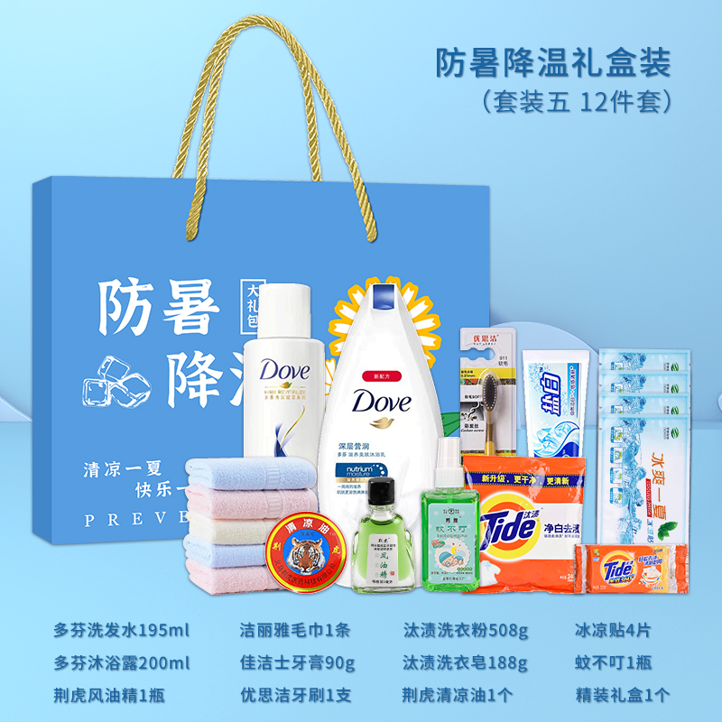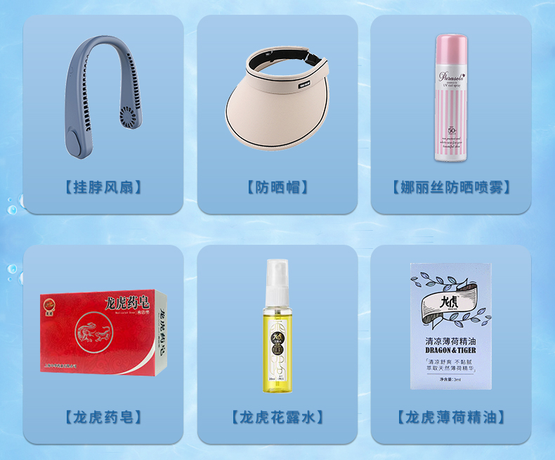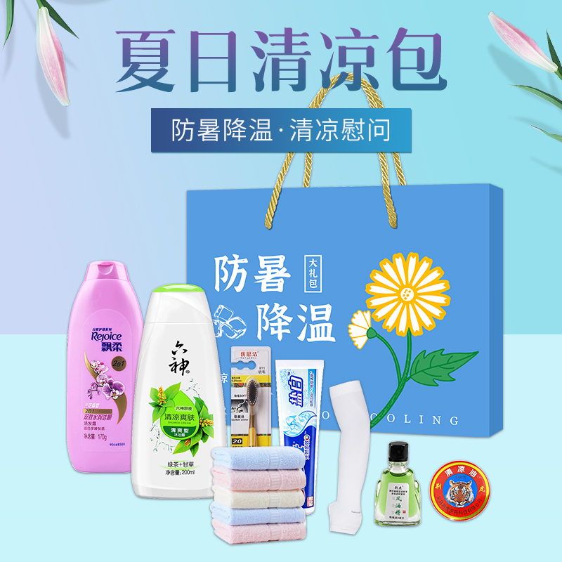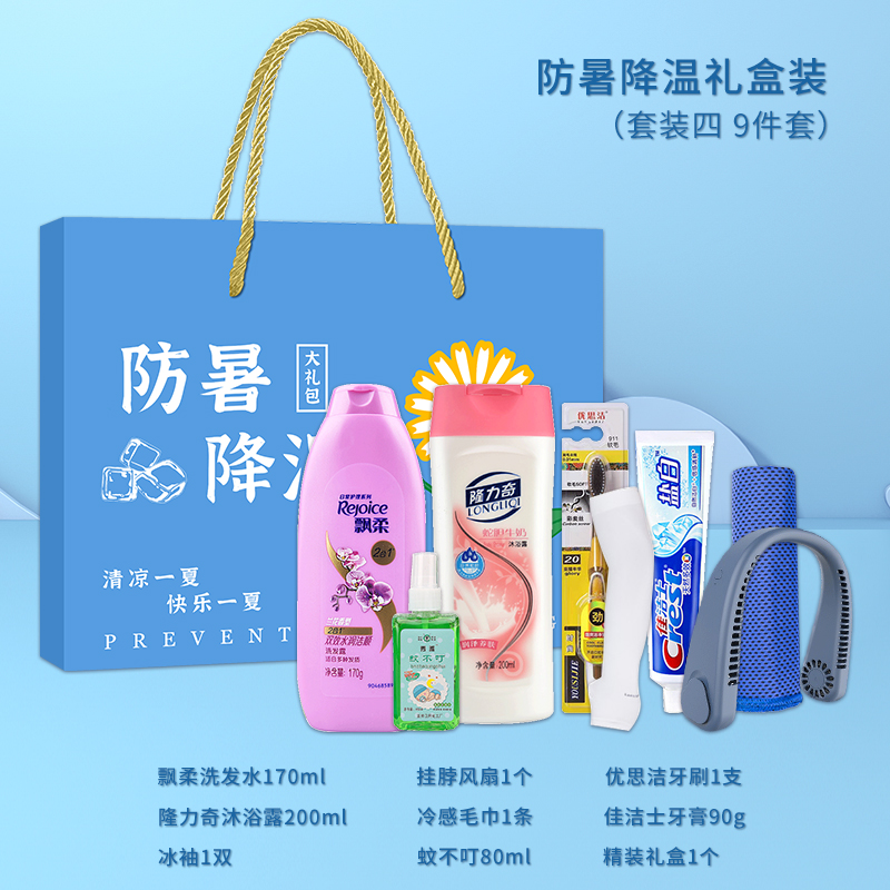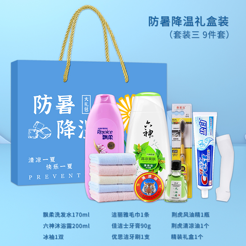 1.注:商城报价对应首张主图款式! 其他套装参考细节图,费用另计! 2. 咨询下单请备注好产品信息! 3.首图款式产品明细:防暑降温礼盒装(套装二 10件套):隆力奇洗发水200ml,冷感毛巾1条,冰袖1双,精装礼盒1个,六神沐浴露200ml,荆虎风油精1瓶,冰凉贴4片,优思洁牙刷1支,荆虎清凉油1个,金银花润喉糖1盒