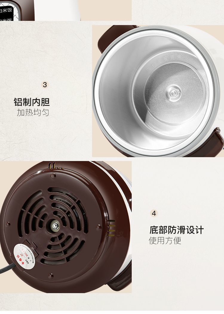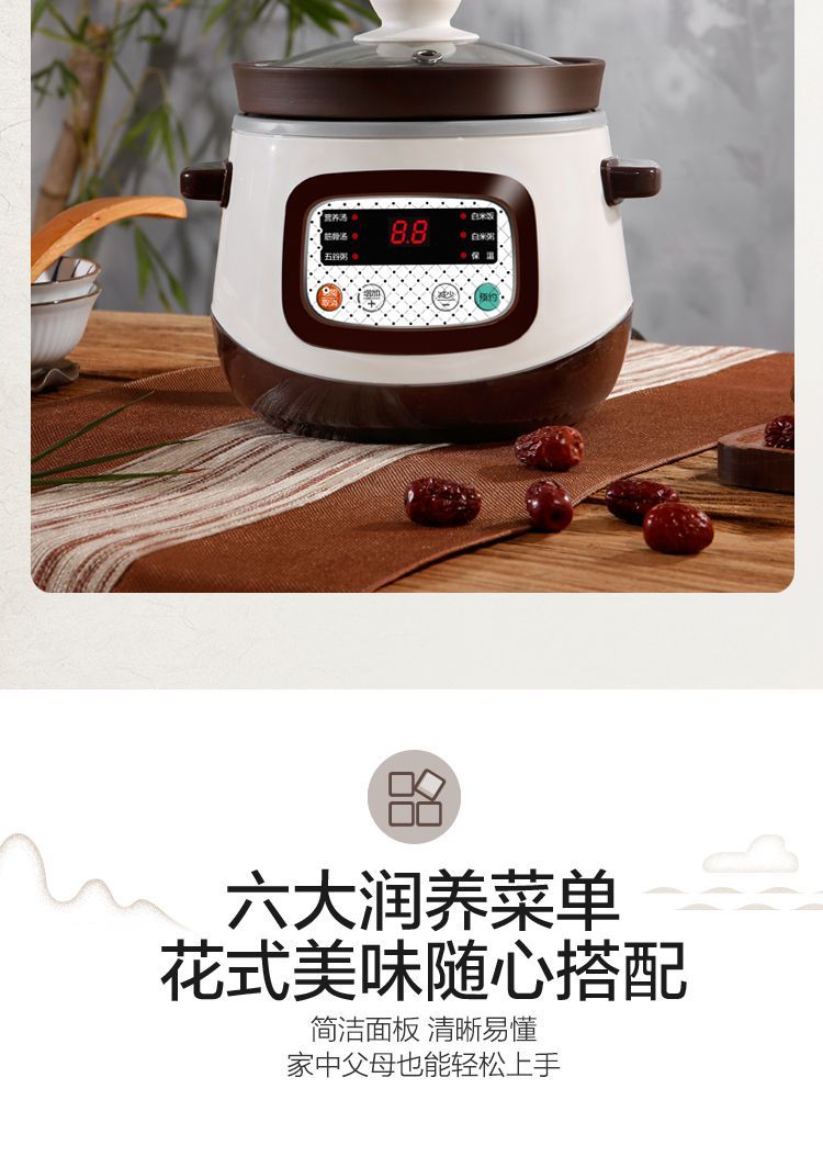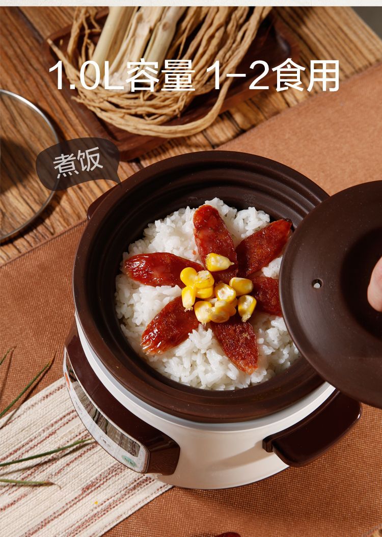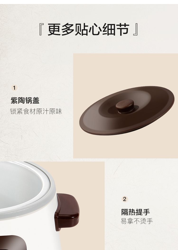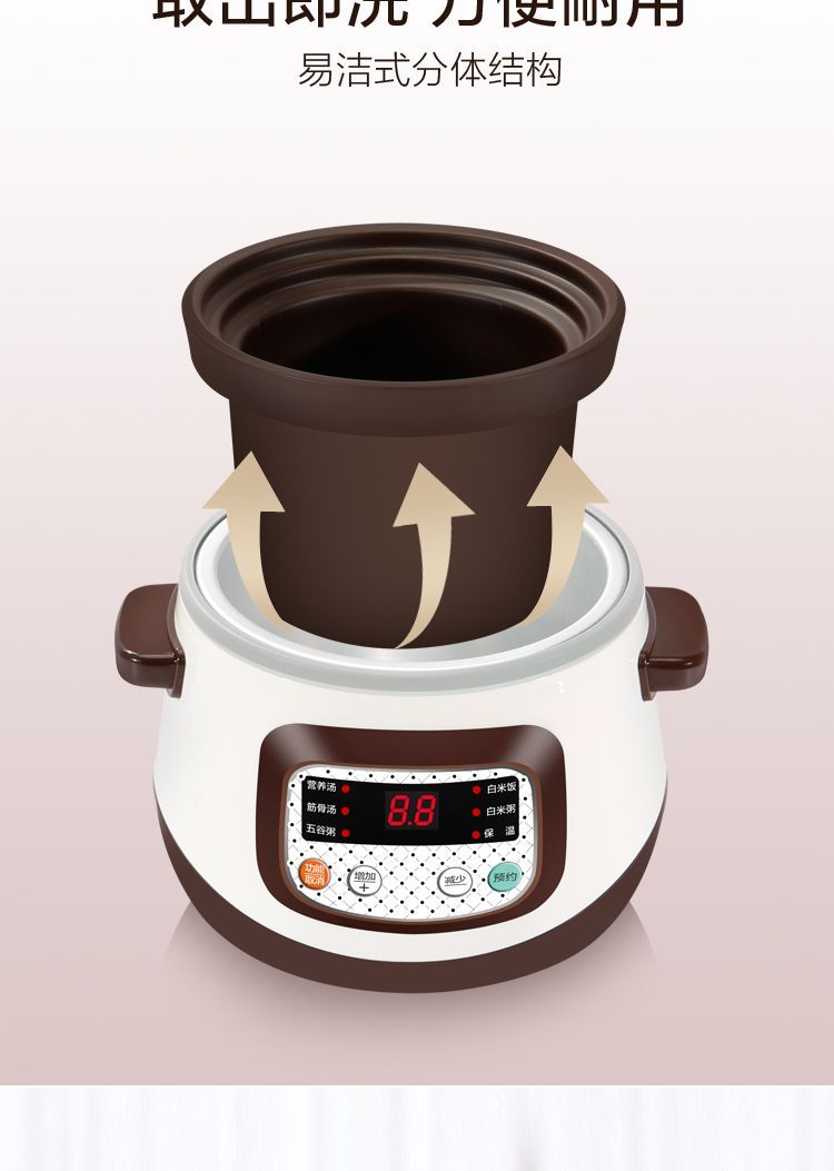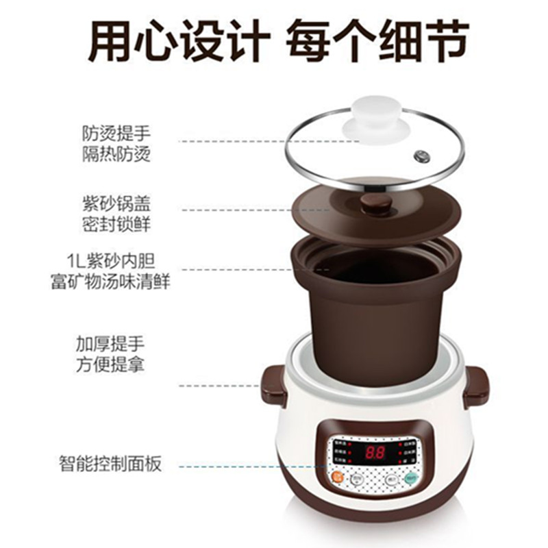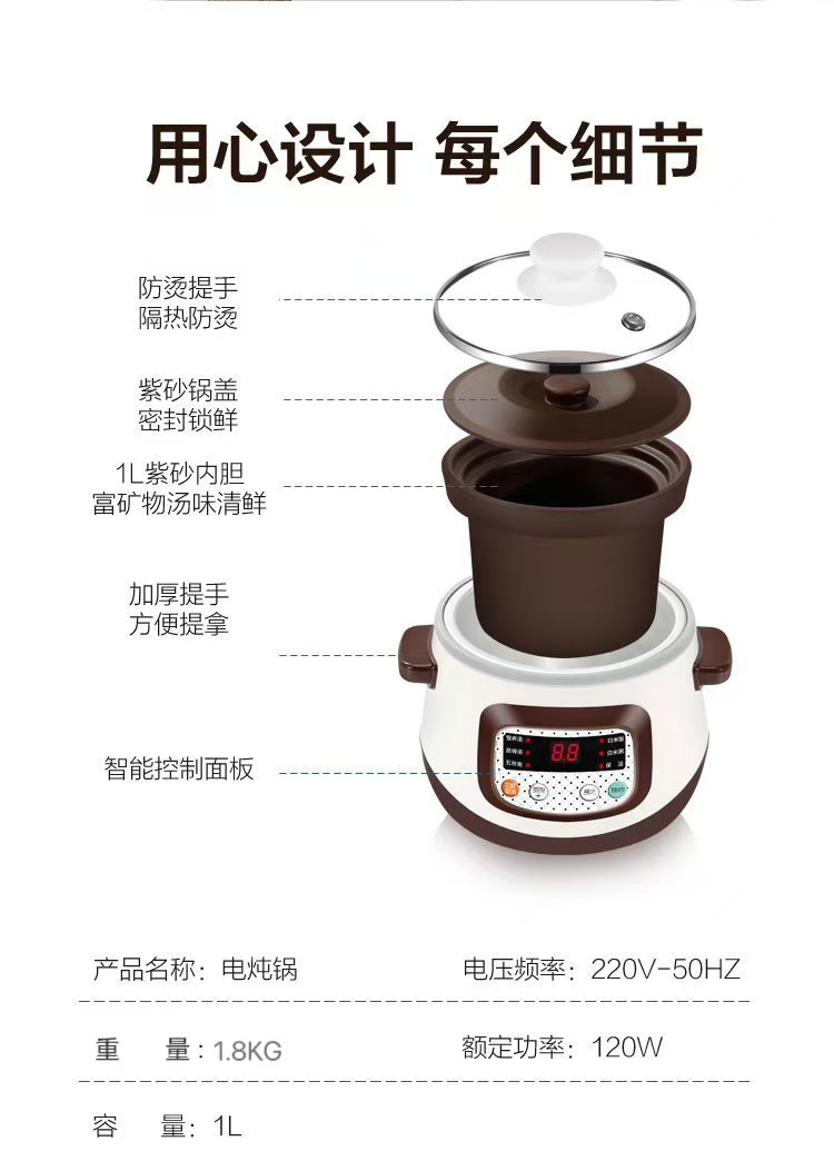额定功率:120W 额定电压:220V 产品颜色:紫砂款本色 主机容量:1L 产品款式:微电脑智能 包装清单:主机、透明盖、蒸格、电源线、说明书 特色功能 1、6大功能,可预约定时;智能免看管; 2、可视化锅盖,紫砂内胆,铝锅发热盘,导热快; 3、PP防烫把手,防止防烫双手; 4、自动断电,防干烧功能;一机多用; 5、箱装12台,代发网购,集采彩盒包装