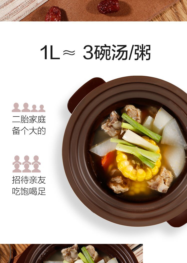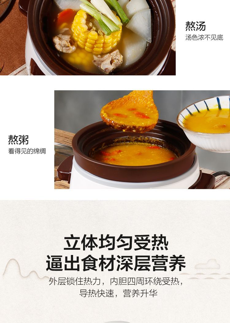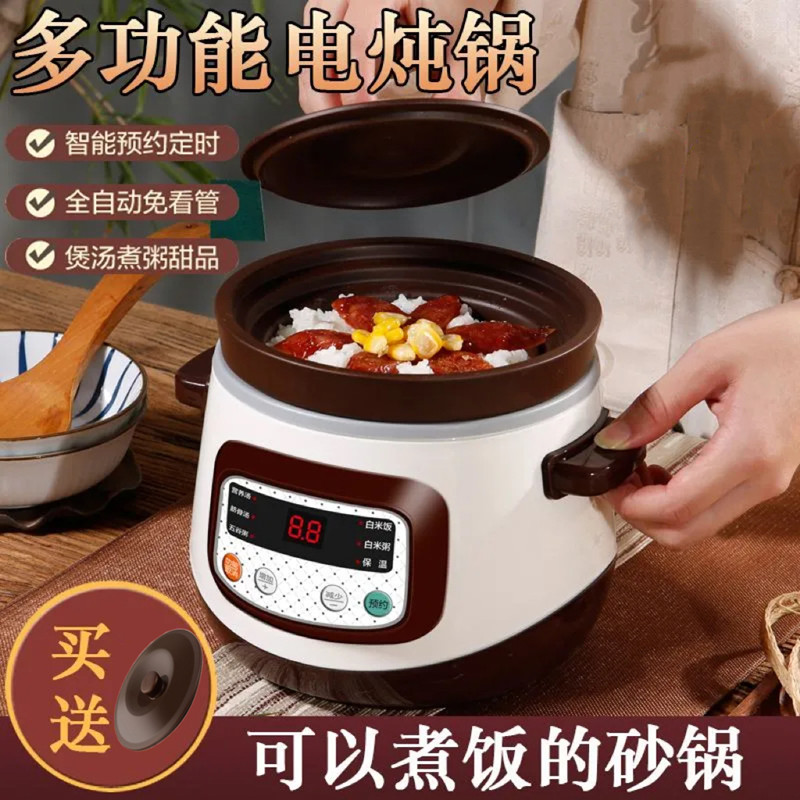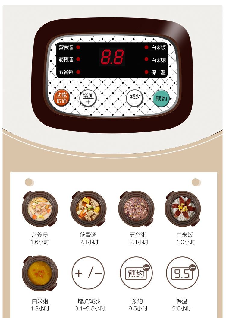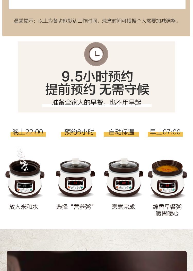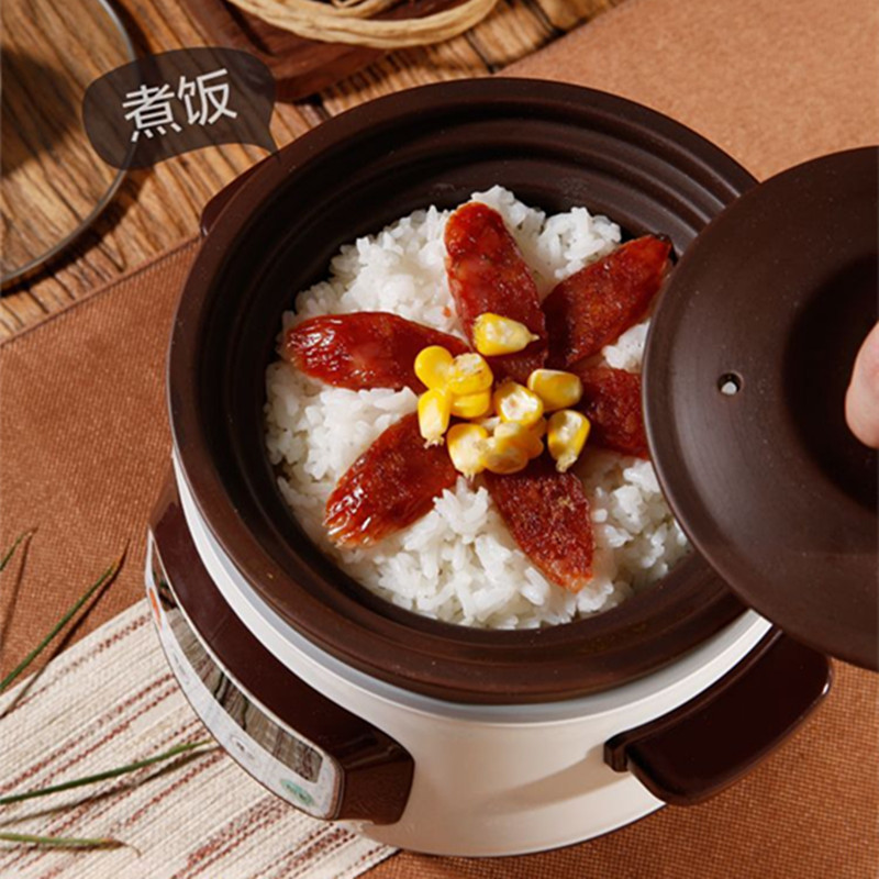 额定功率:120W 额定电压:220V 产品颜色:紫砂款本色 主机容量:1L 产品款式:微电脑智能 包装清单:主机、透明盖、蒸格、电源线、说明书 特色功能 1、6大功能,可预约定时;智能免看管; 2、可视化锅盖,紫砂内胆,铝锅发热盘,导热快; 3、PP防烫把手,防止防烫双手; 4、自动断电,防干烧功能;一机多用; 5、箱装12台,代发网购,集采彩盒包装