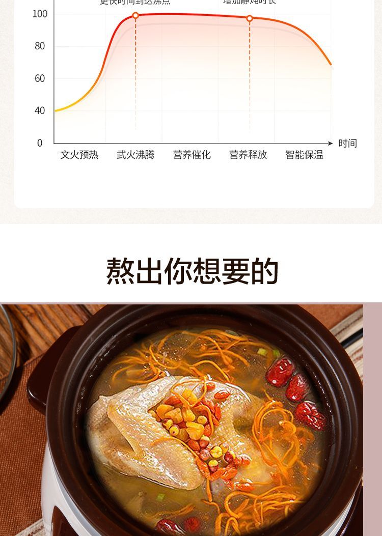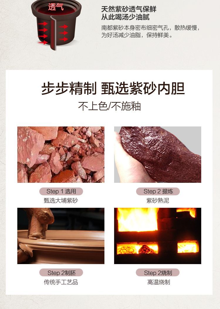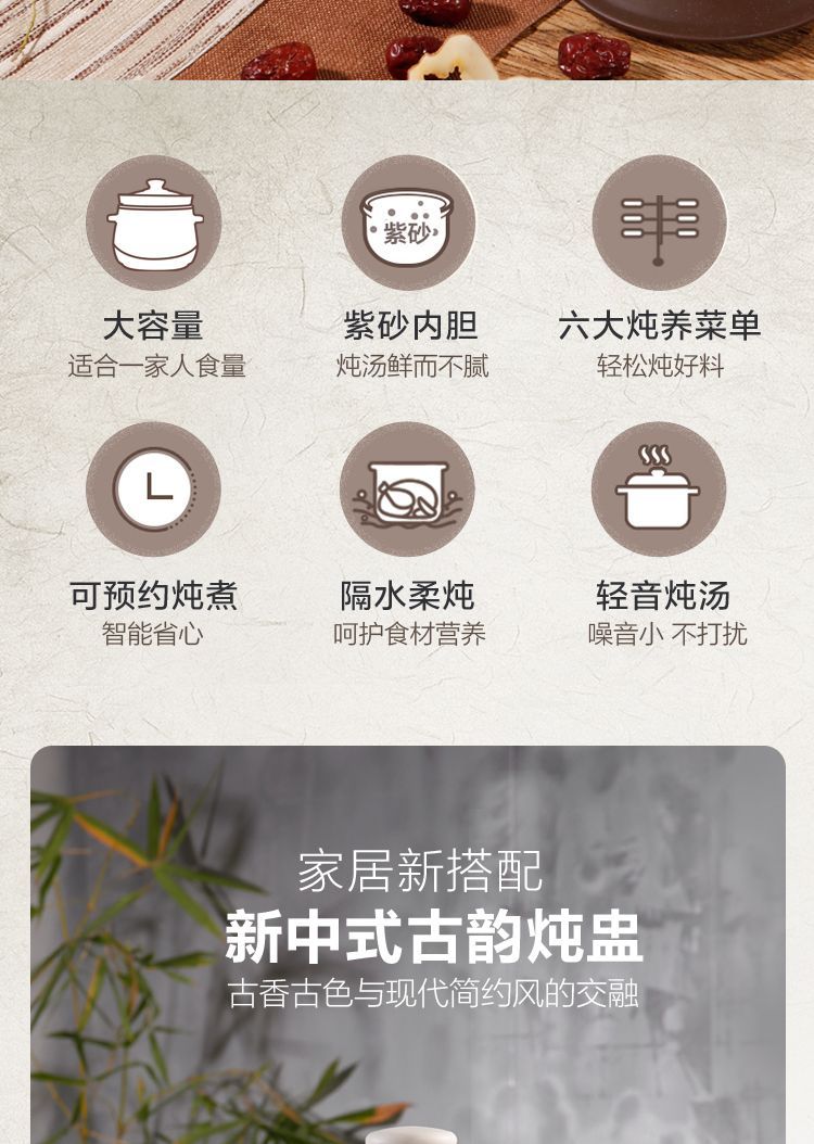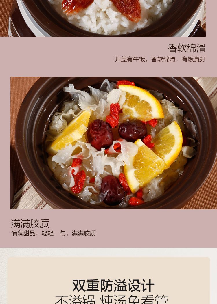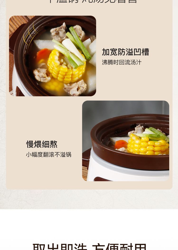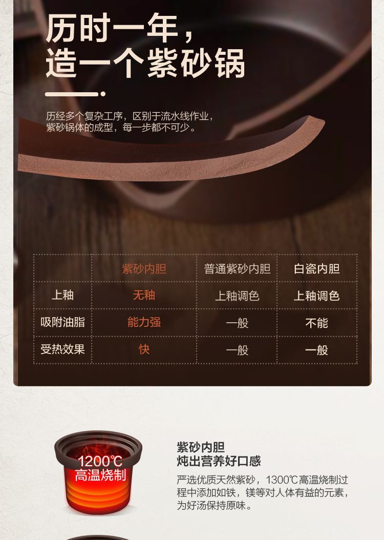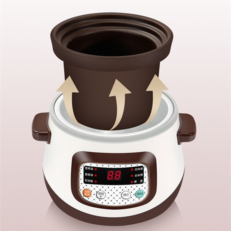 额定功率:120W 额定电压:220V 产品颜色:紫砂款本色 主机容量:1L 产品款式:微电脑智能 包装清单:主机、透明盖、蒸格、电源线、说明书 特色功能 1、6大功能,可预约定时;智能免看管; 2、可视化锅盖,紫砂内胆,铝锅发热盘,导热快; 3、PP防烫把手,防止防烫双手; 4、自动断电,防干烧功能;一机多用; 5、箱装12台,代发网购,集采彩盒包装