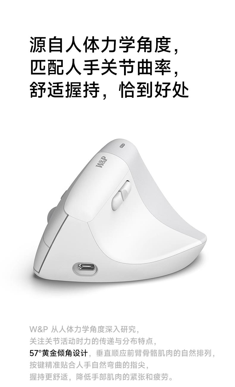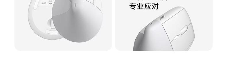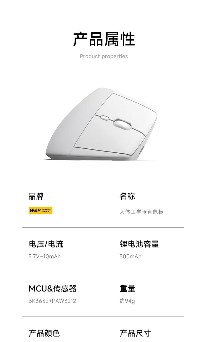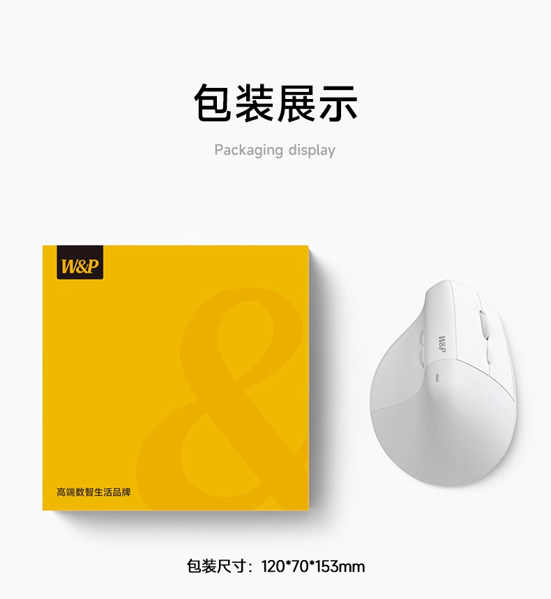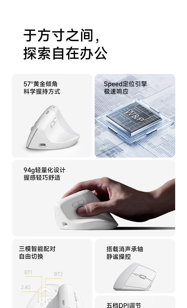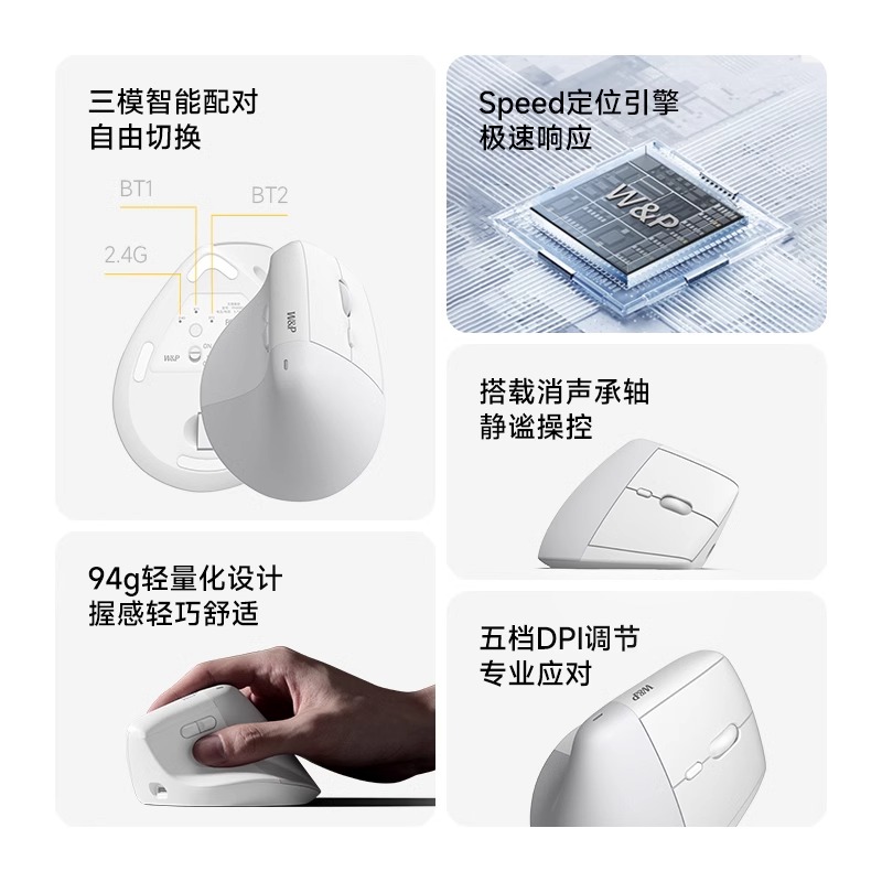 产品型号:PMWB04 产品尺寸:66*111*83mm 产品重量:约94g W&P三模无线鼠标,科技赋能移动生活; DPI自定义调节,五档预设,操控灵活; 57°黄金倾角设计,垂直顺应前臂骨骼肌肉,降低手部肌肉的疲劳; Speed 极速定位引擎,敏捷捕捉,瞬间响应; 94g轻量化设计握感轻巧舒适; 三模智能配对,无线自由,灵活切换; 兼容多设备,跨端轻松办公。