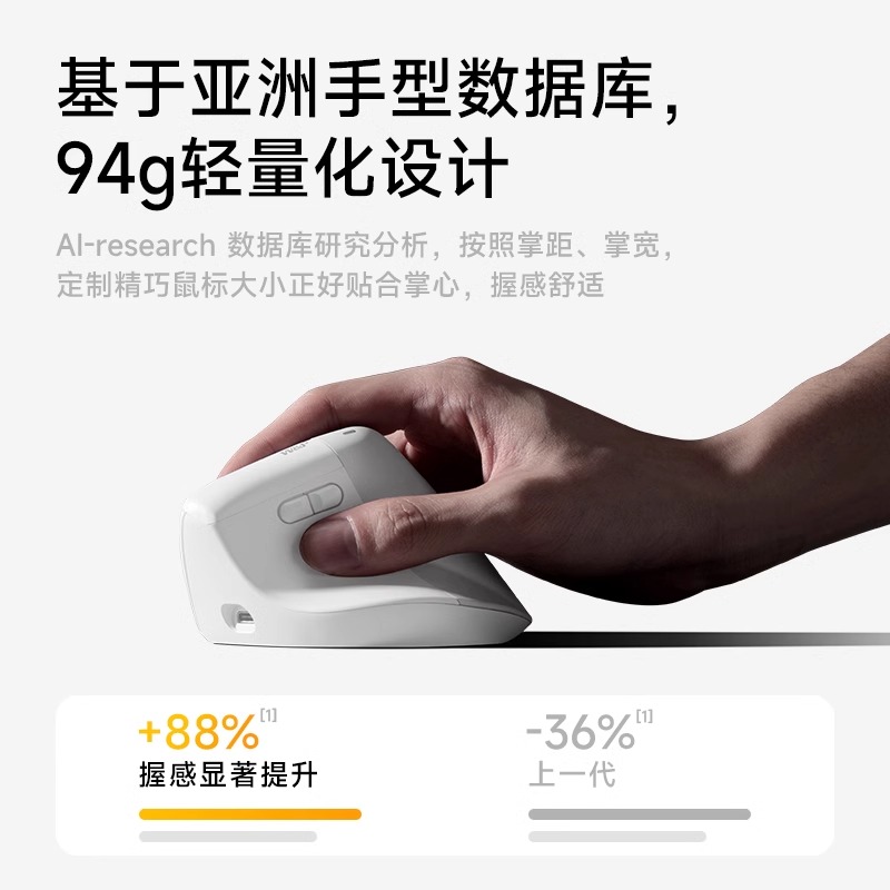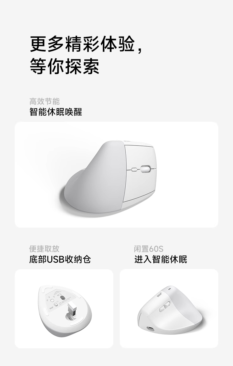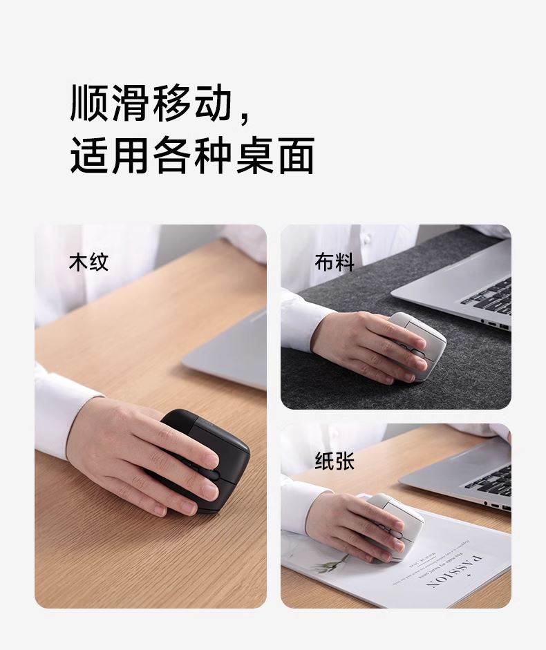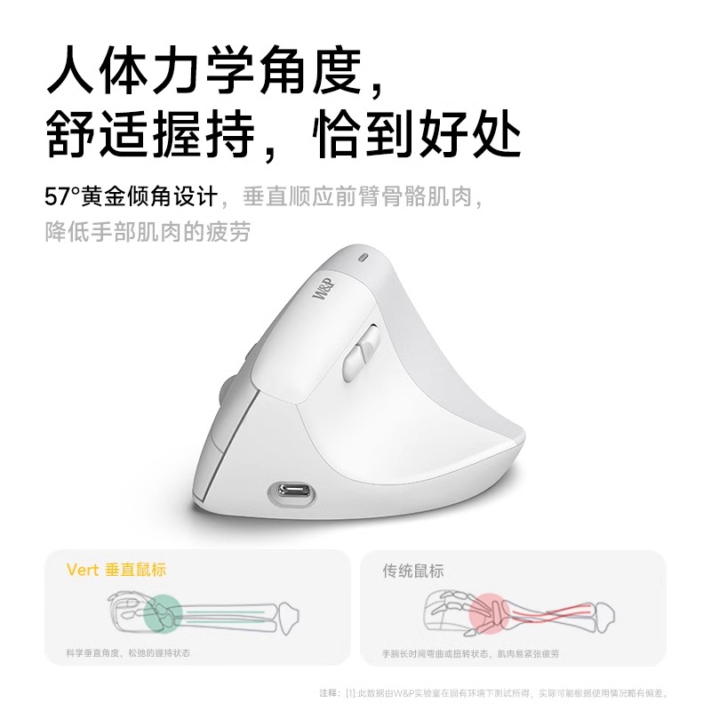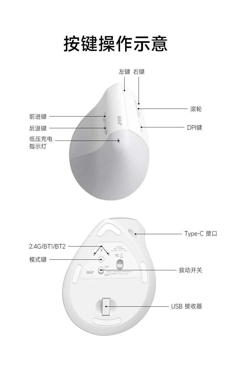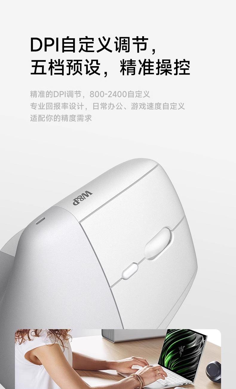产品型号:PMWB04 产品尺寸:66*111*83mm 产品重量:约94g W&P三模无线鼠标,科技赋能移动生活; DPI自定义调节,五档预设,操控灵活; 57°黄金倾角设计,垂直顺应前臂骨骼肌肉,降低手部肌肉的疲劳; Speed 极速定位引擎,敏捷捕捉,瞬间响应; 94g轻量化设计握感轻巧舒适; 三模智能配对,无线自由,灵活切换; 兼容多设备,跨端轻松办公。