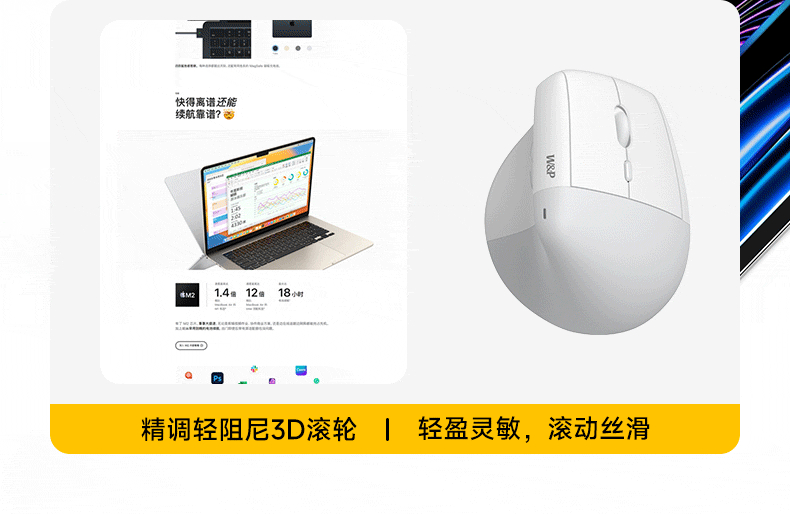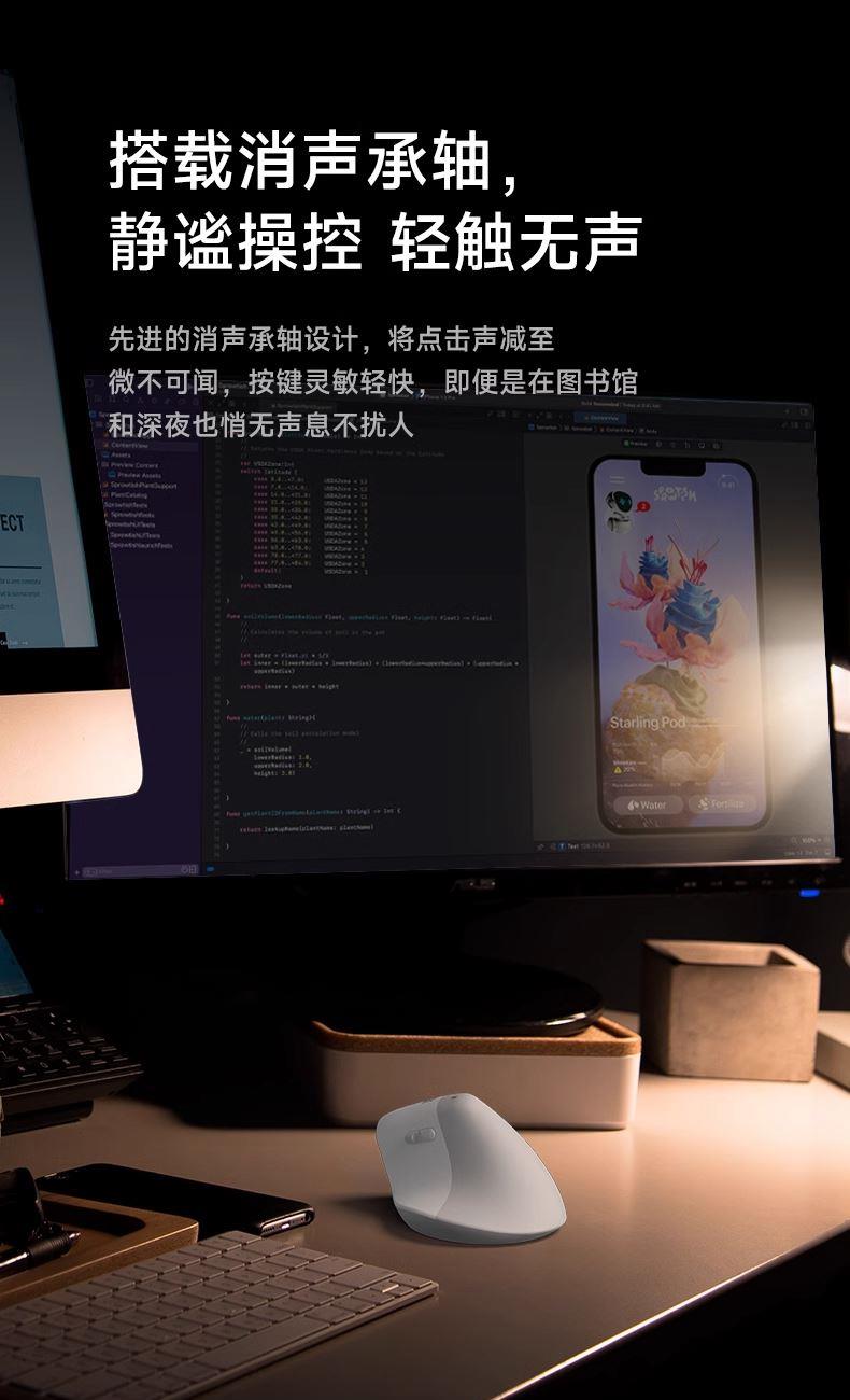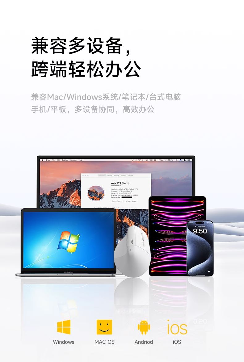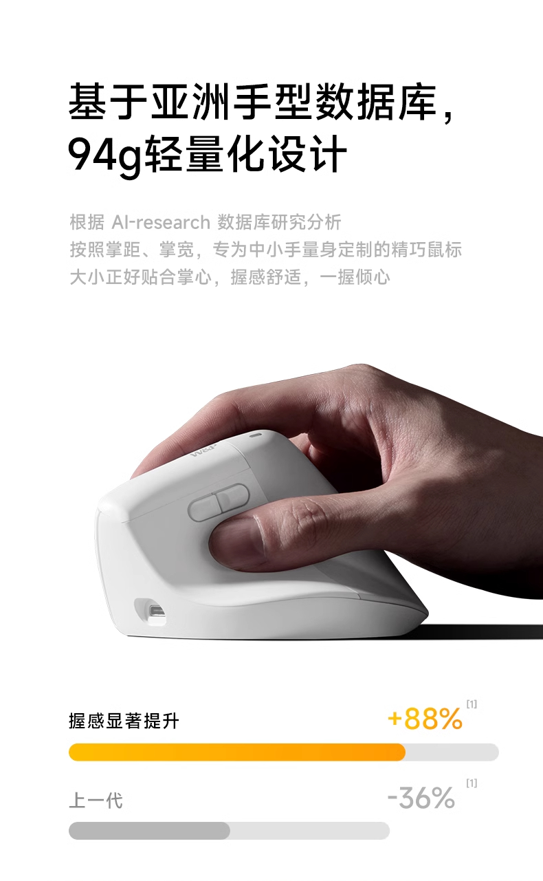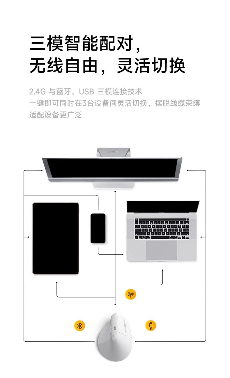 产品型号:PMWB04 产品尺寸:66*111*83mm 产品重量:约94g W&P三模无线鼠标,科技赋能移动生活; DPI自定义调节,五档预设,操控灵活; 57°黄金倾角设计,垂直顺应前臂骨骼肌肉,降低手部肌肉的疲劳; Speed 极速定位引擎,敏捷捕捉,瞬间响应; 94g轻量化设计握感轻巧舒适; 三模智能配对,无线自由,灵活切换; 兼容多设备,跨端轻松办公。